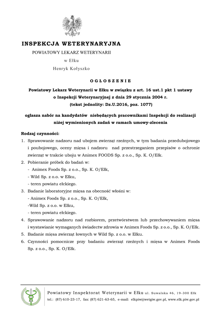 INSPEKCJA WETERYNARYJNA POWIATOWY LEKARZ WETERYNARII w Ełku Henryk Koł yszko OGŁOSZENIE Powiatowy Lekarz Weterynarii w Ełku w związku z art. 16 ust.1 pkt 1 ustawy o Inspekcji Weterynaryjnej z dnia 29 stycznia 2004 r. (tekst jednolity: Dz.U.2016, poz. 1077) ogłasza nabór na kandydatów niebędących pracownikami Inspekcji do realizacji niżej wymienionych zadań w ramach umowy-zlecenia Rodzaj czynności: 1. Sprawowanie nadzoru nad ubojem zwierząt rzeźnych, w tym badania przedubojowego i poubojowego, oceny mięsa i nadzoru nad przestrzeganiem przepisów o ochronie zwierząt w trakcie uboju w Animex FOODS Sp. z o.o., Sp. K. O/Ełk. 2. Pobieranie próbek do badań w: - Animex Foods Sp. z o.o., Sp. K. O/Ełk, - Wild Sp. z o.o. w Ełku, - teren powiatu ełckiego. 3. Badanie laboratoryjne mięsa na obecność włośni w: - Animex Foods Sp. z o.o., Sp. K. O/Ełk, -Wild Sp. z o.o. w Ełku, - teren powiatu ełckiego. 4. Sprawowanie nadzoru nad rozbiorem, przetwórstwem lub przechowywaniem mięsa i wystawianie wymaganych świadectw zdrowia w Animex Foods Sp. z o.o., Sp. K. O/Ełk. 5. Badanie mięsa zwierząt łownych w Wild Sp. z o.o. w Ełku. 6. Czynności pomocnicze przy badaniu zwierząt rzeźnych i mięsa w Animex Foods Sp. z o.o., Sp. K. O/Ełk. Powiatowy Inspektorat Weterynarii w Ełku u l . S u w a l s k a 4 6 , 1 9 - 3 0 0 Eł k tel.: (87) 610-23-17, fax: (87) 621-63-65, e-mail: [email protected], www.elk.piw.gov.pl Wymagania konieczne do wykonywania czynności o których mowa w pkt od 1 do 5: - wykształcenie wyższe weterynaryjne, - posiadanie kwalifikacji zgodnie z § 2 rozporządzeniem MRiRW z dnia 22 kwietnia 2004r. w sprawie zakresu czynności wykonywanych przez osoby niebędące pracownikami Inspekcji Weterynaryjnej oraz kwalifikacji tych osób (Dz. U. 2004 Nr 89 poz. 860 z późn. zm.). Wymagania konieczne do wykonywania czynności o których mowa w pkt 6: - wykształcenie średnie weterynaryjne lub wyższe weterynaryjne, - posiadanie kwalifikacji zgodnie z § 3 rozporządzeniem MRiRW z dnia 22 kwietnia 2004r. w sprawie zakresu czynności wykonywanych przez osoby niebędące pracownikami Inspekcji Weterynaryjnej oraz kwalifikacji tych osób (Dz. U. 2004 Nr 89 poz. 860 z późn. zm.). Wymagane dokumenty i oświadczenia. 1. kopia dokumentu potwierdzającego posiadane wykształcenie, 2. kopia uchwały izby lekarskiej w sprawie przyznania prawa wykonywania zawodu lekarza weterynarii, 3. zaświadczenie o ukończonej 3 – miesięcznej praktyce w zakładzie prowadzącym działalność w zakresie uboju zwierząt rzeźnych wyznaczonym przez wojewódzkiego lekarza weterynarii – w przypadku nadzoru nad ubojem zwierząt rzeźnych, w tym badania przedubojowego i poubojowego, oceny mięsa i nadzoru nad przestrzeganiem przepisów o ochronie zwierząt w trakcie uboju oraz nadzoru nad rozbiorem, przetwórstwem lub przechowywaniem mięsa; w przypadku osób wykonujących ww. czynność w okresie przed wejściem w życie przytoczonego powyżej rozporządzenia MRiRW z dnia 22 kwietnia 2004r. należy przedłożyć potwierdzone przez właściwego terytorialnie powiatowego lekarza weterynarii zaświadczenie stwierdzające wykonywanie tej czynności, przez okres co najmniej trzech miesięcy lub inne dokumenty potwierdzające odbycie praktyk, 4. oświadczenie kandydata o wyrażeniu zgody na przetwarzanie danych osobowych do celów rekrutacji, 5. wniosek o wyznaczenie do wykonywania czynności, 6. oświadczenie zleceniobiorcy. Kopie dokumentów powinny być potwierdzone za zgodność z oryginałem. Wzory wymaganych dokumentów do pobrania na stronie www.piwelk.pl w zakładce „Ogłoszenie o naborze”. P ow iat o wy I n s pe kt or at W et er yn ar ii w Eł k u , u l . S u w a l s k a 4 6 , 1 9 - 3 0 0 E ł k tel.: (87) 610-23-7, fax: (87) 621-63-65, e-mail: [email protected], [email protected] -2- Z obowiązku złożenia dokumentów wymienionych w pkt. 1-3 zwolnione są osoby, które składały określone dokumenty do PIW w Ełku w latach ubiegłych. Osoby zainteresowane powinny złożyć w/w dokumentację w terminie do 04 listopada 2016 r. w sekretariacie Powiatowego Inspektoratu Weterynarii w Ełku, ul. Suwalska 46 w godz. 7:00 – 15:00. Termin realizacji umowy: 01 stycznia 2017 r. – 31 grudnia 2017 r. Rozpatrywanie wniosków odbędzie się komisyjnie w terminie 14 dni od daty zakończenia przyjmowania. Komisja po rozpatrzeniu i ocenie wniosków sporządzi listę wyznaczonych kandydatów oraz upubliczni wyniki postępowania. Wnioski niepodpisane oraz niekompletne pozostaną bez rozpatrzenia. Wykonywanie czynności, o których mowa powyżej, następuje po zawarciu przez Powiatowego Lekarza Weterynarii w Ełku z osobą wyznaczoną stosownej umowy-zlecenia. Podstawę wyznaczenia stanowi decyzja administracyjna Powiatowego Lekarza Weterynarii w Ełku określająca rodzaj, miejsce i zakres czynności przekazanych do wykonania. Praca w systemie trzyzmianowym (dotyczy wyznaczenia w Animex Foods Sp. z o.o., Sp. K. O/Ełk). Preferencje mają osoby posiadające doświadczenie zawodowe w wykonywaniu wyżej wymienionych czynności. Zastrzega się prawo unieważnienia naboru bez podania przyczyn. P ow iat o wy I n s pe kt or at W et er yn ar ii w Eł k u , u l . S u w a l s k a 4 6 , 1 9 - 3 0 0 E ł k tel.: (87) 610-23-7, fax: (87) 621-63-65, e-mail: [email protected], [email protected] -3-