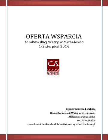 OFERTA WSPARCIA emkowskiej Watry Micha owie 1-2 sierpie 2014 Stowarzyszenie emków Biuro Organizacji Watry Micha owie Aleksandra Chudobina tel. 723659430 e-mail: [email protected] Szanowni Pa stwo, zapraszamy do zapoznania si z ofert wsparcia unikalnego na skal Dolnego ska wydarzenia kulturalnego - emkowskiej Watry. Watra to trzydniowa, muzyczno - kulturalna impreza plenerowa w Micha owie k. Lubina, skupiaj ca corocznie oko o 3 tysi ce go ci z ca ej Polski i z zagranicy. To jedyne w regionie wydarzenie rozpoznawalne jest nie tylko w rodowisku emkowskim, ale tak e ród jego sympatyków. Watra w Micha owie jest kierowana do szerokiego grona odbiorców, w ka dej grupie wiekowej. Co roku zapraszanych jest oko o 20 zespo ów z Polski i ze wiata. Watra szczyci si d ugotrwa tradycj . Organizowana przez Stowarzyszenie emków cyklicznie od 30-tu lat, regularnie dotowana jest przez Ministerstwo Spraw Wewn trznych i Administracji oraz obj ta jest Honorowym Patronatem Wojewody Dolno skiego. Wieloletnim g ównym sponsorem Watry jest fundacja „Polska Mied ” i Starostwo Powiatowe w Polkowicach. Sponsoring emkowskiej Watry jest doskona ym sposobem na komunikacj firmy z otoczeniem. Oprócz wymiernych korzy ci promocyjnych nasza oferta daje Pa stwu mo liwo lokalnego zaprezentowania si w regionie Dolnego ska, poniewa firma b dzie widoczna przede wszystkim dla odbiorców z regionu Zag bia Miedziowego oraz Wroc awia, licznie odwiedzaj cych nasz imprez . Istnieje mo liwo sprzeda y bezpo redniej Pa stwa produktów. Oferujemy wiadczenia, które wzmocni wizerunek Pa stwa firmy w postaci trzech pakietów sponsorskich: emkowska Watra w Micha owie Pakiet 1 do 500 z logo Sponsora na plakatach i ulotkach reklamowych wydarzenia, logo Sponsora w programie wydarzenia, logo Sponsora na stronie internetowej Stowarzyszenia emków przy informacji o wydarzeniu, logo Sponsora na stronie internetowej Watry, plansza reklamowa/roll up dostarczona przez Sponsora umieszczona pod scen koncertow , Pakiet 2 do 1000 z logo Sponsora na plakatach i ulotkach reklamowych wydarzenia, logo Sponsora w programie wydarzenia, logo Sponsora na stronie internetowej Stowarzyszenia emków przy informacji o wydarzeniu, logo Sponsora na stronie internetowej Watry, plansza reklamowa/roll up dostarczona przez Sponsora umieszczona pod scen koncertow , emisja planszy reklamowej/spotu reklamowego na telebimie umieszczonym przy scenie koncertowej oraz na ekranie przed emisj ka dego z filmów podczas imprezy towarzysz cej – pokazu filmów, Pakiet 3 do 2000 z logo Sponsora na plakatach i ulotkach reklamowych wydarzenia, logo Sponsora w programie wydarzenia, logo Sponsora na stronie internetowej Stowarzyszenia emków przy informacji o wydarzeniu, logo Sponsora na stronie internetowej Watry, plansza reklamowa/roll up dostarczona przez Sponsora umieszczona pod scen koncertow , emisja planszy reklamowej/spotu reklamowego na telebimie umieszczonym przy scenie koncertowej oraz na ekranie przed emisj ka dego z filmów podczas imprezy towarzysz cej – pokazu filmów, ekspozycja materia ów promocyjnych dostarczonych przez Sponsora, (np. ulotek) przed sponsorowanym wydarzeniem lub do czenie materia ów promocyjnych do sprzedawanych biletów. Serdecznie zapraszamy Pa stwa do wspó pracy. W celu indywidualnego dopasowania oferty prosimy o kontakt. Jeste my otwarci na pomys y i mo liwo ci jak najlepszego promocyjnego wykorzystania obecno ci Sponsora podczas prezentowanego wydarzenia. emkowska Watra w Micha owie