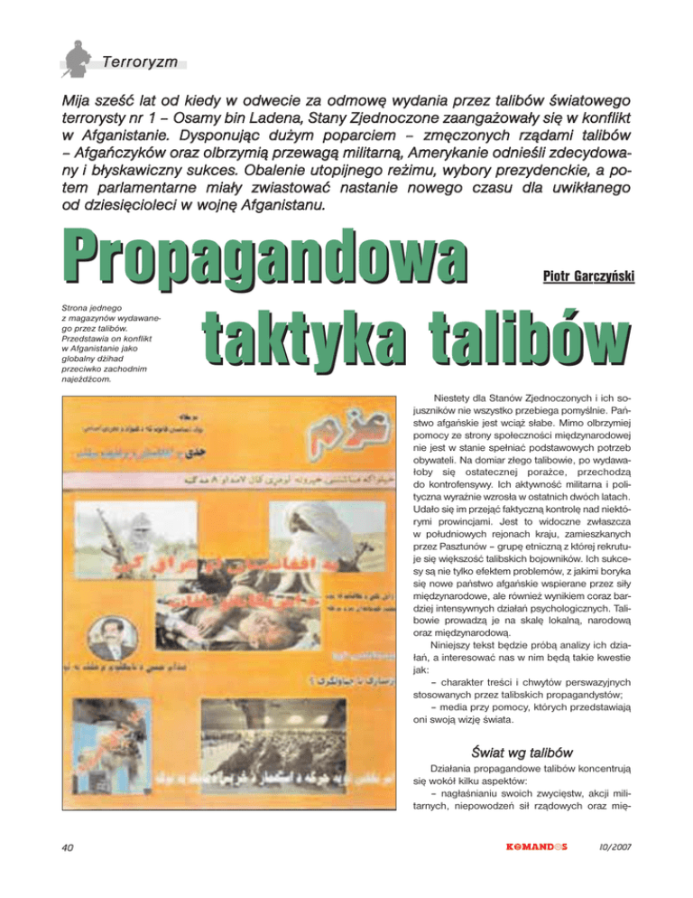 Terroryzm Mija sześć lat od kiedy w odwecie za odmowę wydania przez talibów światowego terrorysty nr 1 – Osamy bin Ladena, Stany Zjednoczone zaangażowały się w konflikt w Afganistanie. Dysponując dużym poparciem – zmęczonych rządami talibów – Afgańczyków oraz olbrzymią przewagą militarną, Amerykanie odnieśli zdecydowa ny i błyskawiczny sukces. Obalenie utopijnego reżimu, wybory prezydenckie, a potem parlamentarne miały zwiastować nastanie nowego czasu dla uwikłanego od dziesięcioleci w wojnę Afganistanu. Propagandowa taktyka talibów Piotr Garczyński Strona jednego z magazynów wydawanego przez talibów. Przedstawia on konflikt w Afganistanie jako globalny dżihad przeciwko zachodnim najeźdźcom. Niestety dla Stanów Zjednoczonych i ich sojuszników nie wszystko przebiega pomyślnie. Państwo afgańskie jest wciąż słabe. Mimo olbrzymiej pomocy ze strony społeczności międzynarodowej nie jest w stanie spełniać podstawowych potrzeb obywateli. Na domiar złego talibowie, po wydawałoby się ostatecznej porażce, przechodzą do kontrofensywy. Ich aktywność militarna i polityczna wyraźnie wzrosła w ostatnich dwóch latach. Udało się im przejąć faktyczną kontrolę nad niektórymi prowincjami. Jest to widoczne zwłaszcza w południowych rejonach kraju, zamieszkanych przez Pasztunów – grupę etniczną z której rekrutuje się większość talibskich bojowników. Ich sukcesy są nie tylko efektem problemów, z jakimi boryka się nowe państwo afgańskie wspierane przez siły międzynarodowe, ale również wynikiem coraz bardziej intensywnych działań psychologicznych. Talibowie prowadzą je na skalę lokalną, narodową oraz międzynarodową. Niniejszy tekst będzie próbą analizy ich działań, a interesować nas w nim będą takie kwestie jak: – charakter treści i chwytów perswazyjnych stosowanych przez talibskich propagandystów; – media przy pomocy, których przedstawiają oni swoją wizję świata. Świat wg talibów Działania propagandowe talibów koncentrują się wokół kilku aspektów: – nagłaśnianiu swoich zwycięstw, akcji militarnych, niepowodzeń sił rządowych oraz mię- 40 10/2007 Terroryzm dzynarodowych, gloryfikacji mudżahedinów i ich działań; – dyskredytacji rządu i sił koalicyjnych; – podkreślaniu znaczenia islamu, zwłaszcza w walce z najeźdźcą i skorumpowanym przez niego rządem; – budowaniu wśród Afgańczyków przeświadczenia o tym, że ich kraj jest miejscem konfliktu międzycywilizacyjnego. „Zwyciężymy!” Komunikaty wojenne są jednym z nieodłącznych elementów każdej wojny, a zwłaszcza tej informacyjnej. Pomijanie strat własnych, przesadzone informacje o przegranych bitwach przeciwnika, umniejszanie jego dokonań, wyolbrzymianie pomyłek – oto krótka charakterystyka tego narzędzia wpływu na opinię publiczną. Można powiedzieć, że takie są reguły prowadzenia wojny informacyjnej, a rozbieżności w poglądzie na poszczególne zdarzenia wydają się być czymś normalnym. Trudności w weryfikacji danych w konfliktach powodują, że liczby podawane przez obie strony będą zawsze się różnić. Nie inaczej jest w przypadku wydarzeń w Afganistanie. Sztandarowym przykładem niezgodności co do zdarzenia są oświadczenia dotyczące strat własnych i przeciwnika w sprzęcie i ludziach. Kiedy rzecznik prasowy sił sprzymierzonych twierdzi, że w operacji „Meduza”, która miała miejsce we wrześniu 2006 roku w południowym Kandaharze, zginęło około 540 talibów, rzecznik tych drugich uznaje dane te za przesadzone. Dodaje przy tym, że ci, którzy ponieśli śmierć, nie byli żadnymi bojownikami, ale cywilami. W ten sposób sugeruje, że siły koalicyjne znów popełniły błąd. Kiedy zostaje zniszczony helikopter wojsk koalicyjnych, to według samych zainteresowanych był to wypadek z powodu problemów technicznych, natomiast według talibów to kolejne zestrzelenie. Przykładów możemy znaleźć więcej. Ten, którego informacje afgańskie audytorium uzna za wiarygodne, zwycięży wojnę informacyjną. Umiejętnie nagłaśniane przez talibów „potknięcia” sił ISAF (widziane jako celowa eksterminacja narodu afgańskiego), podważają zaufanie do sił ISAF i niebezpiecznie przesuwają szalę zwycięstwa na stronę talibów. Inną formą transmisji swojej wizji rzeczywistości są odezwy wojenne – przesłania mobilizujące „Jeśli Rosjanie nie mogli zwyciężyć walcząc tylko w Afganistanie, jak mogą zrobić to Amerykanie, którzy walczą równocześnie w Iraku i Afganistanie?” 10/2007 do podjęcia działań wojennych wobec przeciwnika, niosące moralne i religijne uprawomocnienie tego trudu. Odezwy takie stanowią wykładnię ideologii danego ruchu, zawierają komentarz do bieżących wydarzeń, ostrzegają wroga i jego konfidentów, wskazują kierunek przyszłych działań, są również świadectwem ciągłego uczestnictwa w „grze”. Nic bowiem tak nie denerwuje przeciwnika, jak naigrywanie się z jego daremnych działań na oczach milionów widzów. Celują w tym bin Laden i Aymana al-Zawhiri. Z tej formy przekazu korzystają również mniej lub bardziej znani przywódcy talibscy. Na jednej z konferencji przedstawiciel talibów Rehmatullah Hashmi pokazuje materiały jednej z chrześcijańskich organizacji misyjnych. Według talibów to kolejny dowód na prawdziwe zamiary (Chrystianizacja Afganistanu) Ameryki i ich koalicjantów. Okupanci i ich marionetkowy rząd Spora część wysiłków propagandowych talibów jest skoncentrowana na przedstawianiu wojsk sprzymierzonych jako sił okupacyjnych. Służy temu m.in. porównywanie ISAF do okupanta sowieckiego. Jest to bardzo prosty, ale skuteczny zabieg poruszający głęboko zakorzenioną w Afgańczykach dumę z własnej niezależności, umiłowania wolności i konieczności jej obrony przed „obcym”. Wskazywanie na zewnętrzne zagrożenie jest również jednym z podstawowych sposobów scalania