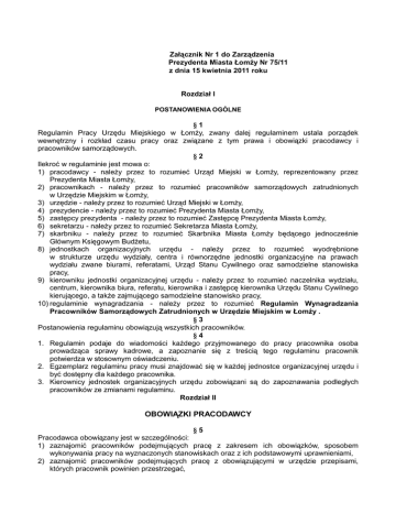 Załącznik Nr 1 do Zarządzenia Prezydenta Miasta Łomży Nr 75/11 z dnia 15 kwietnia 2011 roku Rozdział I POSTANOWIENIA OGÓLNE §1 Regulamin Pracy Urzędu Miejskiego w Łomży, zwany dalej regulaminem ustala porządek wewnętrzny i rozkład czasu pracy oraz związane z tym prawa i obowiązki pracodawcy i pracowników samorządowych. §2 Ilekroć w regulaminie jest mowa o: 1) pracodawcy - należy przez to rozumieć Urząd Miejski w Łomży, reprezentowany przez Prezydenta Miasta Łomży, 2) pracownikach - należy przez to rozumieć pracowników samorządowych zatrudnionych w Urzędzie Miejskim w Łomży, 3) urzędzie - należy przez to rozumieć Urząd Miejski w Łomży, 4) prezydencie - należy przez to rozumieć Prezydenta Miasta Łomży, 5) zastępcy prezydenta - należy przez to rozumieć Zastępcę Prezydenta Miasta Łomży, 6) sekretarzu - należy przez to rozumieć Sekretarza Miasta Łomży, 7) skarbniku - należy przez to rozumieć Skarbnika Miasta Łomży będącego jednocześnie Głównym Księgowym Budżetu, 8) jednostkach organizacyjnych urzędu - należy przez to rozumieć wyodrębnione w strukturze urzędu wydziały, centra i równorzędne jednostki organizacyjne na prawach wydziału zwane biurami, referatami, Urząd Stanu Cywilnego oraz samodzielne stanowiska pracy, 9) kierowniku jednostki organizacyjnej urzędu - należy przez to rozumieć naczelnika wydziału, centrum, kierownika biura, referatu, kierownika i zastępcę kierownika Urzędu Stanu Cywilnego kierującego, a także zajmującego samodzielne stanowisko pracy, 10) regulaminie wynagradzania - należy przez to rozumieć Regulamin Wynagradzania Pracowników Samorządowych Zatrudnionych w Urzędzie Miejskim w Łomży . §3 Postanowienia regulaminu obowiązują wszystkich pracowników. §4 1. Regulamin podaje do wiadomości każdego przyjmowanego do pracy pracownika osoba prowadząca sprawy kadrowe, a zapoznanie się z treścią tego regulaminu pracownik potwierdza w stosownym oświadczeniu. 2. Egzemplarz regulaminu pracy musi znajdować się w każdej jednostce organizacyjnej urzędu i być dostępny dla każdego pracownika. 3. Kierownicy jednostek organizacyjnych urzędu zobowiązani są do zapoznawania podległych pracowników ze zmianami regulaminu. Rozdział II OBOWIĄZKI PRACODAWCY §5 Pracodawca obowiązany jest w szczególności: 1) zaznajomić pracowników podejmujących pracę z zakresem ich obowiązków, sposobem wykonywania pracy na wyznaczonych stanowiskach oraz z ich podstawowymi uprawnieniami, 2) zaznajomić pracowników podejmujących pracę z obowiązującymi w urzędzie przepisami, których pracownik powinien przestrzegać, 3) zapewnić zapoznanie się pracowników z przepisami dotyczącymi równego traktowania w zatrudnieniu poprzez udostępnienie pisemnej informacji dotyczącej obowiązujących uregulowań prawnych w zakresie nawiązania i rozwiązania stosunku pracy, warunków zatrudnienia, awansowania oraz dostępu do szkolenia w celu podnoszenia kwalifikacji zawodowych, w szczególności bez względu na płeć, wiek, niepełnosprawność, rasę, religię, narodowość, przekonania polityczne, przynależność związkową, pochodzenie etniczne, wyznanie, orientację seksualną, a także bez względu na zatrudnienie na czas określony lub nie określony albo w pełnym lub w niepełnym wymiarze czasu pracy. Informacja stanowi załącznik Nr 1 do niniejszego regulaminu oraz podlega wywieszeniu na tablicy ogłoszeń w budynku głównym Urzędu przy ul. Stary Rynek 14, I piętro, 4) szanować godność i inne dobra osobiste pracownika, 5) podejmować działania celem niedopuszczenia do dyskryminowania pracowników z przyczyn określonych w pkt 3, 6) wpływać na kształtowanie w urzędzie zasad współżycia społecznego, 7) niedopuszczać oraz przeciwdziałać mobbingowi w stosunku do pracownika, tj. wszelkim działaniom lub zachowaniom dotyczącym pracownika lub skierowanym przeciwko pracownikowi, polegającym na uporczywym i długotrwałym nękaniu lub zastraszaniu pracownika, wywołującym u niego zaniżoną ocenę przydatności zawodowej, powodującym lub mającym na celu poniżenie lub ośmieszenie pracownika, izolowaniego lub wyeliminowanie z zespołu współpracowników, 8) organizować pracę w sposób zapewniający pełne wykorzystanie czasu pracy, jak również osiąganie przez pracowników, przy wykorzystaniu ich uzdolnień i kwalifikacji, wysokiej wydajności i należytej jakości pracy, 9) organizować pracę w sposób zapewniający zmniejszenie uciążliwości pracy, zwłaszcza pracy monotonnej i pracy w ustalonym z góry tempie, 10) stwarzać pracownikom podejmującym zatrudnienie po ukończeniu szkoły warunki sprzyjające przystosowaniu się do należytego wykonywania pracy, 11) zapewniać bezpieczne i higieniczne warunki pracy oraz prowadzić systematyczne szkolenie pracowników w zakresie bezpieczeństwa i higieny pracy, 12) terminowo i prawidłowo wypłacać wynagrodzenie, 13) przewidywać w planach finansowych środki finansowe na podnoszenie wiedzy i kwalifikacji zawodowych pracowników oraz ułatwiać im uczestniczenie w różnych formach szkolenia, 14) zaspokajać w miarę posiadanych warunków i środków bytowe, socjalne i kulturalne potrzeby pracowników, 15) stosować obiektywne i sprawiedliwe kryteria oceny pracowników oraz wyników ich pracy, 16) prowadzić dokumentację w sprawach związanych ze stosunkiem pracy oraz akta osobowe pracowników, 17) wydawać pracownikom świadectwo pracy zgodnie z obowiązującymi w tym zakresie przepisami, 18) przyjmować skargi i wnioski pracowników w wyznaczonym miejscu i czasie, 19) wydawać pracownikom potrzebne materiały i narzędzia pracy. §6 Do obowiązków pracodawcy należy również zapewnienie pracownikowi w szczególności: 1) potwierdzenia na piśmie, najpóźniej w dniu rozpoczęcia pracy przez pracownika, ustaleń dotyczących nawiązania stosunku pracy, zwłaszcza jego rodzaju i warunków, 2) otrzymania pisemnej i