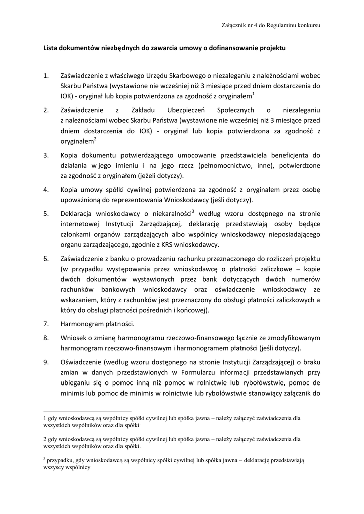 Załącznik nr 4 do Regulaminu konkursu Lista dokumentów niezbędnych do zawarcia umowy o dofinansowanie projektu 1. Zaświadczenie z właściwego Urzędu Skarbowego o niezaleganiu z należnościami wobec Skarbu Państwa (wystawione nie wcześniej niż 3 miesiące przed dniem dostarczenia do IOK) - oryginał lub kopia potwierdzona za zgodność z oryginałem1 2. Zaświadczenie z Zakładu Ubezpieczeń Społecznych o niezaleganiu z należnościami wobec Skarbu Państwa (wystawione nie wcześniej niż 3 miesiące przed dniem dostarczenia do IOK) - oryginał lub kopia potwierdzona za zgodność z oryginałem2 3. Kopia dokumentu potwierdzającego umocowanie przedstawiciela beneficjenta do działania w jego imieniu i na jego rzecz (pełnomocnictwo, inne), potwierdzone za zgodność z oryginałem (jeżeli dotyczy). 4. Kopia umowy spółki cywilnej potwierdzona za zgodność z oryginałem przez osobę upoważnioną do reprezentowania Wnioskodawcy (jeśli dotyczy). 5. Deklaracja wnioskodawcy o niekaralności3 według wzoru dostępnego na stronie internetowej Instytucji Zarządzającej, deklarację przedstawiają osoby będące członkami organów zarządzających albo wspólnicy wnioskodawcy nieposiadającego organu zarządzającego, zgodnie z KRS wnioskodawcy. 6. Zaświadczenie z banku o prowadzeniu rachunku przeznaczonego do rozliczeń projektu (w przypadku występowania przez wnioskodawcę o płatności zaliczkowe – kopie dwóch dokumentów wystawionych przez bank dotyczących dwóch numerów rachunków bankowych wnioskodawcy oraz oświadczenie wnioskodawcy ze wskazaniem, który z rachunków jest przeznaczony do obsługi płatności zaliczkowych a który do obsługi płatności pośrednich i końcowej). 7. Harmonogram płatności. 8. Wniosek o zmianę harmonogramu rzeczowo-finansowego łącznie ze zmodyfikowanym harmonogram rzeczowo-finansowym i harmonogramem płatności (jeśli dotyczy). 9. Oświadczenie (według wzoru dostępnego na stronie Instytucji Zarządzającej) o braku zmian w danych przedstawionych w Formularzu informacji przedstawianych przy ubieganiu się o pomoc inną niż pomoc w rolnictwie lub rybołówstwie, pomoc de minimis lub pomoc de minimis w rolnictwie lub rybołówstwie stanowiący załącznik do 1 gdy wnioskodawcą są wspólnicy spółki cywilnej lub spółka jawna – należy załączyć zaświadczenia dla wszystkich wspólników oraz dla spółki. 2 gdy wnioskodawcą są wspólnicy spółki cywilnej lub spółka jawna – należy załączyć zaświadczenia dla wszystkich wspólników oraz dla spółki. 3 przypadku, gdy wnioskodawcą są wspólnicy spółki cywilnej lub spółka jawna – deklarację przedstawiają wszyscy wspólnicy Załącznik nr 4 do Regulaminu konkursu Rozporządzenia Rady Ministrów z dnia 29 marca 2010 r. w sprawie zakresu informacji przedstawianych przez podmiot ubiegający się o pomoc inną niż pomoc de minimis lub pomoc de minimis w rolnictwie lub rybołówstwie (Dz.U. Nr 53, poz. 312 z późn. zm.) na etapie składania wniosku o dofinansowanie. W przypadku gdy, informacje/dane uległy zmianie, należy przedłożyć zaktualizowany Formularz wraz ze sprawozdaniami finansowymi sporządzonymi zgodnie z przepisami o rachunkowości (lub oświadczenie, że wnioskodawca nie ma obowiązku sporządzania sprawozdań finansowych na podstawie ustawy o rachunkowości). 10. Oświadczenie (według wzoru dostępnego na stronie Instytucji Zarządzającej) o braku zmian w danych przedstawionych w Formularzu informacji przedstawianych przy ubieganiu się o pomoc de minimis stanowiący załącznik do Rozporządzenia Rady Ministrów z dnia 29 marca 2010 r. w sprawie zakresu informacji przedstawianych przez podmiot ubiegający się o pomoc de minimis (Dz. U. Nr 53, poz. 311, ze zm.) (jeśli dotyczy- tzn. należy załączyć w przypadku ubiegania się o pomoc de minimis) na etapie składania wniosku o dofinansowanie. W przypadku gdy, informacje/dane uległy zmianie, należy przedłożyć zaktualizowany Formularz4 11. Oświadczenie o braku zmian w statusie przedsiębiorcy ustalonym zgodnie z Załącznikiem nr 1 do rozporządzenia 651/2014. 12. Pozwolenie na budowę o dofinansowanie4(jeśli dotyczy). ile nie było złożone na etapie wniosku o 13. Wypełniony formularz „Analiza zgodności projektu z polityką ochrony środowiska” oraz dokumentacja środowiskowa wynikająca z wypełnionego formularza o ile nie była złożona na etapie wniosku o dofinansowanie5 (jeśli dotyczy). 14. Inne dokumenty, wskazane w ocenie eksperta, (jeśli dotyczy). Przez kopię potwierdzoną za zgodność z oryginałem należy rozumieć: kopię dokumentu zawierającego klauzulę "za zgodność z oryginałem" umieszczoną na każdej stronie dokumentu wraz z czytelnym podpisem (imię i nazwisko) osoby uprawnionej do reprezentacji, lub kopię dokumentu zawierającą na pierwszej stronie dokumentu klauzulę "za zgodność z oryginałem od strony ... do strony... " oraz czytelny podpis (imię i nazwisko) osoby uprawnionej do reprezentacji, a także parafki na każdej stronie dokumentu. 4 Dotyczy Przedsiębiorców ubiegających się o pomoc de minimis. W przypadku, gdy Wnioskodawca w trakcie aplikowania ubiega się o pozwolenie na budowę oraz w przypadku projektów, których realizacja wymaga również uzyskania decyzji środowiskowej, o której mowa w art. 71 ustawy z dnia 3 października 2008 r. o udostępnianiu informacji o środowisku i jego ochronie, udziale społeczeństwa w ochronie środowiska oraz o ocenach oddziaływania na środowisko (Dz. U. Nr 199, poz. 1227, z późn. zm.), jest zobligowany przesłać prawomocną decyzję środowiskową (z dokumentacją OOŚ – jeśli dotyczy) oraz prawomocne pozwolenie na budowę najpóźniej w terminie 10 miesięcy od dnia doręczenia pisemnej informacji o zatwierdzeniu projektu do wsparcia. 5