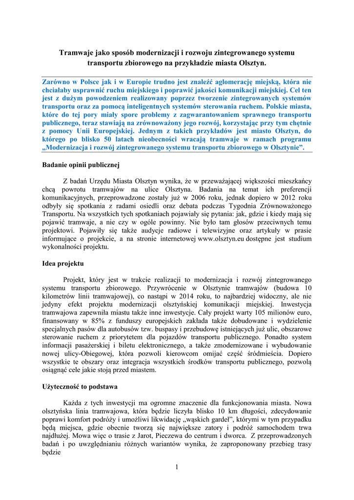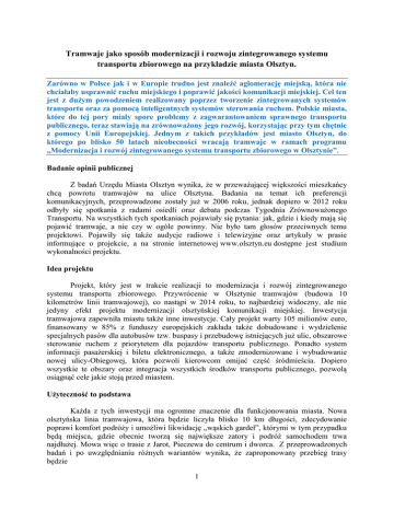 Tramwaje jako sposób modernizacji i rozwoju zintegrowanego systemu transportu zbiorowego na przykładzie miasta Olsztyn. Zarówno w Polsce jak i w Europie trudno jest znaleźć aglomerację miejską, która nie chciałaby usprawnić ruchu miejskiego i poprawić jakości komunikacji miejskiej. Cel ten jest z dużym powodzeniem realizowany poprzez tworzenie zintegrowanych systemów transportu oraz za pomocą inteligentnych systemów sterowania ruchem. Polskie miasta, które do tej pory miały spore problemy z zagwarantowaniem sprawnego transportu publicznego, teraz stawiają na zrównoważony jego rozwój, korzystając przy tym chętnie z pomocy Unii Europejskiej. Jednym z takich przykładów jest miasto Olsztyn, do którego po blisko 50 latach nieobecności wracają tramwaje w ramach programu „Modernizacja i rozwój zintegrowanego systemu transportu zbiorowego w Olsztynie”. Badanie opinii publicznej Z badań Urzędu Miasta Olsztyn wynika, że w przeważającej większości mieszkańcy chcą powrotu tramwajów na ulice Olsztyna. Badania na temat ich preferencji komunikacyjnych, przeprowadzone zostały już w 2006 roku, jednak dopiero w 2012 roku odbyły się spotkania z radami osiedli oraz debata podczas Tygodnia Zrównoważonego Transportu. Na wszystkich tych spotkaniach pojawiały się pytania: jak, gdzie i kiedy mają się pojawić tramwaje, a nie czy w ogóle powinny. Nie było tam głosów przeciwnych temu projektowi. Pojawiły się także audycje radiowe i telewizyjne oraz artykuły w prasie informujące o projekcie, a na stronie internetowej www.olsztyn.eu dostępne jest studium wykonalności projektu. Idea projektu Projekt, który jest w trakcie realizacji to modernizacja i rozwój zintegrowanego systemu transportu zbiorowego. Przywrócenie w Olsztynie tramwajów (budowa 10 kilometrów linii tramwajowej), co nastąpi w 2014 roku, to najbardziej widoczny, ale nie jedyny efekt projektu modernizacji olsztyńskiej komunikacji miejskiej. Inwestycja tramwajowa zapewniła miastu także inne inwestycje. Cały projekt warty 105 milionów euro, finansowany w 85% z funduszy europejskich zakłada także dobudowane i wydzielenie specjalnych pasów dla autobusów tzw. buspasy i przebudowę istniejących już ulic, obszarowe sterowanie ruchem z priorytetem dla pojazdów transportu publicznego. Ponadto system informacji pasażerskiej i biletu elektronicznego, a także zmodernizowane i wybudowanie nowej ulicy-Obiegowej, która pozwoli kierowcom omijać część śródmieścia. Dopiero wszystkie te obszary oraz integracja wszystkich środków transportu publicznego, pozwolą osiągnąć cele jakie stoją przed miastem. Użyteczność to podstawa Każda z tych inwestycji ma ogromne znaczenie dla funkcjonowania miasta. Nowa olsztyńska linia tramwajowa, która będzie liczyła blisko 10 km długości, zdecydowanie poprawi komfort podróży i umożliwi likwidację „wąskich gardeł”, którymi w tym przypadku będą miejsca, gdzie obecnie tworzą się największe zatory i podróż samochodem trwa najdłużej. Mowa więc o trasie z Jarot, Pieczewa do centrum i dworca. Z przeprowadzonych badań i po uwzględnianiu różnych wariantów wynika, że zaproponowany przebieg trasy będzie 1 najbardziej optymalny. Linia tramwajowa będzie składała się z trzech części i wyglądała następująco: Trasa podstawowa (kolor zielony) będzie wiodła z Jarot do Dworca Głównego. Od przystanku początkowego u zbiegu ulic Witosa i Kanta linia pobiegnie po północnej stronie ulicy Witosa , następnie skręci na północ w nowy odcinek ulicy biskupa Tadeusza Płoskiego i będzie prowadzić po jego zachodniej stronie. Tą stroną tory będą prowadziły aż do ulicy Pstrowskiego, którą przetną, by iść po zachodniej stronie ulicy Obiegowej, do ulicy Żołnierskiej, w którą torowisko będzie skręcać na zachód przy budynku Sanepidu. Następnie linia poprowadzi obok obserwatorium astronomicznego i hotelu Relaks do ulicy Tadeusza Kościuszki, którą dotrze do placu Konstytucji 3 Maja, gdzie za rondem, na wysokości dworca PKS znajdzie się przystanek końcowy. Długość tej trasy będzie wynosiła 7285 m. Odnoga do Kortowa (kolor różowy) będzie jednotorowym odgałęzieniem i od głównej linii będzie odchodzić przy skrzyżowaniu alei generała Sikorskiego z ulicami Tuwima i Synów Pułku. Linia pobiegnie po północnej stronie ulicy Tuwima aż do Kortowa, gdzie zakończy się przy skrzyżowaniu ulicy Tuwima z aleją Warszawską i ulicą prof. Prawocheńskiego. Całkowita długość tego odcinka będzie wynosiła 1903 m. Rysunek 1 Planowana linia tramwajowa w Olsztynie Źródło: http://olsztynskietramwaje.pl/trasa/ Odgałęzienie do Wysokiej Bramy (kolor niebieski) będzie rozpoczynać się na skrzyżowaniu ul. Kościuszki i al. marszałka Piłsudskiego i będzie prowadzić tą drugą do pl. Jana Pawła II, a następnie ul. 11 Listopada do placu przy Wysokiej Bramie. Jej długość będzie wynosiła 792 m. Korki autobusom nie straszne Wzdłuż sześciu ulic (Pstrowskiego, al. Niepodległości, Mochnackiego, Grunwaldzkiej, Śliwy, al. Warszawskiej) wybudowane zostały już specjalne pasy dla autobusów komunikacji miejskiej. Nawet jeśli nie na wszystkich z tych ulic autobusy już dziś tracą czas w korkach, to bez wybudowania buspasów byłoby to tylko kwestią czasu, ponieważ 2 z roku na rok samochodów przybywa, a obecna ich liczba w Olsztynie sięga ponad 100 tysięcy. Bez myślenia o przyszłości Olsztynowi trudno byłoby się rozwijać w następnych latach. Co warte podkreślenia na budowie buspasów nie stracili kierowcy, gdyż nie zostało im zabrane miejsce – ulice są poszerzone, a autobusy jeżdżą nowo wybudowanymi pasami. Rysunek 2 Nowe buspasy Źródło: http://olsztynski.blogspot.com/ Wreszcie powstanie ulica Obiegowa Tramwaje zapewnią także budowę odcinka planowanej już od lat 70 ubiegłego wieku małej obwodnicy śródmieścia, czyli ulicy Obiegowej. Kierowcy pojadą od 