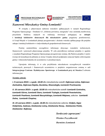 Szanowni Mieszkańcy Gminy Łomianki! W związku z planowanym naborem wniosków aplikacyjnych w ramach Regionalnego Programu Operacyjnego - Działanie 4.3 „Ochrona powietrza, energetyka” oraz zaistniałą moŜliwością pozyskania funduszy unijnych na realizację inwestycji polegającej na zakupie i instalacji kolektorów słonecznych dla mieszkańców gminy pragniemy poinformować, iŜ Urząd Miejski w Łomiankach planuje przygotowanie i złoŜenie wniosku aplikacyjnego dla projektu zakupu i instalacji kolektorów w indywidualnych gospodarstwach domowych. PoniŜej zamieściliśmy szczegółowe informacje dotyczące warunków technicznych, finansowych i prawnych planowanego projektu. W celu prawidłowej realizacji projektu w zgodzie z zasadami Regionalnego Programu Operacyjnego przygotowane zostaną dla Państwa projekty 2 umów (wersje do konsultacji do pobrania ze strony Urzędu), których podpisanie oznaczać będzie zobowiązanie gminy i właściciela budynku do uczestnictwa w przedsięwzięciu. Uprzejmie informuję, iŜ w celu przybliŜenia mieszkańcom szczegółowych warunków technicznych, prawnych i finansowych uczestnictwa w projekcie zorganizowane zostaną w auli Integracyjnego Centrum Dydaktyczno- Sportowego w Łomiankach przy ul. Staszica 2 zebrania informacyjne: Terminy zebrań: I. 9 czerwca 2010 r. o godz. 18.00 dla mieszkańców osiedli: Dąbrowa Leśna, Dąbrowa Zachodnia, Dąbrowa Rajska, Buraków, Równoległa, Łomianki Prochownia; II. 16 czerwca 2010 r. o godz. 18.00 dla mieszkańców osiedli: Łomianki Centralne, Łomianki Górne, Łomianki Stare, Łomianki Trylogia, Łomianki Powstańców, Łomianki Pawłowo, Łomianki Baczyńskiego, Łomianki Majowe, sołectw: Łomianki Dolne, Łomianki Chopina; III. 23 czerwca 2010 r. o godz. 18.00 dla mieszkańców sołectw: Kiełpin, Kępa Kiełpińska, Sadowa, Dziekanów Leśny, Dziekanów Nowy, Dziekanów Polski, Dziekanów Bajkowy. Serdecznie zapraszam! Wiesław Pszczółkowski Burmistrz Łomianek DOTACJE DO KOLEKTORÓW SŁONECZNYCH DLA MIESZKAŃCÓW GMINY ŁOMIANKI Informacja dla mieszkańców dotycząca uwarunkowań technicznych, prawnych i finansowych uczestniczenia w projekcie „Ekologiczne partnerstwo - kompleksowe wykorzystanie odnawialnych źródeł energii na rzecz poprawy bezpieczeństwa energetycznego Gminy Łomianki” Część A: Uwarunkowania techniczne realizacji projektu 1. Zainteresowany uczestnictwem w projekcie mieszkaniec Gminy Łomianki musi posiadać własne źródło CWU (ciepłej wody uŜytkowej) w formie: pojemnościowej termy gazowej bądź elektrycznej, pojemnościowego zasobnika współpracującego z kotłem gazowym, olejowym, węglowym. 2. Przyjęto załoŜenie, Ŝe instalacja solarna będzie składała się z kolektora oraz zasobnika ze sterowaniem procesem odzyskania ciepła. Na taki cel potrzebna będzie odpowiednia powierzchnia w budynku – ok. 6 m². 3. Przy doborze instalacji solarnej przyjęto uśrednione parametry tak, aby zapewnić dla mniejszych gospodarstw domowych pokrycie zapotrzebowania ciepła na poziomie 60% rocznie, w większych gospodarstwach na poziomie 40% rocznie. System doboru wielkości instalacji solarnej do potrzeb uŜytkownika. Obecne na rynku kolektory słoneczne posiadają zbliŜoną powierzchnię absorbera czyli materiału który z promieni słońca (UV) wytwarza ciepło do produkcji c.w.u. Wartość ta to około 2m2 na kolektor słoneczny. PrzybliŜona technologia oferowanych na rynku kolektorów daje nam moŜliwość przyjęcia następujących załoŜeń do obliczeń: 2m2 = 1 kolektor słoneczny = w okresie maj - wrzesień od 100 do 150L ciepłej wody uŜytkowej o temp. 45 stopni C na dzień. Temperatura komfortu dla potrzeb CWU to wartość od 38 stopni C. (do obliczeń wykorzystano dane statystyczne nasłonecznienia Warszawy i okolic) Gospodarstwo domowe moŜe przeanalizować zuŜycie wody uŜytkowej i uwzględnić tą wartość do doboru zestawu lub jak to się robi w projektach budowlanych załoŜyć normy zuŜycia c.w.u. na liczbę mieszkańców: (do obliczeń zakłada się zuŜycie 100L CWU / osobę / dobę). W związku z czym moŜemy załoŜyć, iŜ dla gospodarstwa domowego o liczbie mieszkańców: • 3 osoby, potrzeba wymiennika na c.w.u. o pojemności 300L współpracującego z 2 kolektorami słonecznymi • 4 - 6 osób, potrzeba wymiennika na c.w.u. o pojemności 300L współpracującego z 3 kolektorami słonecznymi (ta sama pojemność wymiennika, ale dodatkowy kolektor powodują szybszą pracę układu co efektywnie podnosi sprawność nagrzania zbiornika do 45 stopni C ) • 7 - 9 osób, potrzeba wymiennika na c.w.u. o pojemności 500L współpracującego z 5 kolektorami słonecznymi. Większość oferowanych na rynku rozwiązań zakłada tego typu parametry. RóŜnice są subtelne i wynikają często z róŜnic w budowie kolektora, konstrukcji mocującej kolektor do dachu lub indywidualnych uwarunkowań miejsca instalacji – nasłonecznienie. Producenci zadbali równieŜ o kłopot związany z miejscem w kotłowni dla drugiego obok juŜ istniejącego zbiornika c.w.u. Wielu producentów w swojej ofercie ma zbiorniki z dwoma węŜownicami, jedna dla kolektorów słonecznych druga dla obecnego źródła ciepła ( piec gazowy, piec olejowy). Są takŜe dostępne zbiorniki, które posiadają „gniazdo” na grzałkę elektryczną, w tym momencie mamy w zbiorniku na cwu takŜe opcję tradycyjnej termy. 4. Proponowany w projekcie zestaw solarny będzie składał się z następujących elementów: a) kolektorów b) zasobnika c) układu pompowego d) układu bezpieczeństwa e) układu hydraulicznego f) sterowania g) izolacji h) stelaŜy do mocowania kolektorów 5. Po analizie aspektów technicznych i ekonomicznych podjęto wstępną decyzję o zastosowaniu kolektorów płaskich, które są powszechnie stosowane w przypadku wykorzystania energii słonecznej do podgrzewania CWU. Dlaczego kolektor płaski a nie próŜniowy? Instalacja kolektorów słoneczny