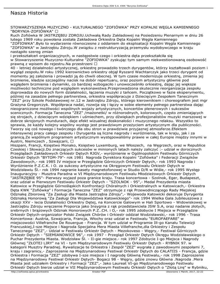 Orkiestra Dęta JSW S.A. KWK "Borynia-Zofiówka" Nasza Historia STOWARZYSZENIA MUZYCZNO - KULTURALNEGO "ZOFIÓWKA" PRZY KOPALNI WĘGLA KAMIENNEGO "BORYNIA-ZOFIÓWKA" Ruch Zofiówka W JASTRZĘBIU ZDROJU.Uchwałą Rady Zakładowej na Posiedzeniu Plenarnym w dniu 26 lutego 1969 roku powołana została Zakładowa Orkiestra Dęta Kopalni Węgla Kamiennego "ZOFIOWKA".Było to wydarzenie równoczesne z oddaniem do eksploatacji Kopalni Węgla Kamiennego "ZOFIOWKA" w Jastrzębiu Zdroju.W związku z restrukturyzacją przemysłu wydobywczego w kraju nastąpiło szereg zmian i przekształceń organizacyjnych, w następstwie czego i orkiestra dęta przekształciła się w Stowarzyszenie Muzyczno-Kulturalne "ZOFIOWKA" zyskując tym samym niekwestionowaną osobowość prawną z wpisem do rejestru.Na przestrzeni 40 - letniej działalności artystycznej, orkiestrę prowadziło trzech dyrygentów, którzy kształtowali poziom i wygląd zespołu.W roku 1992 kierownictwo orkiestry objął Ryszard Wachtarczyk jako trzeci dyrygent od momentu jej założenia i prowadzi ją do chwili obecnej. W tym czasie modernizuje orkiestrę, zmienia jej brzmienie, kładzie szczególny nacisk na dobór repertuaru, oraz poziom artystyczny głównie pod względem brzmienia i dynamiki, co bardziej wzbogaciło i unowocześniło orkiestrę, dając jej większe możliwości techniczne pod względem wykonawstwa.Przeprowadzona skutecznie reorganizacja zespołu doprowadza do nowych form działalności, łączenia muzyki z tańcem. Początkowo w fazie eksperymentu, później na zasadzie pełnego partnerstwa, orkiestra współpracuje z Dziecięcym Zespołem Tanecznym "ZEZ" przy Szkole Podstawowej nr.12 w Jastrzębiu Zdroju, którego kierownikiem i choreografem jest mgr Grażyna Gregorczyk. Współpraca nadal, rozwija się i łączy w sobie elementy pełnego partnerstwa dając nieograniczone możliwości wspólnych wojaży artystycznych, koncertów plenerowych i sukcesów scenicznych. Formacja Taneczna "ZEZ" /mażonetki/ w różnorodnych, kolorowych, często zmieniających się strojach, z dziecięcym wdziękiem i uśmiechem, przy dźwiękach profesjonalistów muzyki marszowej w dobrze skrojonych mundurach, daje efekt wizualnej doskonałości i muzycznego relaksu. Wszystko to sprawia, że każdy kolejny wspólny występ jest prawdziwym przeżyciem artystycznym dla publiczności. Tworzy się coś nowego i twórczego dla obu stron w prawdziwie przyjaznej atmosferze.Efektem intensywnej pracy całego zespołu i Dyrygenta są liczne nagrody i wyróżnienia, tak w kraju, jak i za granicą.Ze wspólnym programem artystycznym występowaliśmy prawie w całej Europie między innymi w Austrii, Niemczech , Szwajcarii, Hiszpani, Francji, Księstwo Monako, Księstwo Luxemburg, we Włoszech, na Węgrzech, oraz w Republice Czeskiej i Słowacji.Do znaczących sukcesów w minionych latach należy zaliczyć :- udział w dorocznych Przeglądach Zakładowych Orkiestr Dętych RJGV,- wyróżnienie w Ogólnopolskim Festiwalu Górniczych Orkiestr Dętych "BYTOM-79"- rok 1981 Nagroda Dyrektora Kopalni "Zofiówka" i Federacji Związków Zawodowych,- rok 1985 IV miejsce w Przeglądzie Górniczych Orkiestr Dętych,- rok 1993 Nagroda i Wyróżnienie P.Z.C.K. i O. za sukcesy artystyczne na Okręgowym Festiwalu Orkiestr Dętych w Wodzisławiu Śl.- rok 1994 nagranie kasety magnetofonowej w Studio D/R w Wiśle,- rok 1995 Występ Inauguracyjny - Musztra Paradna w VI Międzynarodowym Festiwalu Młodzieżowych Orkiestr Dętych "JASTRZĘBIE 95"- Pierwszy wyjazd poza granice kraju. Trasa koncertowa - Szolnok, Eger, Budapeszt, oraz udział w Pierwszym Festiwalu Orkiestr Dętych - "SZOLNOK - 95",- Medal Prezydenta miasta Katowice w Przeglądzie Górnośląskich Konfrontacji Chóralnych i Orkiestralnych w Katowicach,- Orkiestra Dęta KWK "Zofiówka" i Formacja Taneczna "ZEZ" otrzymuje z rąk Przewodniczącego Rady Miejskiej Odznakę Zbiorową "Za Zasługi dla Miasta Jastrzębia Zdroju",- Wojewoda Katowicki dekoruje Dyrygenta Odznaką Honorową "Za Zasługi Dla Województwa Katowickiego"- rok 1994 Wielka Gala Jubileuszowa z okazji XXV - lecia Działalności Orkiestry Dętej, na Koncercie Galowym w Hali Sportowo - Widowiskowej w Jastrzębiu Zdroju wręczenie Proporca jako Insygnia z rąk przedstawiciela JSW S.A, oraz nadanie złotych, srebrnych i brązowych Odznak Honorowych P.Z..CH. i O,- rok 1995 zdobycie I Miejsca w Przeglądzie Orkiestr Dętych-organizator Polski Związek Chórów i Orkiestr oddział Wodzisławski,- rok 1996 - Trasa Koncertowa: Austria, Szwajcaria, Francja, Włochy oraz udział w Festiwalu "EUROFAEFARE" w miejscowości Villefranche De Rouergue - Francja. W tym udział w Programie Ill-go Kanału Telewizji Francuskiej,I-sze Miejsce i Nagroda Specjalna Mera Miasta Villefranche,dla Orkiestry i Zespołu Tanecznego "ZEZ",- Udział w Festiwalu Orkiestr Dętych - Mezokoveso - Węgry,- Festiwal Górniczych Orkiestr Dętych - "SIEMIANOWICE 96",- rok 1997 - Przegląd Orkiestr Dętych Okręgu Wodzisławskiego o Puchar Prezydenta Miasta. Wodzisław Śl. - II-gie miejsce.- rok 1997 Zdobycie I-go Miejsca i Nagrody Głównej "ZŁOTEJ LIRY" na VI - tym Międzynarodowym Festiwalu Orkiestr Dętych - RYBNIK 97. w kategorii Musztry Paradnej. Rywalizacje te Orkiestra i Zespół "ZEZ" wygrała z zawodowymi zespołami 7, kraju i zagranicy,- Zaproszenie na Międzynarodowy Festiwal Orkiestr Dętych do CALATIIS - Francja, gdzie Orkiestra i Formacja "ZEZ" zdobywa I-sze miejsce i I nagrodę Główną Festiwalu,- rok 1998 Zaproszenie na Międzynarodowy Festiwal Orkiestr Dętych- Bogacz 98 - Węgry, gdzie znowu Główna .Nagroda .Mera Miasta jest udziałem Orkiestry i Formacji "ZEZ",- Jako Laureat VI-go Międzynarodowego Festiwalu Orkiestr Dętych bierze udział w VII Międzynarodowym Festiwalu Orkiestr Dętych o "Złotą Lirę" w Rybniku, http://zofiowka.aplus.pl/orkiestra Kreator PDF Utworzono 1 March, 2017, 22:22 Orkiestra Dęta JSW S.A. KWK "Borynia-Zofiówka" gdzie tym razem Orkiest