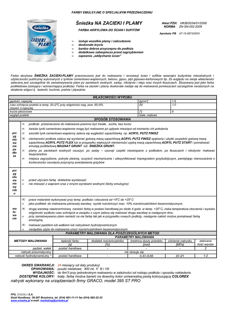 FARBY EMULSYJNE O SPECJALNYM PRZEZNACZENIU Śnieżka NA ZACIEKI I PLAMY Atest PZH: HK/B/0034/01/2006 NORMA ZN-SN-002:2008 FARBA AKRYLOWA DO ŚCIAN I SUFITÓW Aprobata ITB • • • • • AT-15-5873/2003 izoluje wszelkie plamy i zabrudzenia doskonałe krycie bardzo dobrze przyczepna do podłoża dodatkowo zabezpiecza przed zagrzybieniem zapewnia „oddychanie ścian” Farba akrylowa ŚNIEŻKA ZACIEKI-PLAMY przeznaczona jest do malowania i renowacji ścian i sufitów wewnątrz budynków mieszkalnych i użyteczności publicznej wykonanych z tynków cementowo-wapiennych, betonu, gipsu, płyt gipsowo-kartonowych itp. Ze względu na swoje właściwości zalecana jest szczególnie do zamalowywania plam po zaciekach wodnych, sadzy, nikotynie i oleju oraz innych tłuszczach. Stosowana jest jako farba podkładowa (izolująca i wzmacniająca podłoże). Farba na zacieki i plamy doskonale nadaje się do malowania pomieszczeń szczególnie narażonych na działanie wilgoci tj. łazienki, kuchnie, pralnie i pływalnie. WŁAŚCIWOŚCI WYROBU gęstość, najwyżej czas schnięcia powłoki w temp. 20±20C przy wilgotności wzg. pow. 65±5% stopień 3,najwyżej krycie jakościowe wygląd powłoki [g/cm3] [h] 1,6 1,0 [0] biała ,matowa II SPOSÓB STOSOWANIA prz yg oto wa nie po dło ża prz yg oto wa nie wy rob u • • • • • • • • • • ma lowa nie • • • • podłoże przeznaczone do malowania powinno być trwałe, suche, bez kurzu świeże tynki cementowo-wapienne mogą być malowane po upływie miesiąca od momentu ich położenia szorstki tynk cementowo-wapienny zaleca się wygładzić szpachlówką np. ACRYL PUTZ FINISZ nierówności podłoża zaleca się wyrównać gotową masą szpachlową ACRYL PUTZ FINISZ spękania i ubytki uzupełnić gotową masą szpachlową ACRYL PUTZ FLEX lub w przypadku większych nierówności sypką masą szpachlową ACRYL PUTZ START i pomalować emulsją podkładową MAGNAT GRUNT lub ŚNIEŻKA GRUNT. plamy po zaciekach wodnych osuszyć, po sadzy – usunąć cząstki niezwiązane z podłożem, po tłuszczach i nikotynie- malować bezpośrednio miejsca zagrzybione, pokryte pleśnią, oczyścić mechanicznie i zdezynfekować impregnatem grzybobójczym, pamiętając równocześnie o konieczności usunięcia przyczyny powstawania grzybów przed użyciem farbę dokładnie wymieszać nie mieszać z wapnem oraz z innymi wyrobami wodnymi (farby emulsyjne) prace malarskie wykonywać przy temp. podłoża i otoczenia od +50C do +250 C jako podkład- do malowania pierwszej warstwy wyrób rozcieńczyć max. 10% rozcieńczalnikiem bezaromatycznym, drugą warstwę nawierzchniową nanieść farbą w postaci handlowej po około 4 godz. w temp. +200 C, niska temperatura otoczenia i wysoka wilgotność wydłuża czas schnięcia w związku z czym zaleca się malować druga warstwę w następnym dniu. przy zamalowywaniu plam nanieść na nie farbę tak jak w przypadku nowych podłoży, następnie całość można pomalować farbą emulsyjną. malować pędzlem lub wałkiem lub natryskiem hydrodynamicznym narzędzia użyte do malowania umyć rozcieńczalnikiem bezaromatycznym PARAMETRY MALOWANIA DLA POSZCZEGÓLNYCH METOD METODY MALOWANIA pędzel, wałek natrysk pneumatyczny natrysk hydrodynamiczny * lepkość farby [s] postać handlowa postać handlowa PARAMETRY MALOWANIA dodatek rozcieńczalnika średnica dyszy pistoletu [%] [mm] nie stosuje się 0,43÷0,66 ciśnienie natrysku [MPa] - zalecana ilość warstw 2 20÷21 1-2 OKRES GWARANCJI: 24 miesięcy od daty produkcji OPAKOWANIA: puszki metalowe: 400 ml, 1l 5l i 10l WYDAJNOŚĆ: do 9m2/l przy jednokrotnym malowaniu w zależności od rodzaju podłoża i sposobu nakładania DOSTĘPNE KOLORY: biały, farbę można barwić na dowolny kolor uniwersalną pastą koloryzującą COLOREX natrysk wykonany na urządzeniach firmy GRACO, model 395 ST PRO FFiL ŚNIEŻKA S.A. Dział Handlowy: 39-207 Brzeźnica, tel. (014) 681-11-11 fax (014) 682-22-22 www.sniezka.pl e-mail: [email protected] FARBY EMULSYJNE O SPECJALNYM PRZEZNACZENIU Farba wykonana na żywicy PLIOWAY® PLIOWAY® - zastrzeżona nazwa handlowa Firmy Eliokem, Francja WSKAZÓWKI BHP i PPOŻ Produkt łatwo palny ; zawiera benzynę ciężką traktowana wodorem ; chronić przed dziećmi; nie wdychać pary rozpylonej cieczy; unikać zanieczyszczenia skóry i oczu; w razie połknięcia natychmiast skorzystać z pomocy lekarskiej i pokazać opakowanie lub etykietę; stosować tylko w dobrze wentylowanych pomieszczeniach, po zakończeniu prac wietrzyć do zaniku zapachu. Przechowywać w szczelnie zamkniętych oryginalnych opakowaniach, z dala od źródeł ciepła i ognia. Produkt stosować zgodnie z opisem na opakowaniu. Szczegółowe informacje zawarte są w karcie charakterystyki preparatu. FFiL ŚNIEŻKA S.A. Dział Handlowy: 39-207 Brzeźnica, tel. (014) 681-11-11 fax (014) 682-22-22 www.sniezka.pl e-mail: [email protected]