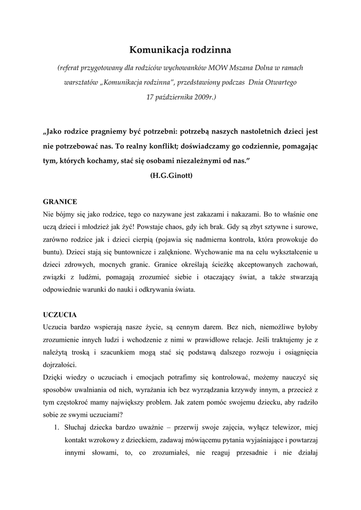 Komunikacja rodzinna (referat przygotowany dla rodziców wychowanków MOW Mszana Dolna w ramach warsztatów „Komunikacja rodzinna”, przedstawiony podczas Dnia Otwartego 17 października 2009r.) „Jako rodzice pragniemy być potrzebni: potrzebą naszych nastoletnich dzieci jest nie potrzebować nas. To realny konflikt; doświadczamy go codziennie, pomagając tym, których kochamy, stać się osobami niezależnymi od nas.” (H.G.Ginott) GRANICE Nie bójmy się jako rodzice, tego co nazywane jest zakazami i nakazami. Bo to właśnie one uczą dzieci i młodzież jak żyć! Powstaje chaos, gdy ich brak. Gdy są zbyt sztywne i surowe, zarówno rodzice jak i dzieci cierpią (pojawia się nadmierna kontrola, która prowokuje do buntu). Dzieci stają się buntownicze i zalęknione. Wychowanie ma na celu wykształcenie u dzieci zdrowych, mocnych granic. Granice określają ścieżkę akceptowanych zachowań, związki z ludźmi, pomagają zrozumieć siebie i otaczający świat, a także stwarzają odpowiednie warunki do nauki i odkrywania świata. UCZUCIA Uczucia bardzo wspierają nasze życie, są cennym darem. Bez nich, niemożliwe byłoby zrozumienie innych ludzi i wchodzenie z nimi w prawidłowe relacje. Jeśli traktujemy je z należytą troską i szacunkiem mogą stać się podstawą dalszego rozwoju i osiągnięcia dojrzałości. Dzięki wiedzy o uczuciach i emocjach potrafimy się kontrolować, możemy nauczyć się sposobów uwalniania od nich, wyrażania ich bez wyrządzania krzywdy innym, a przecież z tym częstokroć mamy największy problem. Jak zatem pomóc swojemu dziecku, aby radziło sobie ze swymi uczuciami? 1. Słuchaj dziecka bardzo uważnie – przerwij swoje zajęcia, wyłącz telewizor, miej kontakt wzrokowy z dzieckiem, zadawaj mówiącemu pytania wyjaśniające i powtarzaj innymi słowami, to, co zrozumiałeś, nie reaguj przesadnie i nie działaj natychmiastowo ( impulsywna reakcja sprawia, że dzieci boją się tego, co może się zdarzyć w przyszłości, a to prowadzi do zerwania linii porozumienia. Dobre słuchanie zakłada akceptację, i mimo tego, że czasem nie rozumiemy dziecka powinniśmy się wystrzegać od wyśmiewania go i krytykowania. Gdy dziecko zostanie przez rodzica wysłuchane, automatycznie łatwiej przychodzi mu wysłuchanie poglądów rodzica na daną sprawę. Aktywne słuchanie jest jednym z najlepszych sposobów ułatwiających komunikację. 2. Akceptuj jego uczucia (och…,mmm…,rozumiem). Dziecko, tak jak dorosły, potrzebuje zrozumienia, kiedy przeżywa silne uczucia. Nie jest w stanie wtedy nikogo słuchać. Nie przyjmuje rady, pocieszenia ani konstruktywnej krytyki. Najczęściej dzieci same sobie radzą, gdy się je wysłucha i okaże im zrozumienie (empatyczna odpowiedź). Dla nas, jako rodziców często ważniejsze jest niestety jak dziecko się zachowuje, a nie to, co czuje. Walczymy z dzieckiem, aby nie czuło tego, co czuje, zamiast pomóc mu się z tym uporać. 3. Określ uczucia. 4. Zamień pragnienia dziecka w fantazje. Wyrażenie pragnień dziecka w formie fantazji, daje mu możliwość przeżycia tego, czego nie może mieć w rzeczywistości. Jeśli mowa o uczuciach, to szalenie istotną rzeczą jest zrozumienie, iż rolą rodziców nie jest pilnowanie, by dziecko było szczęśliwe, ale by dojrzewało, a w tym pomaga przeżywanie żalu, gniewu, rozczarowania. Ochranianie dziecka przed tymi uczuciami nie nauczy je , jak sobie z nimi radzić. ZACHĘCANIE DO WSPÓŁPRACY Niejednokrotnie drogą rodziców do przekazywania wartości jest wydawanie poleceń: „zrób to”, „nie rób tego”. Czy jednak to jest właściwa droga? Niestety nie, co wyjaśnia fakt, iż wartości są przez dziecko przyswajane i stają się jego własnością tylko przez identyfikacje z osobami, które kocha i szanuje i dlatego stara się je naśladować. Chcąc zachęcić nasze dzieci do współpracy często nieprecyzyjnie formułujemy oczekiwania wobec niego, np. „weź się w garść”, „uspokój się”, „przestań”. Właściwy komunikat daję nam szansę powodzenia. Warto więc znać słowa klucze, które zdecydowanie ułatwiają nam zachęcanie dziecka do współpracy, np.: „zależy mi na…”, „potrzebuję…”, „oczekuję…”. Niestety zachęcanie naszych dzieci do współpracy wiąże się z problemem stawiania im pewnych ograniczeń. Jako rodzice powinniśmy być świadomi pewnych niebezpieczeństw czyhających na nas w drodze do osiągnięcia porozumienia. Tymi niebezpieczeństwami są niekorzystne metody postępowania stosowane przez rodziców, w celu na przykład nakłonienia dziecka do posłuszeństwa: groźby („jeśli tego nie zrobisz, to…”), przekupstwo („jeśli zrobisz, to dam Ci…”), obietnice, krytyka i sarkazm (rodzice uważają, że w ten sposób wpłynął na ambicje dziecka), porównywanie („a widzisz syn sąsiadki, to…”), poniżanie („jesteś głupi, zawsze o tym wiedziałem, do niczego się nie nadajesz, Ty niedorajdo…”). W czasie przeżywania silnych emocji, chociażby w sytuacjach konfliktowych z dziećmi, rodzice popełniają błędy: podejmują restrykcje chaotyczne, obraźliwe, nieadekwatne, zapominają, że w czasie przeżywania silnych uczuć dziecko nie jest w stanie słuchać, stosują słowa, które wzmacniają opór, a nie skłaniają do porozumienia. Pytanie zatem, co robić aby dzieci słuchały rodziców i aby do nich mówiły? Warto pamiętać o kilku zasadach: 1. Mówić o swoich uczuciach, które są efektem zachowania drugiej osoby: „Złoszczę się kiedy muszę odbierać Cię z Policji”, „Martwi mnie, że opuściłeś cały tydzień zajęć szkolnych” 2. Mówić o konkretnych zachowaniach drugiej osoby, a nie o tym jaka ona jest: „Złoszczę się kiedy muszę odbierać Cię z Policji”, zamiast „Jesteś bandytą!” 3. Nie oceniać i nie dawać rad 4. Unikać uogólnień typu: „zawsze”, „każdy”, „wszyscy” 5. Stosuj komunikaty typu „ja”, a n