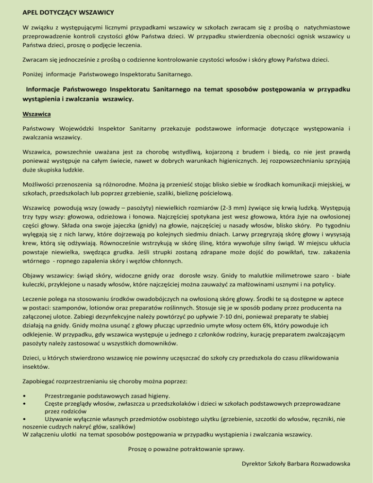 APEL DOTYCZĄCY WSZAWICY W związku z występującymi licznymi przypadkami wszawicy w szkołach zwracam się z prośbą o natychmiastowe przeprowadzenie kontroli czystości głów Państwa dzieci. W przypadku stwierdzenia obecności ognisk wszawicy u Państwa dzieci, proszę o podjęcie leczenia. Zwracam się jednocześnie z prośbą o codzienne kontrolowanie czystości włosów i skóry głowy Państwa dzieci. Poniżej informacje Państwowego Inspektoratu Sanitarnego. Informacje Państwowego Inspektoratu Sanitarnego na temat sposobów postępowania w przypadku wystąpienia i zwalczania wszawicy. Wszawica Państwowy Wojewódzki Inspektor Sanitarny przekazuje podstawowe informacje dotyczące występowania i zwalczania wszawicy. Wszawica, powszechnie uważana jest za chorobę wstydliwą, kojarzoną z brudem i biedą, co nie jest prawdą ponieważ występuje na całym świecie, nawet w dobrych warunkach higienicznych. Jej rozpowszechnianiu sprzyjają duże skupiska ludzkie. Możliwości przenoszenia są różnorodne. Można ją przenieść stojąc blisko siebie w środkach komunikacji miejskiej, w szkołach, przedszkolach lub poprzez grzebienie, szaliki, bieliznę pościelową. Wszawicę powodują wszy (owady – pasożyty) niewielkich rozmiarów (2-3 mm) żywiące się krwią ludzką. Występują trzy typy wszy: głowowa, odzieżowa i łonowa. Najczęściej spotykana jest wesz głowowa, która żyje na owłosionej części głowy. Składa ona swoje jajeczka (gnidy) na głowie, najczęściej u nasady włosów, blisko skóry. Po tygodniu wylęgają się z nich larwy, które dojrzewają po kolejnych siedmiu dniach. Larwy przegryzają skórę głowy i wysysają krew, którą się odżywiają. Równocześnie wstrzykują w skórę ślinę, która wywołuje silny świąd. W miejscu ukłucia powstaje niewielka, swędząca grudka. Jeśli strupki zostaną zdrapane może dojść do powikłań, tzw. zakażenia wtórnego - ropnego zapalenia skóry i węzłów chłonnych. Objawy wszawicy: świąd skóry, widoczne gnidy oraz dorosłe wszy. Gnidy to malutkie milimetrowe szaro - białe kuleczki, przyklejone u nasady włosów, które najczęściej można zauważyć za małżowinami usznymi i na potylicy. Leczenie polega na stosowaniu środków owadobójczych na owłosioną skórę głowy. Środki te są dostępne w aptece w postaci: szamponów, lotionów oraz preparatów roślinnych. Stosuje się je w sposób podany przez producenta na załączonej ulotce. Zabiegi dezynfekcyjne należy powtórzyć po upływie 7-10 dni, ponieważ preparaty te słabiej działają na gnidy. Gnidy można usunąć z głowy płucząc uprzednio umyte włosy octem 6%, który powoduje ich odklejenie. W przypadku, gdy wszawica występuje u jednego z członków rodziny, kurację preparatem zwalczającym pasożyty należy zastosować u wszystkich domowników. Dzieci, u których stwierdzono wszawicę nie powinny uczęszczać do szkoły czy przedszkola do czasu zlikwidowania insektów. Zapobiegać rozprzestrzenianiu się choroby można poprzez: • • Przestrzeganie podstawowych zasad higieny. Częste przeglądy włosów, zwłaszcza u przedszkolaków i dzieci w szkołach podstawowych przeprowadzane przez rodziców • Używanie wyłącznie własnych przedmiotów osobistego użytku (grzebienie, szczotki do włosów, ręczniki, nie noszenie cudzych nakryć głów, szalików) W załączeniu ulotki na temat sposobów postępowania w przypadku wystąpienia i zwalczania wszawicy. Proszę o poważne potraktowanie sprawy. Dyrektor Szkoły Barbara Rozwadowska