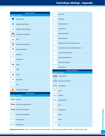 obiekty punktowe Legenda obiekty punktowe Legenda obiekty punktowe obiekty punktowe obiekty Legenda obiekty punktowe punktowe Legenda Legenda Legenda Legenda obiekty punktowe Legenda obiekty obiektypunktowe punktowe Legenda obiekty punktowe obiekty punktowe Legenda obiekty punktowe Legenda obiekty punktowe Legenda obiekty punktowe Legenda obiekty punktowe obiekty punktowe Legenda Legenda obiekty punktowe Legenda obiekty punktowe Legenda obiekty punktowe Legenda obiekty punktowe Legenda obiekty punktowe Obiekty Punktowe Wygląd Znaczenie siedziba RZGW siedziba Zarzadu Zlewni siedziba Nadzoru Wodnego oznakowanie nawigacyjne śluza punktowe obiekty obiekty punktowe wodowskaz automatyczny łata wodowskazowa obiekty pol obiekty liniowe obiekty liniowe obsługi – legendaobiekty pol Instrukcja obiekty pol obiekty liniowe obiekty pol obiekty liniowe obiekty obiekty obiekty pol pol obiekty liniowe liniowe obiekty liniowe rzeka, ciek obiekty liniowe obiekty liniowe obiekty liniowe obiekty liniowe obiektyautostrada liniowe obiekty liniowe obiekty liniowe ekspresowa obiektydroga liniowe obiekty liniowe krajowa obiektydroga liniowe obiekty liniowe obiektydroga liniowe wojewódzka obiekty liniowe obiektydroga liniowe powiatowa obiekty liniowe obiektydroga liniowe gminna na terenie zabudowanym obiekty pol obiekty obiektypolig pol obiekty polig obiekty pol obiekty polig obiekty polig obiekty polig obiekty polig obiekty polig obiekty polig obiekty polig obiekty polig obiekty polig obiekty polig obiekty polig obiekty polig droga gminna na terenie niezabudowanym droga wewnątrzosiedlowa kilometraż droga niesklasyfikowana hektometraż droga nieutwardzona zdjęcie linia kolejowa dalba obiekty liniowe Wygląd Znaczenie obiekty liniowe nabrzeże obiekty liniowe obiekty liniowe przekroczenie napowietrzne obiekty liniowe obiekty liniowe Obiekty poligonowe obiekty poligonowe Wygląd Znaczenie obiekty poligonowe obiektygranica poligonowe RZGW obiekty poligonowe obiektygranica poligonowe Zarzadu Zlewni obiekty poligonowe obiektyśluzapoligonowe poligon obiekty poligonowe obiekty poligonowe obiektymostpoligonowe obiekty poligonowe obiektybudowla poligonowe obiekty poligonowe obiektyzbiornik poligonowe wodny obiekty poligonowe obiektyportpoligonowe obiekty poligonowe przekroczenie nawodne województwo przekroczenie podwodne powiat linia brzegowa gmina droga wodna las Objaśnienia skrótów: WWŻ – najwyższa woda żeglowna, NPP – normalny poziom piętrzenia, SWW – średnia wielka woda www.informator.gliwice.rzgw.gov.pl obiekty liniowe obiekty miasto liniowe obiekty liniowe obiekty liniowe miejscowość obiekty liniowe obiekty liniowe wieś obiekty liniowe obiekty liniowe obiekty liniowe Informacje i ostrzeżenia obiekty liniowe Obiekty liniowe obiekty liniowe Informator nawigacyjny · wybrane oznaczenie nawigacyjne Symbol A.1 Podstawowe znaki żeglugowe wg załącznika nr 7 przepisów żeglugowych Znaczenie znaku A. Znaki zakazu Wygląd Symbol B.8 Zakaz przejścia B.9a A.2 Zakaz wyprzedzania A.3 Zakaz wyprzedzania (dotyczy zestawów) A.4 Zakaz mijania i wyprzedzania A.5 Zakaz postoju (na kotwicy lub na cumach przy brzegu) A.5.1 Zakaz postoju na szerokości określonej na znaku w metrach (od znaku) A.6 Zakaz kotwiczenia, wleczenia kotwicy, łańcucha lub liny A.7 Zakaz cumowania do brzegu A.8 Zakaz zawracania A.9 Zakaz wytwarzania fali A.10 Zakaz przejścia poza skrajnią określoną tablicami (pod mostem, przez jaz) A.11 Zakaz przejścia - przygotować do wejścia lub przejścia A.12 Zakaz ruchu statków o napędzie mechanicznym B.9b B.10 Podstawowe znaki żeglugowe wg załącznika nr 7 przepisów żeglugowych Znaczenie znaku Nakaz zachowania szczególnej ostrożności Nakaz zachowania szczególnej ostro|no[ci. Wyj[cie na gBówn drog dozwolone, gdy nie zmusi to statków na tej drodze do zmiany kursu lub prdko[ci Nakaz zachowania szczególnej ostrożności przy przecinaniu drogi wodnej, które może mieć miejsce, gdy nie zmusza to statków do zmiany kursu lub prędkości Nakaz zmiany kursu lub prędkości przez statki idące drogą główną w sytuacjach, gdy z portu lub bocznej drogi wodnej wychodzą statki B.11a Nakaz prowadzenia nasłuchu radiotelefonicznego B.11b Nakaz prowadzenia nasłuchu radiotelefonicznego na wskazanym kanale C. Znaki ograniczenia Ograniczona głębokość C.2 Ograniczona wysokość prześwitu nad zwierciadłem wody C.3 Ograniczona szerokość szlaku lub kanału żeglownego C.4 Inne ograniczenia ruchu żeglugowego C.5 Granica szlaku żeglownego oddalona od brzegu w metrach podanych liczbą na znaku D. Znaki zalecenia Zakaz ruchu statków używanych wyłącznie do uprawiania sportu lub rekreacji Zakaz uprawiania narciarstwa wodnego oraz holowania statków powietrznych za statkiem D.1a Zalecenie przejścia w obydwu kierunkach D.1b Zalecenie przejścia w jednym kierunku (przejście z przeciwnego kierunku zabronione) A.15 Zakaz ruchu statków żaglowych D.2 Zalecenie trzymania się we wskazanym obszarze A.16 Zakaz ruchu statków, które nie są statkami o napędzie mechanicznym i żaglowym D.3 Zalecenie przejścia w kierunku określonym strzałką lub w nocy w kierunku światła izofazowego A.17 Zakaz pływania na desce z żaglem A.18 Koniec strefy, w której małe statki używane wyłącznie do uprawiania sportu lub rekreacji mogły rozwijać duże prędkości A.13 A.14 A.19 Zakaz wodowania i wciągania statków na brzeg A.20 Zakaz ruchu skuterów wodnych E. Znaki informacyjne B. Znaki nakazu www.informator.gliwice.rzgw.gov.pl C.1 E.1 Zezwolenie przejścia (Znak ogólny) E.2 Wskazanie linii napowietrznej nad drogą wodną (liczba w prawym dolnym rogu oznacza wysokość linii napowietrznej nad poziomem najwyższej wody żeglownej) E.3 Jaz w bliskiej odległości E.4a Prom na uwięzi Prom przemieszczający się swobodnie B.1 Nakaz ruchu w kierunku wskazanym przez znak E.4b B.2a Nakaz skierowania statku na tę stronę szlaku żeglownego, która leży z lewej strony burty E.5 B.2b Nakaz ski