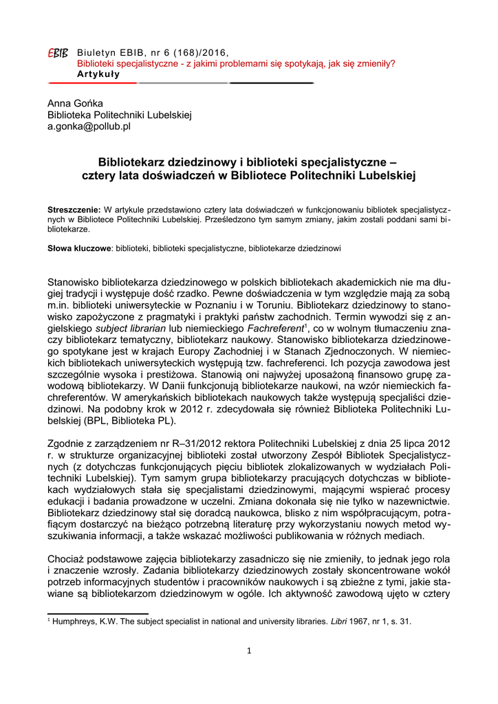 Biulet yn EBIB, nr 6 (168)/2016, Biblioteki specjalistyczne - z jakimi problemami się spotykają, jak się zmieniły? Artykuły Anna Gońka Biblioteka Politechniki Lubelskiej [email protected] Bibliotekarz dziedzinowy i biblioteki specjalistyczne – cztery lata doświadczeń w Bibliotece Politechniki Lubelskiej Streszczenie: W artykule przedstawiono cztery lata doświadczeń w funkcjonowaniu bibliotek specjalistycznych w Bibliotece Politechniki Lubelskiej. Prześledzono tym samym zmiany, jakim zostali poddani sami bi bliotekarze. Słowa kluczowe: biblioteki, biblioteki specjalistyczne, bibliotekarze dziedzinowi Stanowisko bibliotekarza dziedzinowego w polskich bibliotekach akademickich nie ma długiej tradycji i występuje dość rzadko. Pewne doświadczenia w tym względzie mają za sobą m.in. biblioteki uniwersyteckie w Poznaniu i w Toruniu. Bibliotekarz dziedzinowy to stanowisko zapożyczone z pragmatyki i praktyki państw zachodnich. Termin wywodzi się z angielskiego subject librarian lub niemieckiego Fachreferent1, co w wolnym tłumaczeniu znaczy bibliotekarz tematyczny, bibliotekarz naukowy. Stanowisko bibliotekarza dziedzinowego spotykane jest w krajach Europy Zachodniej i w Stanach Zjednoczonych. W niemieckich bibliotekach uniwersyteckich występują tzw. fachreferenci. Ich pozycja zawodowa jest szczególnie wysoka i prestiżowa. Stanowią oni najwyżej uposażoną finansowo grupę zawodową bibliotekarzy. W Danii funkcjonują bibliotekarze naukowi, na wzór niemieckich fachreferentów. W amerykańskich bibliotekach naukowych także występują specjaliści dziedzinowi. Na podobny krok w 2012 r. zdecydowała się również Biblioteka Politechniki Lubelskiej (BPL, Biblioteka PL). Zgodnie z zarządzeniem nr R–31/2012 rektora Politechniki Lubelskiej z dnia 25 lipca 2012 r. w strukturze organizacyjnej biblioteki został utworzony Zespół Bibliotek Specjalistycznych (z dotychczas funkcjonujących pięciu bibliotek zlokalizowanych w wydziałach Politechniki Lubelskiej). Tym samym grupa bibliotekarzy pracujących dotychczas w bibliotekach wydziałowych stała się specjalistami dziedzinowymi, mającymi wspierać procesy edukacji i badania prowadzone w uczelni. Zmiana dokonała się nie tylko w nazewnictwie. Bibliotekarz dziedzinowy stał się doradcą naukowca, blisko z nim współpracującym, potrafiącym dostarczyć na bieżąco potrzebną literaturę przy wykorzystaniu nowych metod wyszukiwania informacji, a także wskazać możliwości publikowania w różnych mediach. Chociaż podstawowe zajęcia bibliotekarzy zasadniczo się nie zmieniły, to jednak jego rola i znaczenie wzrosły. Zadania bibliotekarzy dziedzinowych zostały skoncentrowane wokół potrzeb informacyjnych studentów i pracowników naukowych i są zbieżne z tymi, jakie stawiane są bibliotekarzom dziedzinowym w ogóle. Ich aktywność zawodową ujęto w cztery 1 Humphreys, K.W. The subject specialist in national and university libraries. Libri 1967, nr 1, s. 31. 1 Biulet yn EBIB, nr 6 (168)/2016, Biblioteki specjalistyczne - z jakimi problemami się spotykają, jak się zmieniły? Artykuły zasadnicze obszary: utrzymywanie kontaktów z uczelnią, polityka gromadzenia i rozwoju zbiorów, kształcenie użytkowników oraz usługi informacyjne. Wraz z powstaniem bibliotek specjalistycznych został opracowany opis stanowisk pracy dla wszystkich pracowników biblioteki. Krok ten okazał się niezwykle istotny z punktu wi dzenia zarządzania instytucją, jaką jest biblioteka. Spowodował, iż jej struktura stała się bardziej przejrzysta i efektywna, ściśle związana ze strategicznymi celami uczelni. Posiadanie opisów stanowisk pracy, zgodnie z teorią zarządzania, świadczy o kulturze organizacyjnej instytucji i jest potrzebne w firmie, by mogła generować zysk. Dla instytucji niedochodowych (takich jak np. biblioteka) ten zysk to określona wartość dodana w ogólnym bilansie firmy. W przypadku bibliotekarza dziedzinowego to np. duża liczba odwiedzin i spotkań osobistych z czytelnikami, którzy usatysfakcjonowani efektami jego pracy ciągle do niego wracają, a co za tym idzie, oceniają jego fachowość i tym samym rangę firmy 2. Zgodnie z opisem stanowiska, bibliotekarz specjalista z biblioteki wydziałowej ma udostępniać zbiory zgromadzone w bibliotece specjalistycznej, szkolić i udzielać informacji w zakresie dostępu do literatury (niezależnie od nośnika) ze specjalności naukowych reprezentowanych na wydziale. Może to przełożyć się pośrednio na wzrost drukowanych i elektronicznych zasobów na danym wydziale. Ponadto bibliotekarz dziedzinowy ma rejestrować dorobek naukowy pracowników ze swojego wydziału. Jednym słowem ma być pracownikiem samodzielnym i wykształconym w danej dziedzinie wiedzy, by móc sprostać wymaganiom swoich użytkowników. Chcąc wyjść naprzeciw zapotrzebowaniu uczelni, bibliotekarz musi mieć rozeznanie w tym, jakie badania są prowadzone na uczelni i jakie kierunki się rozwijają. Na stanowisku bibliotekarza dziedzinowego w pięciu bibliotekach specjalistycznych BPL zatrudnionych jest obecnie dziesięć osób. Większość z nich ma wykształcenie bibliotekarskie (studia magisterskie lub podyplomowe), ponad połowa zespołu to osoby z wykształceniem wyższym kierunkowym, zgodnym z profilem wydziału, na którym pracują. Dzięki temu mogą oni bezbłędnie klasyfikować rzeczowo księgozbiór i udzielać merytorycznych informacji użytkownikom. Sytuacja, w jakiej znaleźli się bibliotekarze dziedzinowi w Bibliotece Politechniki Lubelskiej, wymusiła na nich ciągłe podnoszenie kwalifikacji i umiejętności w zakresie wyszukiwania i selekcjonowania informacji. Dużo czasu poświęcają samokształceniu, działalności informacyjnej, kształceniu użytkowników itp. Starają się być na bieżąco z literaturą specjalistyczną, wydawaną w kraju i na świecie. Wszystko to w celu dotrzymania partnerstwa pracownikom naukowym macierzystej uczelni. 2 Bednar