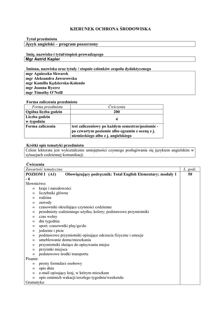 KIERUNEK OCHRONA ŚRODOWISKA Tytuł przedmiotu Język angielski – program poszerzony Imię, nazwisko i tytuł/stopień prowadzącego Mgr Astrid Kapler Imiona, nazwiska oraz tytuły / stopnie członków zespołu dydaktycznego mgr Agnieszka Skwarek mgr Aleksandra Jaworowska mgr Kamilla Kędzierska-Kolendo mgr Joanna Rycerz mgr Timothy O’Neill Forma zaliczenia przedmiotu Forma przedmiotu Ćwiczenia Ogólna liczba godzin 200 Liczba godzin 4 w tygodniu Forma zaliczenia test zaliczeniowy po każdym semestrze/poziomie po czwartym poziomie albo egzamin z oceną z j. niemieckiego albo z j. angielskiego Krótki opis tematyki przedmiotu Celem lektoratu jest wykształcenie umiejętności czynnego posługiwania się językiem angielskim w sytuacjach codziennej komunikacji. Ćwiczenia Zawartość tematyczna POZIOM I (A1) Obowiązujący podręcznik: Total English Elementary; moduły 1 -6 Słownictwo: • kraje i narodowości • liczebniki główne • rodzina • zawody • czasowniki określające czynności codzienne • przedmioty codziennego użytku; kolory; podstawowe przymiotniki • czas wolny • dni tygodnia • sport; czasowniki play/go/do • jedzenie i picie • podstawowe przymiotniki opisujące odczucia fizyczne i emocje • umeblowanie domu/mieszkania • przymiotniki służące do opisywania miejsc • przyimki miejsca • podstawowe środki transportu Pisanie: • prosty formularz osobowy • opis dnia • e-mail opisujący kraj, w którym mieszkam • opis ostatnich wakacji/zeszłego tygodnia/weekendu Gramatyka: L. godz. 50 • • • • • • • • • • • • • • • • czasownik to be przedimek nieokreślony a/an zaimki osobowe w formie podmiotu (I/you/she, itp.) przymiotniki dzierżawcze oraz konstrukcja possessive 's czas Present Simple zaimki wskazujące liczba mnoga rzeczowników czasownik can/can't rzeczowniki policzalne i niepoliczalne przedimek nieokreślony a/an oraz określniki some/any zaimki osobowe w formie dopełnienia (me/you/him, itp.) konstrukcja: I'd like konstrukcja: there is/there are czasownik have got przysłówki very/really/quite czas Past Simple POZIOM II (A1) Obowiązujący podręcznik: Total English Elementary; moduły 7 - 12 Słownictwo: • wygląd zewnętrzny • liczebniki porządkowe • nazwy miesięcy/daty • wybrane czasowniki frazowe • ubrania • pogoda • zdrowie • media • film • sztuka • podróże • środki transportu • ruch uliczny • edukacja • plany i ambicje Pisanie: • list do przyjaciela • opis osoby • list/notatka z prośbą • prosty list z zażaleniem • krótka recenzja filmu • pocztówka z wakacji Gramatyka: • zaimek one/ones • zaimki dzierżawcze • czas Past Simple • czas Present Continuous/czas Present Simple (przysłówki częstotliwości) • stopniowanie przymiotników • czasownik will - wyrażanie spontanicznych decyzji i propozycji • czas Present Perfect (wprowadzenie) • czasowniki modalne can/can't have to/don't have to • czas Present Continuous (dot. planów na przyszłość) • konstrukcja: going to • konstrukcje: czasownik + bezokolicznik/forma -ing (want/would like/like, itp.) 50 POZIOM III (A2) moduły 1 - 6 Obowiązujący podręcznik: Total English Pre-intermediate, 50 Zakres słownictwa • sklepy i zakupy • zainteresowania i preferencje • muzyka • biografie • słowotwórstwo: przymiotniki i rzeczowniki • plany na przyszłość • związki wyrazowe: wyrażenia dotyczące osiągnięć życiowych • jedzenie i restauracje • film • czasowniki określające zmysły • opis osoby • słownictwo związane z przetrwaniem w ekstremalnych sytuacjach • tzw. "survival English" • zwyczaje i przyzwyczajenia • cechy geograficzne • przyroda i środowisko naturalne • urządzenia domowe Komunikacja • rozmowa/wypowiedź dotycząca osiągnięć i planów na przyszłość • udział w prostej dyskusji • zadawanie uprzejmych pytań (indirect questions) • uzgadnianie wspólnego wyboru z drugą osobą • wymiana opinii • przeprowadzenie krótkiej (nieformalnej) prezentacji • uzasadnianie dokonanego wyboru Wypowiedź pisemna • list do przyjaciela dotyczący zmian w twoim życiu • list do znajomego z zaproszeniem • list/notatka z podziękowaniem • opis osoby • opis ulubionego miejsca Zagadnienia gramatyczne • czas Present Simple (powtórzenie); przysłówki częstotliwości • czas Present Continuous (wyrażanie teraźniejszości i przyszłości) • czas Past Simple • wyrażenia so/neither • czas Present Perfect Simple • konstrukcja "going to" • zaimki względne; zdania definiujące (which/who/where/ itp.) • stopniowanie przymiotników • czasowniki modalne should/can/have to • konstrukcja "used to" • czas Future Simple • określniki too/too much/too many/enough • różne użycia "like" POZIOM IV (A2) moduły 7 - 12 Obowiązujący podręcznik: Total English Pre-intermediate, Zakres słownictwa • wygląd zewnętrzny • osobowość 50 • • • • • • • • • • choroba i złe samopoczucie czasowniki frazowe literatura praca czasowniki make i do przestępczość świat zwierząt typowe związki wyrazowe: czasownik + przyimek zwyczaje w różnych częściach świata wakacje i podróże Komunikacja • udzielanie rad • dłuższa wypowiedź na znany temat • udział w rozmowie o pracę • wypowiedź dotycząca umiejętności • udział w prostych negocjacjach • udział w dyskusji mającej na celu podjęcie grupowej decyzji • prowadzenie typowej rozmowy w czasie podróży • wypowiedź na temat sytuacji hipotetycznych • relacjonowanie wypowiedzi innych osób • składanie reklamacji w sklepie/restauracji Wypowiedź pisemna • krótki artykuł • opis miejsca odwiedzonego w czasie podróży • list formalny z prośbą o informacje/radę • opinia na forum internetowym • opowiadanie Zagadnienia gramatyczne • tryby warunkowe: pierwszy i drugi • związki wyrazowe: czasownik + ge