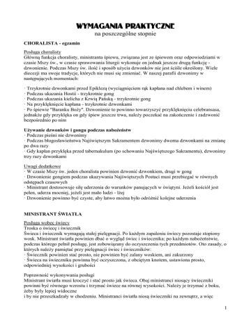 WYMAGANIA PRAKTYCZNE na poszczególne stopnie CHORALISTA - egzamin Posługa choralisty Główną funkcja choralisty, ministranta śpiewu, związana jest ze śpiewem oraz odpowiedziami w czasie Mszy św., w czasie sprawowania liturgii wykonuje on jednak jeszcze drugą funkcję dzwonienie. Podczas Mszy św. ilość i sposób użycia dzwonków nie jest ściśle określony. Wiele diecezji ma swoje tradycje, których nie musi się zmieniać. W naszej parafii dzwonimy w następujących momentach: · Trzykrotnie dzwonkami przed Epiklezą (wyciągnięciem rąk kapłana nad chlebem i winem) · Podczas ukazania Hostii - trzykrotnie gong · Podczas ukazania kielicha z Krwią Pańską - trzykrotnie gong · Na przyklęknięcie kapłana - trzykrotnie dzwonkami · Po śpiewie "Baranku Boży". Dzwonienie to powinno towarzyszyć przyklęknięciu celebransasa, jednakże gdy przyklęka on gdy śpiew jeszcze trwa, należy poczekać na zakończenie i zadzwonić bezpośrednio po nim Używanie dzwonków i gongu podczas nabożeństw · Podczas pieśni nie dzwonimy · Podczas błogosławieństwa Najświętszym Sakramentem dzwonimy dwoma dzwonkami na zmianę po dwa razy · Gdy kapłan przyklęka przed tabernakulum (po schowaniu Najświętszego Sakramentu), dzwonimy trzy razy dzwonkami Uwagi dodatkowe · W czasie Mszy św. jeden choralista powinien dzwonić dzwonkiem, drugi w gong · Dzwonienie gongiem podczas ukazywania Najświętszych Postaci musi przebiegać w równych odstępach czasowych · Ministrant dostosowuje siłę uderzenia do warunków panujących w świątyni. Jeżeli kościół jest pełen, uderza mocniej, jeżeli jest mało ludzi - lżej · Dzwonienie powinno być czyste, aby łatwo można było odróżnić kolejne uderzenia MINISTRANT ŚWIATŁA Posługa wobec świecy Troska o świecę i świecznik Świeca i świecznik wymagają stałej pielęgnacji. Po każdym zapaleniu świecy pozostaje stopiony wosk. Ministrant światła powinien dbać o wygląd świec i świecznika; po każdym nabożeństwie, podczas którego pełnił posługę, jest zobowiązany do oczyszczenia tych przedmiotów. Oto zasady, o których należy pamiętać przy pielęgnacji świec i świeczników: · Świecznik powinien stać prosto, nie powinien być zalany woskiem, ani zakurzony · Świeca na świeczniku powinna być oczyszczona, z obciętym knotem, ustawiona prosto, odpowiedniej wysokości i grubości Poprawność wykonywania posługi Ministrant światła musi kroczyć i stać prosto jak świeca. Obaj ministranci niosący świeczniki powinni być równego wzrostu i trzymać świece na równej wysokości. Należy je trzymać z boku, żeby były lepiej widoczne i by nie przeszkadzały w chodzeniu. Ministranci światła niosą świeczniki na zewnątrz, a więc 1 prawy trzyma świecznik po prawej, lewy zaś po lewej stronie. Przy zwrotach wstecz przekłada się świeczniki z jednej ręki w drugą. Ministrant z prawej strony bierze lewą ręką świecznik za jego podstawę, prawą zaś ujmuje go w połowie. Lewy na odwrót; bierze podstawę prawą ręką, a świecznik ujmuje lewą. Wysokość, na której niesiemy świecznik zależy od wysokości samego świecznika i świecy. W procesji Wejścia ministranci światła idą po bokach krucyferariusza; za ministrantami kadzidła. Ministranci światła nigdy nie przyklękają ani nie czynią skłonu ze świecami w ręce. Czynią to po złożeniu świec na ołtarzu, natomiast przy procesji Wyjścia - przed wzięciem ich z ołtarza. Podczas czytania Ewangelii zwracają się twarzą do siebie stojąc w takim miejscu, by nie zasłaniać czytającego, a równocześnie, by nie być w zbyt dużej odległości od ambony. Świece powinny być na jednej wysokości nawet, gdy ministranci nie stoją na jednym poziomie. Posługa wobec pochodni Troska o pochodnię Pochodnia jest wykonana z drewna. Powinna mieć około 100 cm długości i około 5 cm średnicy. U góry umieszcza się talerzyk zabezpieczający przed kapaniem wosku, a nad nim otwór do wkładania świecy. Świeca w pochodni jest krótka (ok. 20 cm). Ministrant światła niosący pochodnię stara się o: · czystość świecy i całej pochodni · to, aby świeca stała prosto Poprawność służenia Pochodnie może nieść większa liczba ministrantów. Zawsze jednak powinna być to parzysta liczba, a każda para powinna być równego wzrostu i trzymać pochodnie na jednej wysokości. Pochodnie nosimy zawsze na zewnątrz procesji. Ministrant idący po prawej stronie trzyma pochodnię w prawej ręce, idący po lewej stronie - w lewej ręce. Druga ręka spoczywa na piersi. W podobny sposób trzymają ministranci pochodnie w czasie przyklękania lub klęczenia. Uwagi · Ministranci światła uważają, aby w czasie swojej posługi nie rozlewać wosku na posadzkę, ołtarz lub inne miejsce. · Należy do tej posługi dobierać ministrantów jednakowego wzrostu. · Jeżeli procesja przechodzi wąskim przejściem i ministranci światła (niosący świece) nie mogą iść obok krzyża - idą przed krzyżem. MINISTRANT KSIĘGI Posługa ministranta księgi Poprawność pełnienia posługi Jeżeli ministrant bierze do ręki mszał, aby go podać kapłanowi, czyni to w następujący sposób: · ustawia się z zewnętrznej strony Celebransa, nie od strony środka kościoła, · stoi w taki sposób, aby nie zasłaniać kapłana wiernym i nie zasłaniać mikrofonu, · mszał opiera na ręce zwróconej w stronę kapłana, trzymając go w narożniku od spodu. Drugą ręką otwiera mszał, przewraca strony i zamyka go. Po zakończeniu modlitwy wiernych ministrant księgi kładzie mszał na podstawce i ustawia po lewej stronie ołtarza. Po komunii św. składa mszał i zabiera go. MINISTRANT OŁTARZA Posługa ministranta ołtarza 2 Posługa ministranta ołtarza jest jedną z najczęściej spełnianych czynności ministranckich. W każdej Mszy św., nie tylko w uroczystych celebracjach, trzeba podawać ampułki, dokonywać obmycia palców kapłana i oczyszc