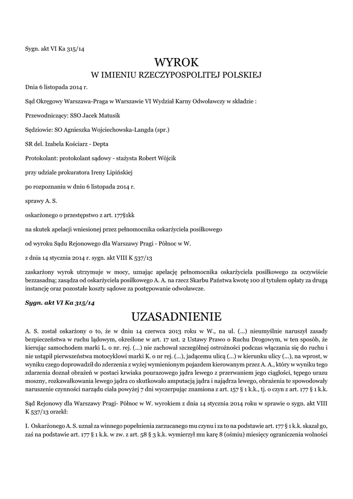 Sygn. akt VI Ka 315/14 WYROK W IMIENIU RZECZYPOSPOLITEJ POLSKIEJ Dnia 6 listopada 2014 r. Sąd Okręgowy Warszawa-Praga w Warszawie VI Wydział Karny Odwoławczy w składzie : Przewodniczący: SSO Jacek Matusik Sędziowie: SO Agnieszka Wojciechowska-Langda (spr.) SR del. Izabela Kościarz - Depta Protokolant: protokolant sądowy - stażysta Robert Wójcik przy udziale prokuratora Ireny Lipińskiej po rozpoznaniu w dniu 6 listopada 2014 r. sprawy A. S. oskarżonego o przestępstwo z art. 177§1kk na skutek apelacji wniesionej przez pełnomocnika oskarżyciela posiłkowego od wyroku Sądu Rejonowego dla Warszawy Pragi - Północ w W. z dnia 14 stycznia 2014 r. sygn. akt VIII K 537/13 zaskarżony wyrok utrzymuje w mocy, uznając apelację pełnomocnika oskarżyciela posiłkowego za oczywiście bezzasadną; zasądza od oskarżyciela posiłkowego A. A. na rzecz Skarbu Państwa kwotę 100 zł tytułem opłaty za drugą instancję oraz pozostałe koszty sądowe za postępowanie odwoławcze. Sygn. akt VI Ka 315/14 UZASADNIENIE A. S. został oskarżony o to, że w dniu 14 czerwca 2013 roku w W., na ul. (...) nieumyślnie naruszył zasady bezpieczeństwa w ruchu lądowym, określone w art. 17 ust. 2 Ustawy Prawo o Ruchu Drogowym, w ten sposób, że kierując samochodem marki L. o nr. rej. (...) nie zachował szczególnej ostrożności podczas włączania się do ruchu i nie ustąpił pierwszeństwa motocyklowi marki K. o nr rej. (...), jadącemu ulicą (...) w kierunku ulicy (...), na wprost, w wyniku czego doprowadził do zderzenia z wyżej wymienionym pojazdem kierowanym przez A. A., który w wyniku tego zdarzenia doznał obrażeń w postaci krwiaka pourazowego jądra lewego z przerwaniem jego ciągłości, tępego urazu moszny, rozkawałkowania lewego jądra co skutkowało amputacją jądra i najądrza lewego, obrażenia te spowodowały naruszenie czynności narządu ciała powyżej 7 dni wyczerpując znamiona z art. 157 § 1 k.k., tj. o czyn z art. 177 § 1 k.k. Sąd Rejonowy dla Warszawy Pragi- Północ w W. wyrokiem z dnia 14 stycznia 2014 roku w sprawie o sygn. akt VIII K 537/13 orzekł: I. Oskarżonego A. S. uznał za winnego popełnienia zarzucanego mu czynu i za to na podstawie art. 177 § 1 k.k. skazał go, zaś na podstawie art. 177 § 1 k.k. w zw. z art. 58 § 3 k.k. wymierzył mu karę 8 (ośmiu) miesięcy ograniczenia wolności z obowiązkiem wykonywania nieodpłatnych, kontrolowanych prac na cele społeczne w wymiarze 20 (dwudziestu) godzin w stosunku miesięcznym; II. Na podstawie art. 627 k.p.k. zasądził od oskarżonego A. S. na rzecz Skarbu Państwa kwotę 330 (trzysta trzydzieści) złotych tytułem kosztów sądowych, w tym kwotę 180 (sto osiemdziesiąt) złotych tytułem opłaty; III. Na podstawie art. 616 § 1 pkt 2 k.p.k., art. 627 k.p.k. zasądził od oskarżonego A. S. na rzecz oskarżyciela posiłkowego A. A. kwotę 442,80 (czterysta czterdzieści dwa złote i osiemdziesiąt groszy) jako zwrot wydatków z tytułu ustanowienia pełnomocnika. Od powyższego wyroku apelację wniósł pełnomocnik oskarżyciela posiłkowego zaskarżając wyrok w części- to jest w zakresie, w jakim Sąd nie orzekł obowiązku naprawienia szkody na rzecz pokrzywdzonego oraz nie zasądził zwrotu kosztów dojazdu pełnomocnika oskarżyciela posiłkowego do Sądu, pomimo stosownych wniosków w tym przedmiocie. Powyższemu wyrokowi zarzucił: 1. Obrazę prawa materialnego, to jest art. 46 § 1 k.k.: a) przez jego błędną wykładnię i niewłaściwe zastosowanie w sprawie, co wyrażało się nie nałożeniem na oskarżonego obowiązku naprawienia wyrządzonej szkody- w wysokości wskazanej we wniosku, wobec dowolnego i nieuprawnionego przyjęcia, iż w chwili orzekania szkoda nie istniała, z uwagi na zawartą pozasądową ugodę pokrzywdzonego z ubezpieczycielem, b) przez błędną wykładnię wyżej wymienionego przepisu, wobec nieuprawnionego przyjęcia, że istnienie szkody- w chwili orzekania, determinuje treść ugody zawartej przez pokrzywdzonego, z ubezpieczycielem, nie zaś stan faktyczny w dacie wydania orzeczenia- wskazujący, iż pokrzywdzony nie otrzymał od ubezpieczyciela oskarżonego- oczekiwanej, a zarazem niewygórowanej kwoty, tytułem odszkodowania za trwały uszczerbek na zdrowiu i zadośćuczynienia za doznany ból fizyczny i cierpienia psychiczne. Poszkodowany, jak to wynika z treści jego zeznań, do których Sąd się nie ustosunkował, z oczywistych przyczyn o naturze pragmatycznej, zdecydował się na podpisanie ugody z (...)- zrzekając się jedynie w stosunku do ubezpieczyciela dalszych roszczeń. Powyższe było warunkiem koniecznym otrzymania dodatkowych 20.000,00 złotych- przy żądanych dodatkowych 45.000,00 złotych. Brak zgody na zawarcie ugody pozasądowej, oznaczałby konieczność dochodzenia każdej kwoty- ponad bezspornie przyznane 30.000,00 złotychbezpośrednio od oskarżonego, niedysponującego takimi środkami majątkowymi- w procesie karnym, bądź na drodze kosztownego i długotrwałego procesu cywilnego od ubezpieczyciela. 2. Obrazę przepisów prawa materialnego- art. 616 § 1 pkt 2 k.p.k. i art. 627 k.p.k. przez jego niepełne zastosowanie, wobec odstąpienia od orzeczenia pełnego zwrotu kosztów- wydatków na rzecz oskarżyciela posiłkowego. Powyższe wyrażało się nieuwzględnieniem wniosku złożonego na posiedzeniu w dniu 25 października 2013 rok- w przedmiocie zwrotu kosztów dojazdu w kwocie 322 złotych. Sąd w dniu 16 października 2013 roku, wezwał pełnomocnika oskarżyciela posiłkowego do obowiązkowego osobistego stawiennictwa- na termin w dniu 25 października, realizacja tego obowiązku wygenerowała koszty, o zwrot których pełnomocnik wniósł, a które w wyroku nie zostały zasądzone. Oskarżony nie kwestionował kosztów, co do ich wysokości, a jedynie zasadę- obowiązku pokrycia kosztów pełnomocnika dojeżdżającego spoza W.. Koszty te jako stanowiły wydatek oskarżyciela posiłkowego związane z ustanowieni