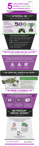 5 PORAD, KTÓRE POMOGĄ STWORZYĆ (I PRZETRWAĆ) TWOJĄ PIERWSZĄ GRĘ 3D WYRÓŻNIJ SIĘ Odkryj trzeci wymiar. Stwórz projekt 3D, który będzie się wyróżniał wśród wszystkich gier 2D i wykorzystaj możliwości dzisiejszych urządzeń mobilnych. 500 aplikacji debiutuje w App Store każdego dnia Gry są najpopularniejszą kategorią w sklepie i stanowią 22% z około 1.5 milliona dostępnych aplikacji No.1 Główne zalety procesu produkcji gier w 3D: Elastyczność i łatwość wprowadzania zmian (poprawianie ręcznie rysowanych obrazków 2D zajmuje wyjątkowo dużo czasu) Każdy element 3D można łatwo stworzyć i wielokrotnie wykorzystywać Praca na warstwach pozwala na tworzenie rozbudowanych postaci, których części można łatwo wymieniać. Dodawanie (lub zmiana) tekstury sprowadza się tylko do podmiany pojedynczego obrazka Do wzbogacenia wyglądu scen 3D można użyć efektów 2D POSTAW SOBIE REALNE CELE To wymaga czasu! Przygotuj się na pracę w nocy, weekendy oraz wakacje Ciężki dzień pracy przy komputerze? Pamiętaj, że twoja praca jest świetna! Deweloper gier wideo uplasował się na 15. miejscu na liście 100 najlepszych zawodów, stworzonej przez CNNMoney/PayScale. Według listy deweloperzy tak oceniają różne aspekty swojego życia: A A B Osobista satysfakcja Niski poziom stresu Pozytywny wpływ na społeczeństwo NIE ODKRYWAJ AMERYKI NA NOWO Korzystaj z gotowych rozwiązań Tworzysz grę, nie silnik graficzny. Gotowe silniki graficzne i profesjonalne oprogramowanie 3D ułatwią Ci pracę. Stworzenie, obsługa oraz testowanie nowego oprogramowania potrafią być koszmarem. Te prace pochłoną bardzo dużo czasu, cierpliwości i oczywiście budżetu - zakładając, że w ogóle jest jakiś budżet! Rozplanuj projekt i dostosuj sposoby pracy. Poświęcenie czasu na stworzenie generatora poziomów na samym początku, dramatycznie zwiększy wydajność pracy w późniejszym okresie. PROŚ O POMOC! Społeczność, Społeczność, Społeczność Pokazuj fanom zajawki swojej pracy na wczesnym etapie i rób to często. W ten sposób zbudujesz zaangażowaną społeczność zwolenników i propagatorów. Zapoznaj się z innymi profesjonalistami, którzy już kiedyś rozwiązywali podobne problemy. Pokazuj swoją grę na każdym możliwym wydarzeniu branżowym. Szukaj wsparcia lub potencjalnej współpracy wśród znajomych, rodziny i lokalnych firm. Dowiedz się, czy istnieją granty (rządowe lub edukacyjne) dla twórców gier. Nie pomijaj również możliwości crowdfundingu! NIE PRZEGAP SWOJEJ SZANSY Fani zapłacą za dobry produkt Cała branża gier rozwija się w szybkim tempie, a gry mobilne w szczególności! Według Digi-Capital: 2018 Gry stanowiły 32% aplikacji używanych na urządzeniach mobilnych w 2015 roku Przewiduje się, że do roku 2018 gry mobilne będą przynosiły 45 miliardów dolarów przychodu. To wzrost z 29 miliardów w 2015 roku. Przeciętny czas spędzany na graniu w gry mobilne wzrósł o 57% od 2012 roku (The NPD Group). www.autodesk.com/makegames ©2015 Autodesk, Inc. Wszelkie prawa zastrzeżone.