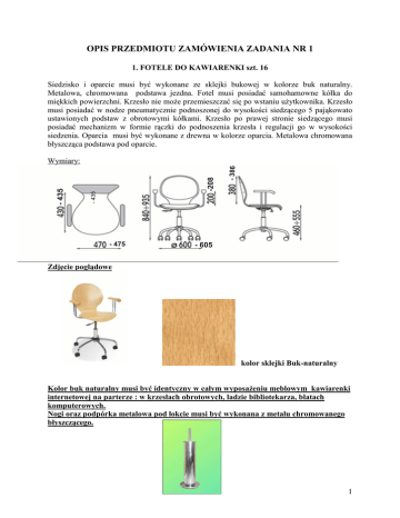 OPIS PRZEDMIOTU ZAMÓWIENIA ZADANIA NR 1 1. FOTELE DO KAWIARENKI szt. 16 Siedzisko i oparcie musi być wykonane ze sklejki bukowej w kolorze buk naturalny. Metalowa, chromowana podstawa jezdna. Fotel musi posiadać samohamowne kółka do miękkich powierzchni. Krzesło nie może przemieszczać się po wstaniu użytkownika. Krzesło musi posiadać w nodze pneumatycznie podnoszonej do wysokości siedzącego 5 pająkowato ustawionych podstaw z obrotowymi kółkami. Krzesło po prawej stronie siedzącego musi posiadać mechanizm w formie rączki do podnoszenia krzesła i regulacji go w wysokości siedzenia. Oparcia musi być wykonane z drewna w kolorze oparcia. Metalowa chromowana błyszcząca podstawa pod oparcie. Wymiary: Zdjęcie poglądowe kolor sklejki Buk-naturalny Kolor buk naturalny musi być identyczny w całym wyposażeniu meblowym kawiarenki internetowej na parterze : w krzesłach obrotowych, ladzie bibliotekarza, blatach komputerowych. Nogi oraz podpórka metalowa pod łokcie musi być wykonana z metalu chromowanego błyszczącego. 1 2. FOTELE OBROTOWE szt. 12 Fotel obrotowy musi być wyposażony w siłownik gazowy regulujący wysokość siedziska. Mechanizm synchrodynamiczny w systemie Freeness lub równoważnym ( musi być wyposażone w automatyczne dopasowanie ruchów siedziska i oparcia do ciężaru użytkownika). Elastyczne oparcie musi być wykonane z profilowanego tworzywa. Tapicerowane żebra oparcia muszą być wykonane w tkaninie o kolorze niebieskim, odporność na ścieralność 100 000 cykli Martindal’a. Profilowane siedzisko z tapicerowaną poduszką musi być obite w kolorze czarnym. Podłokietniki 4D lub równoważny, z regulacją wysokości, szerokości, głębokości i kąta. Krzyżakowe nogi muszą być wykonane z aluminium malowanego proszkowo. Kółka jezdne musza być przeznaczone do podłóg twardych (drewnianych i granitu). Fotel musi posiadać atest niepalności. Przedział parametrów technicznych Wysokość siedziska: od 42-57 cm Głębokość siedziska: od 46 cm - 48 cm Szerokość siedziska: od 49 cm - 51 cm Wysokość fotela : od 100 -120 cm Głębokość fotela: od 67 cm - 71 cm Szerokość fotela: od 67 cm - 71 cm. Zdjęcie poglądowe 3. FOTEL OBROTOWY szt. 58 1. Siedzisko i oparcie musi być zintegrowane z podłokietnikami tapicerowane musi być z każdej strony tkaniną. 2. Metalowa rama siedziska – chrom 3. Nogi w kształcie krzyżaka na obrotowej podstawie przymocowanej do kubełka fotelu. Nogi chromowane błyszczące. Stopki samopoziomujące zabezpieczeniem filcowym. 4. Rozmiar ( wysokość / szerokość / głębokość ): od 775-do778 cm /od 63 cm do 65cm / od 58.5- do 60 cm 5. Obicia z tkaniny typu Contrach (YN) lub równoważnych kolorach i parametrach 2 6. Wymagana kolorystyka tkanin typu Contract: YN204 (fiolet) YN200 (zieleń) YN079 (czerwień) YN097 (niebieski) Tkanina musi posiadać: - odporności na ścieralność 100.000 cykli Martindal’a; - w 100% złożona z poliestru; - atest niepalności 6. Produkt musi posiadać dwuletnią gwarancję jakości. Wymiary na rysunku technicznym Zdjęcie poglądowe: Wymagana kolorystyka tkaniny typu Contract YN 079 czerwień YN 200 zieleń YN 204 fiolet 3 Yn 097 niebieski 4. SOFA szt. 12 Sofa musi być w całości tapicerowana. Obicie musi być tapicerowane tkaniną typu Contract lub równoważną o identycznych właściwościach, kolorze i splocie. Tkanina musi być jednolitej barwy, gęstym splocie włókien, w 100% wykonana z poliestru, odporności na ścieralność 100.000 cykli Martindala. Wymagany jest atest niepalności. Sofa musi być w całości tapicerowana. Nóżki metalowe chromowane błyszczące, stopki samopoziomujące. Fotel musi posiadać dwuletnią gwarancję. Rysunek techniczny z wymiarami Zdjęcie poglądowe Wymagana kolorystyka tkaniny Contract YN 079 czerwień YN200 zieleń YN 204 fiolet YN 097 niebieski 4 STOLIK szt. 20 Stół musi posiadać metalowe chromowane błyszczące nóżki posiadające regulowane stopki. Blat stołu musi być wykonany z płyty melaminowanej MA-NE (klon / jesion) lub o identycznym kolorze. Wymiary blatu – od 55do 57 x od 55 do 57 cm. Wysokość od 46cm do 48 cm Wymagana jest dwuletnia gwarancja jakości. Wymiary na rysunku technicznym Zdjęcie poglądowe 6. STÓŁ ŚREDNI 120x 80 szt. 5 Stół musi posiadać stelaż metalowy, chromowany błyszczący. Blat musi być wykonany z płyty wiórowej, wykończonej po bokach okleiną modyfikowaną o kolorze blatu. Nogi stołu chromowane błyszczące muszą być wyposażone w przegubowe stopki z tworzywa sztucznego Konstrukcja stelaża musi być bez widocznych spawów (w technologii TIG lub równoważnej). Stelaż musi być wyposażony w gumowe dystanse umożliwiające sztaplowanie stołów. Konstrukcja stołu musi umożliwiać sztaplowanie do 4 sztuk. Kolor okładziny blatu brzoza Wymagana okładzina blatu stolika w kolorze brzoza. 5 Przykładowy wygląd Przykładowa możliwość sztaplowania stołów Wymiary i wygląd wysokość całkowita 735 mm szerokość całkowita 800 mm długość całkowita 1200 mm 7. STÓŁ duży 160 x 80 szt. 4 Stół musi posiadać stelaż metalowy, chromowany błyszczący. Blat musi być wykonany z płyty wiórowej, wykończonej po bokach okleiną modyfikowaną o kolorze blatu. Nogi stołu chromowane błyszczące muszą być wyposażone w przegubowe stopki z tworzywa sztucznego. Konstrukcja stelaża musi być bez widocznych spawów (w technologii TIG lub równoważnej). Stelaż musi być wyposażony w gumowe dystanse umożliwiające sztaplowanie stołów. Konstrukcja stołu musi umożliwiać sztaplowanie do 4 sztuk. Wymagany kolor okładziny blatu brzoza. 6 Przykładowy wygląd Przykładowa możliwość sztaplowania stołów Wymiary i wygląd wysokość całkowita 735 mm szerokość całkowita 800 mm długość całkowita 1600 mm 8. STÓŁ mały 80x80 szt. 15 Stół musi posiadać stelaż metalowy, chromowany błyszczący. Blat musi być wykonany z płyty wiórowej, wykończon