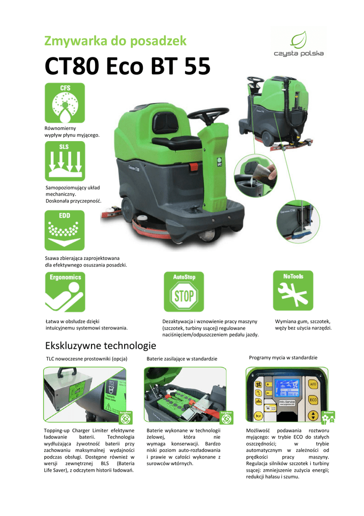 Zmywarka do posadzek CT80 Eco BT 55 Równomierny wypływ płynu myjącego. Samopoziomujący układ mechaniczny. Doskonała przyczepność. Ssawa zbierająca zaprojektowana dla efektywnego osuszania posadzki. Łatwa w obsłudze dzięki intuicyjnemu systemowi sterowania. Dezaktywacja i wznowienie pracy maszyny (szczotek, turbiny ssącej) regulowane naciśnięciem/odpuszczeniem pedału jazdy. Wymiana gum, szczotek, węży bez użycia narzędzi. Ekskluzywne technologie TLC nowoczesne prostowniki (opcja) Topping-up Charger Limiter efektywne ładowanie baterii. Technologia wydłużająca żywotność baterii przy zachowaniu maksymalnej wydajności podczas obsługi. Dostępne również w wersji zewnętrznej BLS (Bateria Life Saver), z odczytem historii ładowań. Baterie zasilające w standardzie Baterie wykonane w technologii żelowej, która nie wymaga konserwacji. Bardzo niski poziom auto-rozładowania i prawie w całości wykonane z surowców wtórnych. Programy mycia w standardzie Możliwość podawania roztworu myjącego: w trybie ECO do stałych oszczędności; w trybie automatycznym w zależności od prędkości pracy maszyny. Regulacja silników szczotek i turbiny ssącej: zmniejszenie zużycia energii; redukcji hałasu i szumu. CT80 BT55 System dozowania detergentu oddzielony od wody. Pozwala to na oszczędności środków myjących. Zbiornik łatwy do demontowania. System Anti-foam ze specjalną elektro - mechaniczna ochroną turbiny ssącej. Automatyczne zatrzymanie ssania, gdy zbiornik jest pełny. Żółte strefy konserwacji napędu. Szczotki ze wskaźnikiem maksymalnego zużycia. Główne parametry techniczne: Systemy elektryczne: Szczotki węglowe: łatwo wymienialne Panele sterujące: wyposażone w folię ochronną przed wodą i wilgocią Zawory elektromagnetyczne: wyposażone w membranę Viton, odporne na czynniki chemiczne Czujnik poziomu wody zbiornika czystej/brudnej wody dla zabezpieczenia Wyświetlacz: czytelny, w wielu językach, z licznikiem moto-godzin, wskaźnikiem poziomu baterii oraz programów roboczych Tworzywa Zbiorniki: wysokiej gęstości polietylen, o dużej grubości Gumy zbierające: typu czterostronnego., wykonane w technologii Latex Węże: poliuretanowe, wykonane z trwałych materiałów Koła: odporne na olej Inne cechy: Standardowe nylonowe szczotki z maksymalną wskaźnikiem zużycia Systemem automatycznego zakładania szczotek click-on/off Elektroniczna regulacja przepływu roztworu Wąż spustowy roztworu z regulacją wysokości (Ø 50 mm) Zbiornik ze zintegrowanym miernikiem środka czystości System "Acqua Stop" lub zestawy zewnętrzny do napełniania Akcesoria dodatkowe Model Szerokość Mycia/ Ssawy/ Wydajność (mm) LPTB02679 CT 80 BT 55 550 (mm) 710 Przekładnia silnika, silnik ssący i elementy elektryczne wysokiej jakości. Mechanika: Podwozie: odlewane, podwójne galwanizowane Łożyska: zabezpieczone przed wilgocią i wodą Śruby i nakrętki: wykonane ze stali nierdzewnej, w miejscach narażonych na kontakt z wodą Silniki Obroty szczotki: niezależna przekładnia olejowa silnika Nacisk szczotek: siłownik on-off Ssanie: 2 stopniowa turbina z wentylatorem i wałem ze stali nierdzewnej Ssawa zbierająca: siłownik - automatyczne unoszenie podczas cofania Trakcja: silnik z równoległymi osiami, praca do 8% nachylenia podłoża Kod Zbiornik można łatwo przechylić. Łatwy dostęp do wnętrza urządzenia. Karta pamięci: dane maszyny (zapisywanie cykli ładowania baterii, poborów prądu przez maszynę) Szczotki Szt. Zbiornik czystej wody (l) Zbiornik brudnej wody (l) Zasilanie Max prędkość (Km/h) Waga netto (Kg) Wymiary (dłxszerxwys) (cm) 1 79 83 24 V (2x12 V) - 105 Ah (C5) 6 118 1310x673x1030 (m2/h) 3300 Przykładowe akcesoria dostępne na zapytanie Zmywarka do posadzek CT80 BT 60 BT 70 Równomierny wypływ płynu myjącego. Samopoziomujący układ mechaniczny. Doskonała przyczepność. Ssawa zbierająca zaprojektowana dla efektywnego osuszania posadzki. Łatwe w obsłudze dzięki intuicyjnemu systemowi sterowania. Dezaktywacja i wznowienie pracy maszyny (szczotek, turbiny ssącej) regulowane naciśnięciem/odpuszczeniem pedału jazdy. Wymiana gum, szczotek, węży bez użycia narzędzi. Ekskluzywne technologie TLC nowoczesne prostowniki (opcja) Topping-up Charger Limiter efektywne ładowanie baterii. Technologia wydłużająca żywotność baterii przy zachowaniu maksymalnej wydajności podczas obsługi. Dostępne również w wersji zewnętrznej BLS (Bateria Life Saver), z odczytem historii ładowań. Baterie zasilające w standardzie Baterie wykonane w technologii żelowej, która nie wymaga konserwacji. Bardzo niski poziom auto-rozładowania i prawie w całości wykonane z surowców wtórnych. Programy mycia w standardzie Możliwość podawania roztworu myjącego: w trybie ECO do stałych oszczędności; w trybie automatycznym w zależności od prędkości pracy maszyny. Regulacja silników szczotek i turbiny ssącej: zmniejszenie zużycia energii; redukcji hałasu i szumu. CT80 BT 60 BT 70 System dozowania detergentu oddzielony od wody. Pozwala to na oszczędności środków myjących. Zbiornik łatwy do demontowania. System Anti-foam ze specjalną elektro - mechaniczna ochroną turbiny ssącej. Automatyczne zatrzymanie ssania, gdy zbiornik jest pełny. Żółte strefy konserwacji napędu. Szczotki ze wskaźnikiem maksymalnego zużycia. Główne parametry techniczne: Systemy elektryczne: Szczotki węglowe: łatwo wymienialne Panele sterujące: wyposażone w folię ochronną przed wodą i wilgocią Zawory elektromagnetyczne: wyposażone w membranę Viton, odporne na czynniki chemiczne Czujnik poziomu wody zbiornika czystej/brudnej wody dla zabezpieczenia Wyświetlacz: czytelny, w wielu językach, z licznikiem moto-godzin, wskaźnikiem poziomu baterii oraz programów roboczych Tworzywa Zbiorniki: wysokiej gęstości polietylen, o dużej grubości Gumy zbierające: typu czterostronnego., wykonane w technologii Latex Węże: poliuret