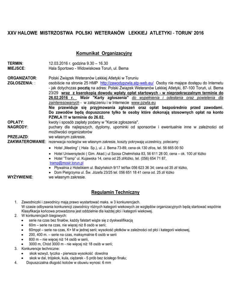 XXV HALOWE MISTRZOSTWA POLSKI WETERANÓW LEKKIEJ ATLETYKI - TORUN’ 2016 Komunikat Organizacyjny TERMIN: MIEJSCE: 12.03.2016 r. godzina 9.30 – 16.30 Hala Sportowo - Widowiskowa Toruń, ul. Bema ORGANIZATOR: ZGŁOSZENIA: : Polski Związek Weteranów Lekkiej Atletyki w Toruniu osobiście na stronie 25 HMP http://zawodypzwla.atp-web.eu/ Osoby nie mające dostępu do Internetu - jak dotychczas pocztą na adres: Polski Związek Weteranów Lekkiej Atletyki, 87-100 Toruń, ul. Bema 23/29 wraz z kserokopią dowodu wpłaty opłat startowych - w nieprzekraczalnym terminie do 26.02.2016 r. Wzór "Karty zgłoszenia" do wypełnienia i odesłania oraz powielenia dla zainteresowanych - w załączeniu i w Internecie www.pzwla.eu Nie przewiduje się przyjmowania zgłoszeń oraz opłat bezpośrednio przed zawodami. Do zawodów będą dopuszczone tylko te osoby które dokonają stosownych opłat na konto PZWLA !!! w terminie do 26.02. kwoty i sposób zapłaty podany w "Karcie zgłoszenia". puchary dla najlepszych, dyplomy, upominki od sponsorów i ewentualnie inne w zależności od możliwości organizatorów we własnym zakresie. OPŁATY: NAGRODY: PRZEJAZD: ZAKWATEROWANIE: rezerwacja noclegów we własnym zakresie, koszty pokrywają uczestnicy, polecamy: WYŻYWIENIE: Hotel „Meeting” ( Hala Sp.), ul. J. Bema 73-89, cena ok.130 zł/os, tel. 56 665 00 50 Hotel Uniwersytecki ( Gim. Akad.) ul Szosa Chełmińska 83, 56 611 28 00, cena – ok. 100 zł/ łóżko Hotel ”Tramp” ul. Kujawska 14, cena od 25 zł/łóżko, tel. (056) 654 71 87, [email protected] Pływalnia z Hotelikiem ul. Bażyńskich 9/17 tel/fax 056 623 36 34; cena od 35 zł/ łóżko, Dom Pielgrzyma ul. Św. Józefa 23/25 tel. 056 651 18 41 cena od. 25 zł/ łóżko we własnym zakresie. Regulamin Techniczny 1. Zawodniczki i zawodnicy mają prawo wystartować maks. w 3 konkurencjach. W czasie odbywania konkurencji zawodnicy różnych kategorii wiekowych ze względów organizacyjnych będą startować wspólnie Klasyfikacja końcowa prowadzona jest oddzielnie dla każdej płci i kategorii wiekowej. 2. W konkurencjach biegowych: serie na czas bez finałów, każdy falstart wiąże się z dyskwalifikacją 60m – serie na czas, nie więcej niż 8 osób w serii; 60mppł – serie na czas, K+ M w jednej serii; wysokość płotków w zależności od płci i kategorii wiekowej, 200, 400 m. – serie na czas, maksymalnie 6 osób w serii 800 m – nie więcej niż 14 osób w serii, 3000 m, Chód 3000 m - nie więcej niż 18 osób w serii; 3. Konkurencje techniczne: skok wzwyż, tyczka - pierwsza wysokość dowolna skok w dal, trójskok, kula, ciężarek - 5 prób bez ścisłego finału; 4. Dopuszczalna długość kolców w obuwiu wynosi: 6 mm Kategoria wiekowa K30-K49 K50-59 K60-74 K75+ M35-M49 M50-M59 M60-M69 M70-M79 M80+ Kategoria wiekowa WAGA SPRZĘTU W KON URENCJACH RZUTOWYCH kula ciężarek dysk oszczep 4,00 kg 9,08 1 600 3,00 kg 7,26 1 500 3,00 5,45 1 400 2,00 4,00 0,75 400 7,26 kg 15,88 kg 2 800 6,00 kg 11,34 kg 1,5 700 5,00 kg 9,08 kg 1 600 4,00 kg 7,26 kg 1 500 3,00 kg 5,45 kg 1 400 K 35-39 K 40-49 K 50-59 K 60 + Wysokość płotków 84,00 cm 76,20 cm 76,20 cm 68,60 cm M 35-49 M 50-59 M 60-69 M 70-79 M 80 i starsi 100,00 cm 91,40 cm 84,00 cm 76,20 cm 68,60 cm KOBIETY MEŻCZYŹNI WYSOKOŚCI I USTAWIENIE PŁOTKÓW W BIEGU NA 60mppł. Dobieg Odstępy Wybieg Ilość do 1. płotka pom. płotkami po 5. płotku płotków 13,00 m 8,50 m 13,00 m 5 12,00 m 8,00 m 16,00 m 5 12,00 m 7,00 m 20,00 m 5 12,00 m 7,00 m 20,00 m 5 13,72 m 13,00 m 12,00 m 12,00 m 12,00 m 9,14 m 8,50 m 8,00 m 7,00 m 7,00 m 9,72 m 13,00 m 16,00 m 20,00 m 20,00 m 5 5 5 5 5 Obciążenie płotka 3,6kg 2,7kg 2,7kg 2,7kg ,6kg 3,6kg 3,6kg 2,7kg 2,7kg WSTEPNY PROGRAM ZAWODÓW - ostateczny na 2 dni przed zawodami S2 - 16.00 7.30 9.30 9.45 10.00 10.30 10.40 11.00 11.30 12.00 12.10 12.20 12.30 12.50 13.00 13.10 13.40 14.00 14.10 14.30 15.00 15.10 15.20 15.40 16.20 11.O3.2016 12.03. PIĄTEK 60mppł K+M 60m K 60m M 3000m chód 800 M35-45 800 M50-65 800 M70+ 800 K 200m K 200m M 400m M ROZPOCZĘCIE PRACY SEKRETARIATU ZAWODÓW ROZPOCZĘCIE PRACY SEKRETARIATU ZAWODÓW OTWARCIE ZAWODÓW w dal K + M70+ Tyczka M60-75 w dal M 55-65 Tyczka M35-55 w dal M 35-40 w dal M 45-50 Wzwyż M35-50 kula M70-80 kula M60-65, kula M50-55 Cięż. M60-80 R2 trójskok K, M70+ S2 Trójskok M55-65 Kula M35-45 Wzwyż K+M55-80 Kula K trójskok M35-40 Cięż. M50-55 R2 Cięż. M35-45 R2 3000m K 3000m M 35-50 3000m M 55-85 trójskok M45-50 ZAKOŃCZENIE ZAWODÓW WRĘCZENIE NAGRÓD skocznia nr 2, R2 – rzutnia nr 2 na zewnątrz. Bramka: wyprowadzenie do konkurencji ( przy wejściu na halę z boiska rozgrzewkowego )15 min przed konkurencjami biegowymi, 30 min. przed konkurencjami technicznymi..Nagradzanie medalami za miejsca 1-3 w poszczególnych kategoriach wiekowych bezpośrednio po zakończeniu konkurencji. Podsumowanie zawodów i wręczenie nagród 20 min. po ostatniej konkurencji XXV HALOWE MISTRZOSTWA POLSKI WETERANÓW LEKKIEJ ATLETYKI TORUN’ 2016 KARTA ZGŁOSZENIA Nazwisko Data Dzień Miesiąc urodzenia >> Adres zamieszkania z kodem miejscowości Imię Rok Kategoria wiekowa Tel. Płeć (K/M) E-mail KONKURENCJE (proszę zakreślić liczbę wybranych konkurencji – maks. 3 ): Kobiety : 60 m, 60m ppł, 200 m, 400 m, 800 m, 3000m, 3000 m chód, skok w dal, trójskok, skok wzwyż, kula, ciężarek (?) Mężczyźni : 60 m, 60m ppł, 200 m, 400 m, 800m, 3000m, 3000 m chód, skok w dal, wzwyż, trójskok, tyczka, kula, ciężarek 1. Startowe: konkurencja 1-2 po 20 zł za konkurencję 2.3 konkurencja 3. Dodatkowa opłata na PZWLA - dotyczy zawodników nie będących członkami PZWLA 4. Składka członkowska za rok 2016 6. Wpisowe - dla nowych członków 7. Zaległa składka członkowska za rok 2015 i wcześniejsze –70 zł 9. Komunikat końcowy 20,00 zł 30,00 zł 50,00 zł 80,00 zł 10,00 zł 70,00 zł 10,00 zł RAZEM ( proszę zsumować powyżej zaznaczone pozycje) >> KATEGORIE WIEKOWE Uwaga !!! w dniu rozgrywania za