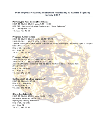 Plan imprez Miejskiej Biblioteki Publicznej w Rudzie Śląskiej na luty 2017 Perfekcyjna Pani Domu (Pro-Ethica) 2017-02-01, 08, 15, 22, godz. 9.00 - 12.00 MBP CIS - Centrum Inicjatyw Społecznych "Stara Bykowina" ul. 11 Listopada 15a. Tel. (32) 707 43 03 Progress Junior tańczą 2017-02-01, 08, 15, 22, godz. 16.45 - 17.45 2017-02-04, 11, 18, 25, godz. 11.00 - 12.00 Zajęcia rytmiczne i nauki tańca hip hop dla dzieci młodszych. Animator zajęć - Justyna Rak (794 274 333). Filia nr 18, Halemba ul. 1 Maja 32 Tel. (32) 242 67 92 Progress tańczą 2017-02-01, 08, 15, 22, godz. 18.00 - 19.00 2017-02-04, 11, 18, 25, godz. 9.00 - 11.00 Zajęcia rytmiczne i tańca hip hop dla dzieci. Animator zajęć – Justyna Rak (794 274 333). Filia nr 18, Halemba ul. 1 Maja 32 Tel. (32) 242 67 92 Cykl spotkań pt. „Ewa zaprasza” 2017-02-01, godz. 17.00 Filia nr 21, Bykowina ul. Grzegorzka 8 Tel. (32) 242 78 83 Gitara bez tajemnic 2017-02-01, 08, 15, 22, godz. 16.00 - 17.30 Bezpłatne warsztaty muzyczne. Wymagany własny instrument. Filia nr 18, Halemba ul. 1 Maja 32 Tel. (32) 242 67 92 Spotkanie z Januszem Muzyczyszynem. „Dziewczyna, kobieta, czas” 2017-02-02, godz. 17.00 Zapraszamy wszystkich miłośników na spotkanie z wierszami Janusza Muzyczyszyna. Spotkanie poświęcone będzie prezentacji i promocji nowego tomu wierszy, pod tytułem „Dziewczyny, kobiety, czas”. Biblioteka Centralna, (Galeria Krekot), Wirek ul. Dąbrowskiego 18 Tel. (32) 242 05 86 Muzyczny czwartek w bibliotece 2017-02-02, godz. 17.00 Koncert muzyki/ Chorzowskie Stowarzyszenie Artystyczne „Evviva l`arte”. Filia nr 18, Halemba ul. 1 Maja 32 Tel. (32) 242 67 92 Zumba Fitness 2017-02-02, 09, 16, 23, godz. 18.00 - 19.00 gr. I, godz. 19.00 - 20.00 gr. II MBP CIS - Centrum Inicjatyw Społecznych „Stary Orzegów” ul. Kard. A. Hlonda 29 Tel. (32) 248 36 37 Lekcje malarstwa: warsztaty (Proethica) 2017-02-02, 09, 16, 23, godz. 9.00 - 12.00 Grupa artystyczna - „Inspiracje” MBP CIS - Centrum Inicjatyw Społecznych "Stara Bykowina" ul. 11 Listopada 15a. Tel. (32) 707 43 03 Zbiórki harcerskie (ZHP) 2017-02-03, 10, 17, 24, godz. 16.00 - 19.00 - Zuchy 2017-02-04, 11, 18, 25, godz. 9.00 - 11.00 – Harcerze MBP CIS - Centrum Inicjatyw Społecznych "Stara Bykowina" ul. 11 Listopada 15a. Tel. (32) 707 43 03 Dyskusyjny Klub Książki – Klub Literacki – BARWY 2017-02-03, godz. 18.00 Dyskusja o książce Jeet Thayil „Narkopolis”, Turniej Jednego Wiersza i Warsztaty Literackie. Filia nr 16, Ruda ul. Wolności 20 Tel. (32) 248 13 18 Kółko gitarowe 2017-02-04, 11, 18, 25, godz. 12.00 Nauka gry dla dzieci. MBP CIS - Centrum Inicjatyw Społecznych „Stary Orzegów” ul. Kard. A. Hlonda 29 Tel. (32) 248 36 37 Tenis stołowy (ZHP) 2017-02-04, 11, 18, 25, godz. 11.00 - 13.00 MBP CIS - Centrum Inicjatyw Społecznych "Stara Bykowina" ul. 11 Listopada 15a. Tel. (32) 707 43 03 Liga Play Station (ZHP) 2017-02-04, 11, 18, 25, godz. 10.00 - 13.00 MBP CIS - Centrum Inicjatyw Społecznych "Stara Bykowina" ul. 11 Listopada 15a. Tel. (32) 707 43 03 Złoty środek, czyli spotkania z jogą 2017-02-06, 13, 20, 27, godz. 17.00 - 18.30 Zajęcia prowadzone przez Grażynę Kotlorz (karnet - 60 zł, pojedyncze wejście – 25 zł). Filia nr 18, Halemba ul. 1 Maja 32 Tel. (32) 242 67 92 Spotkanie członków Polskiego Związku Emerytów, Rencistów i Inwalidów w Rudzie Śląskiej 2017-02-06, 13, 20, 27, godz. 12.30 - 14.30 Filia nr 18, Halemba ul. 1 Maja 32 Tel. (32) 242 67 92 Kółko Skata (ZHP) 2017-02-06, 13, 20, 27, godz. 16.00 - 19.00 MBP CIS - Centrum Inicjatyw Społecznych "Stara Bykowina" ul. 11 Listopada 15a. Tel. (32) 707 43 03 Fitness 2017-02-06, 13, 20, 27, godz. 17.00 - 18.00 gr. I, 18.00 - 19.00 gr. II MBP CIS - Centrum Inicjatyw Społecznych „Stary Orzegów” ul. Kard. A. Hlonda 29 Tel. (32) 248 36 37 Gimnastyka aktywna (ProEthica) 2017-02-06, 13, 20, 27, godz. 9.00 - 12.00 grupa A, B, C MBP CIS - Centrum Inicjatyw Społecznych "Stara Bykowina" ul. 11 Listopada 15a. Tel. (32) 707 43 03 Maski karnawałowe 2017-02-06, godz. 15.30 Zajęcia plastyczne dla dzieci. Wykonywanie masek karnawałowych z użyciem różnego rodzaju materiałów. Filia nr 6, Bielszowice ul. Kokota 166 (Dom Kultury) Tel. (32) 717 30 56 Spotkania członków Śląskiego Stowarzyszenia Diabetyków 2017-02-07, 14, 21, 28, godz. 11.00 - 14.00 Filia nr 18, Halemba ul. 1 Maja 32 Tel. (32) 242 67 92 O zdrowym odżywianiu 2017-02-07, godz. 17.00 Spotkanie z doradcą dietetycznym Katarzyną Wolniewicz pt. „Tłuszcz przyjaciel- tłuszcz ukryty”. MBP CIS - Centrum Inicjatyw Społecznych „Stary Orzegów” ul. Kard. A. Hlonda 29 Tel. (32) 248 36 37 Rola teatrów OFFowych w Polsce 2017-02-08, godz. 17.00 Gościem spotkania będzie reżyser teatralny, pan Grzegorz Kempinsky, który opowie o teatrach OFFowych, ich roli i znaczeniu w życiu kulturalnym w Polsce i na Śląsku. Grzegorz Kempinsky jest dyrektorem artystycznym Teatru ŚwiętochłOFFice w Świętochłowicach-Zgodzie, Teatru Kontrabanda w Krakowie i Akademickiego Teatru Remont w Gliwicach. Przedstawienia w jego reżyserii były nagradzane na festiwalach teatralnych, ostatnio Grand Prix na Festiwalu START 2016 w Warszawie. Współorganizatorem spotkania jest wydawnictwo SilesiaProgress. Biblioteka Centralna, (Galeria Krekot), Wirek ul. Dąbrowskiego 18 Tel. (32) 242 05 86 Głośne czytanie w dzieciom 2017-02-08, godz. 9.00 W Przedszkolu nr 17 na temat z cyklu „Wędrówki kropli wody”. Filia nr 4, Nowy Bytom ul. Niedurnego 69 Tel. (32) 248 51 61 Na Jakubowym szlaku 2017-02-09, godz. 17.00 Spotkanie czytelnicze połączone z wernisażem wystawy „Droga św. Jakuba” autorstwa Dominiki Rusin, Joanny Oreł, Marka Wacława Judyckiego, Bronisława Wątroby - przy współpracy z PZF Ruda Śląska. Filia nr 18, Halemba ul. 1 Maja 32 Tel. (32) 242 67 92 Głośne czytanie bajek 2017-02-09, 21, godz. 9.00 Czytanie książek M. Niemyckiego „Jak żabcio w świat wywędrował” i R. Schoof, U. Waas „Paulinka i m