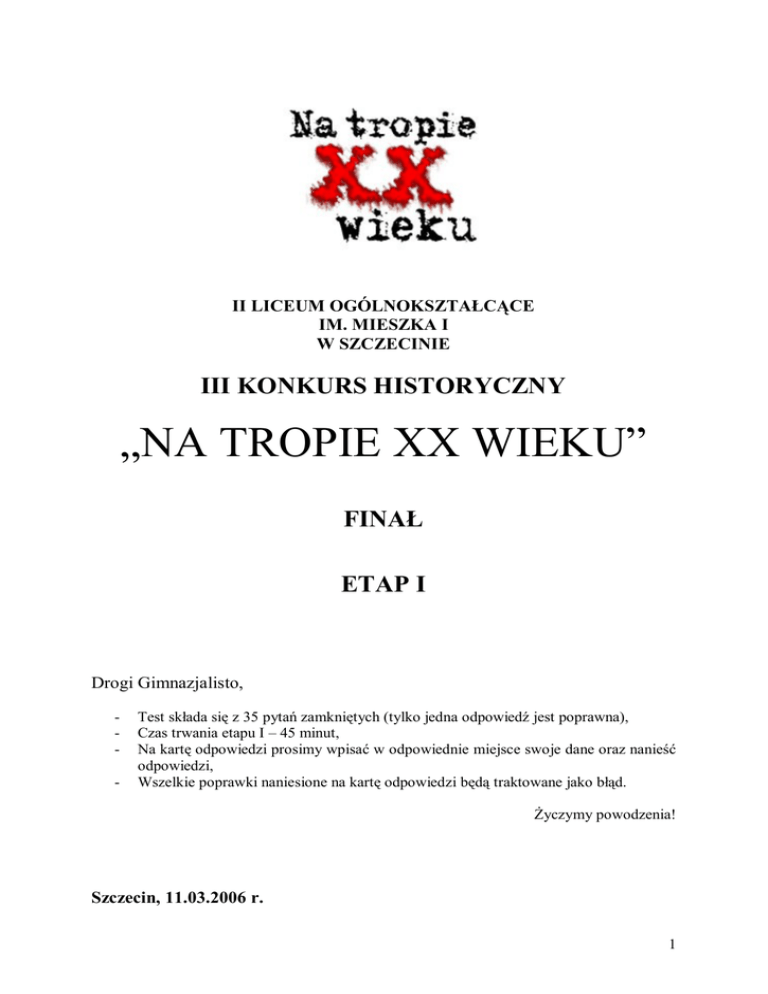 II LICEUM OGÓLNOKSZTAŁCĄCE IM. MIESZKA I W SZCZECINIE III KONKURS HISTORYCZNY „NA TROPIE XX WIEKU” FINAŁ ETAP I Drogi Gimnazjalisto, - Test składa się z 35 pytań zamkniętych (tylko jedna odpowiedź jest poprawna), Czas trwania etapu I – 45 minut, Na kartę odpowiedzi prosimy wpisać w odpowiednie miejsce swoje dane oraz nanieść odpowiedzi, Wszelkie poprawki naniesione na kartę odpowiedzi będą traktowane jako błąd. Życzymy powodzenia! Szczecin, 11.03.2006 r. 1 TEST 1. Na początku I wojny światowej armią francuską dowodził: a. b. c. d. Raymond Poincare Jaen Fucheu Philipp Petain Joseph Joffre 2. Na początku pierwszej wojny światowej w Krakowie powstał Naczelny Komitet Narodowy, na którego czele stanął: a. b. c. d. Zdzisław Lubomirski Zygmunt Wielkopolski Juliusz Leo Wincenty Niemojowski 3. Po zdobyciu Warszawy przez wojska niemieckie 4 sierpnia 1915 r., jej gubernatorem zostaje: a. b. c. d. Leopold ks. Bawarski Erich Diller Hans Beseler Karl Kuk 4. W wyniku jakiego wydarzenia Bułgaria oddała Rumunii południową Dobrudżę? a. b. c. d. pierwszej wojny bałkańskiej drugiej wojny bałkańskiej drugiego arbitrażu berlińskiego I wojny światowej 5. Śląsk Cieszyński w myśl postanowień Rady Ambasadorów miał być terenem plebiscytowym, lecz wskutek działań armii czeskiej został przyznany Czechosłowacji w: a. b. c. d. Listopadzie 1918 r. Lipcu 1920 r. Sierpniu 1921 r. Kwietniu 1919 r. 6. Pierwszym prezydentem Republiki Weimarskiej był: a. b. c. d. Mathtias Erzenberg Maksymilian Badeński Friedrich Ebert Karol Liebknecht 7. Który z pierwszych gabinetów II RP jako pierwszy otrzymał uznanie Entanty? a. b. c. d. Wincentego Witosa Ignacego Jana Paderewskiego Jędrzeja Moraczewskiego Ignacego Daszyńskiego 8. Wojnę polsko-bolszewicką zakończył: a. b. c. d. Pakt Lanckoroński Układ Brzeski Traktat Rawski Traktat Ryski 2 9. W Rapallo układ między sobą zawarły: a. b. c. d. Niemcy i Włochy Włochy, Niemcy i Węgry Rosja Radziecka i Francja Rosja Radziecka i Niemcy 10. Pakt Reński zawarty 16 października 1925 r. dotyczył: a. b. c. d. zakończenia konfliktu o kontrolę nad Zagłębiem Saary remilitaryzacji Nadrenii granicy wschodniej Niemiec granicy zachodniej Niemiec 11. Która partia zwyciężyła w wyborach parlamentarnych z 16 XI 1930 r.? a. b. c. d. Stronnict wo Narodowe – 33 % PSL Piast – 42 % BBWR – 56 % PSL Piast – 29 % 12. 25 lipca 1932 r. Polska zawarła porozumienie określające jej relacje z sąsiadami. Jak nazywał się ten dokument? a. b. c. d. Pakt Czterech. Polsko-niemiecka deklaracja o nieagresji. Polsko-czechosłowacko-francuski układ obronny. Polsko-radziecki pakt o nieagresji. 13. Pakt lanckoroński zawarty w maju 1923 r. dotyczył: a. b. c. d. poparcia prawicy dla zamachu majowego utworzenia koalicji centro-prawicowej poparcia dla rządu Kazimierza Bartla poparcia dla kandydatury G. Narutowicza na urząd prezydenta 14. Wojna domowa w Hiszpanii rozpoczęła się w: a. b. c. 1934 1935 1936 d. 1937 15. Gdańsk był powiązany z Polską: a. b. c. d. unią celną unią kolejową przedstawicielstwem pocztowym i wyżej wymienionymi poprzez wspólną politykę zagraniczną 16. Konkordat między Rzecząpospolitą a Watykanem zawarto w: a. b. c. d. 1926 r. 1929 r. 1925 r. 1922 r. 17. W skład „grupy zamkowej” wchodził: a. b. c. d. Wincenty Witos Adam Koc Edward Rydz Śmigły Eugeniusz Kwiatkowski 3 18. Po rozwiązaniu BBWR nową formacją polityczną Sanacji został/a: a. b. c. d. Falanga OWP POW OZN 19. Neville Chamberlain został premierem w 1937 r. zastępując na tym stanowisku: a. b. c. d. Jamesa Mac Donalda Stanleya Baldwina Antoniego Edena Oswalda Mosleya 20. Ostatnim kanclerzem Austrii przed aneksją w 1938 r. był: a. b. c. d. Kurt Schuschning Franz Papen Artur Seyss-Inquart Wilhelm Miklas 21. W kwietniu 1939 r. Mussolini będąc pod wrażeniem sukcesów Hitlera zaatakował i zajął: a. b. c. d. Grecję Czarnogórę Serbię Albanię 22. Kto objął funkcje premiera rządu londyńskiego po śmierci Władysława Sikorskiego? a. b. c. d. Jan Stanisław Jankowski Stanisław Mikołajczyk Cyryl Ratajski Kazimierz Sosnkowski 23. Dowódcą grupy armii, która wykonała manewr oskrzydlający w kierunku kanału La Manche (przez Ardeny) był: a. b. c. d. Gen. Heinz Guderian Gen. Evald Klaist Mar. Gerd Rundstedt Gen. Herman Hoth 24. 12 października 1939 r. A. Hitler wydał dekret. Czego on dotyczył? a. b. c. d. O utworzeniu w Generalnym Gubernatorstwie obozów koncentracyjnych. O przeprowadzeniu akcji AB Utworzeniu getta w Piotrkowie Trybunalskim. O utworzeniu Generalnego Gubernatorstwa. 25. Który z wymienionych polityków nie był w czasie II wojny światowej premierem rządu na emigracji? a. b. c. d. Władysław Raczkiewicz Tomasz Arciszewski Stanisław Mikołajczyk Władysław Sikorski 26. Jaka organizacja została utworzona w kwietniu 1949 r.? a. b. c. d. Układ Warszawski Pakt Północnoatlantycki Kominform Organizacja Państw Arabskich 4 27. Tamilskie Tygrysy to organizacja terrorystyczna działająca w: a. b. c. d. Nepalu Cejlonie Peru Ugandzie 28. Do grupy Puławskiej nie należeli: a. b. c. d. Stanisław Popławski Jerzy Morawski Edward Gierek Władysław Gomułka 29. Postulatem zgłoszonym przez komitet strajkowy stoczni szczecińskiej w 1970 r. było: a. b. c. d. powołanie niezależnych związków zawodowych podwyższenie płac i obniżenie cen ogłoszenie amnestii wszystkie powyższe odpowiedzi są prawdziwe 30. Salvadore Allende był w latach 1970 – 1973 przywódcą: a. b. c. d. Argentyny Boliwii Kolumbii Chile 31. Organizacja Czarny Wrzesień odpowiedzialna za zamach na olimpiadzie w Monachium należała do grup terrorystycznych: a. b. c. d. narodowo-wyzwoleńczych lewackich fundamentalistyczno-religijnych do żadnej z wymienionych 32. Inicjatorem Soboru Watykańskiego II był papież: a. b. c. d. Pius XII Jan XXIII Paweł VI Jan Paweł I 33. Kiedy doszło do zabójstwa księdza Jerzego Popiełuszki?