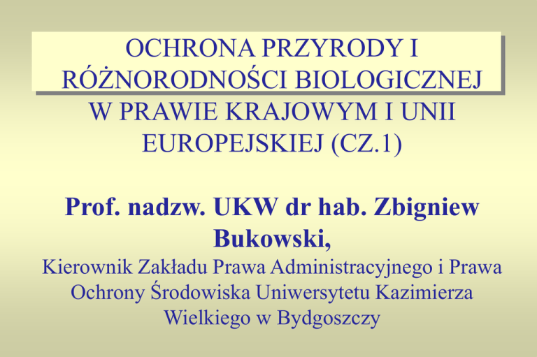OCHRONA PRZYRODY I RÓŻNORODNOŚCI BIOLOGICZNEJ W PRAWIE KRAJOWYM I UNII EUROPEJSKIEJ (CZ.1) Prof. nadzw. UKW dr hab. Zbigniew Bukowski, Kierownik Zakładu Prawa Administracyjnego i Prawa Ochrony Środowiska Uniwersytetu Kazimierza Wielkiego w Bydgoszczy Prawo międzynarodowe • Najstarsze akty prawne dotyczące ochrony przyrody pochodzą sprzed 4000 lat z Babilonii, Egiptu oraz Indii • Pierwsze umowy międzynarodowe w tym zakresie z końca XVIII w. – dotyczyły głównie ochrony gatunkowej Lata 70-te • W latach 70-tych opracowanych zostało szereg umów międzynarodowych dotyczących ochrony przyrody, w tym • Konwencja Ramsarska o obszarach wodno-błotnych mających znaczenie międzynarodowe, zwłaszcza jako środowisko życiowe ptactwa wodnego z 1971 r., • Konwencja Paryska w sprawie ochrony światowego dziedzictwa kulturalnego i naturalnego z 1972 r., • Konwencja Waszyngtońska o międzynarodowym handlu dzikimi zwierzętami i roślinami gatunków zagrożonych wyginięciem z 1973 r., • Konwencja Bońska o ochronie gatunków wędrownych dzikich zwierząt z 1979 r., • Konwencja Berneńska o ochronie gatunków dzikiej flory i fauny europejskiej z 1979 r. Ochrona bioróżnorodności • W latach 80-tych wypracowywano także kierunek, dziś nazwany ochroną bioróżnorodności, której elementem jest ochrona gatunkowa czy obszarowa. • Problematyka ochrony różnorodności biologicznej była jedną z najistotniejszych poruszanych na Konferencji w Rio de Janeiro. • Najważniejszym aktem prawa międzynarodowego w tym zakresie jest przyjęta 22 maja 1992 r. konwencja o różnorodności biologicznej. rozdział 15 Agendy 21 • Wśród podstawowych celów działań określa on: poprawę ochrony różnorodności biologicznej, zapewnienie trwałego użytkowania zasobów biologicznych oraz wsparcie dla wprowadzenia w życie omówionej wyżej konwencji. Zmniejszanie się bioróżnorodności spowodowane jest przez człowieka, m.in. przez niszczenie siedlisk, nadmierną ich eksploatację, emisję zanieczyszczeń, nieracjonalne wprowadzanie obcych gatunków roślin i zwierząt. W związku z tym podkreślono konieczność opracowania narodowych strategii ochrony biologicznej różnorodności. Bardzo mocny nacisk położono także na zasadę sprawiedliwego i równego podziału zysków czerpanych z badań, rozwoju i wykorzystania zasobów biologicznych i genetycznych, łącznie z biotechnologią, pomiędzy państwa, w których posiadaniu znajdują się źródła tych zasobów i te, które z nich korzystają, co zresztą spowodowało konflikt na tym tle pomiędzy Stanami Zjednoczonymi a resztą uczestników Konferencji w Rio. Konwencja Ramsarska • Konwencja o obszarach wodno-błotnych mających znaczenie międzynarodowe, zwłaszcza jako środowisko życiowe ptactwa wodnego sporządzona została w Ramsarze dnia 2 lutego 1971 r. (Dz.U. z 1978 r. Nr 7, poz. 24 z późn.zm.) Wyznaczenie obszarów • Podstawowe przyjęte w umowie zobowiązanie dotyczy wyznaczenia przez państwa na swoim terytorium obszarów wodno-błotnych w celu włączenia ich do Spisu Obszarów Wodno-Błotnych o Międzynarodowym Znaczeniu. Mogą one też obejmować strefy przybrzeżne rzek i mórz przylegające do obszarów wodno-błotnych oraz wyspy lub wody morskie głębsze niż sześć metrów podczas odpływu, lecz otoczone obszarami wodno-błotnymi, zwłaszcza gdy mają one duże znaczenie jako środowisko życiowe ptactwa wodnego. Wyboru obszarów wodno-błotnych, które powinny być zamieszczone w Spisie, należy dokonać na podstawie ich międzynarodowego znaczenia ekologicznego, botanicznego, zoologicznego, limnologicznego lub hydrologicznego. Konwencja w sprawie ochrony światowego dziedzictwa • Konwencja w sprawie ochrony światowego dziedzictwa kulturalnego i naturalnego przyjęta została w Paryżu dnia 16 listopada 1972 r. przez Konferencję Generalną Organizacji Narodów Zjednoczonych dla Wychowania, Nauki i Kultury na jej siedemnastej sesji (Dz.U. z 1976 r. Nr 32, poz.190). Dziedzictwo naturalne • Dziedzictwo naturalne natomiast to: • - pomniki przyrody utworzone przez formacje fizyczne i biologiczne albo zgrupowania takich formacji, przedstawiające wyjątkową powszechną wartość z punktu widzenia estetycznego lub naukowego, • - formacje geologiczne i fizjograficzne oraz strefy o ściśle oznaczonych granicach, stanowiące siedlisko zagrożonych zagładą gatunków zwierząt i roślin, mające wyjątkową powszechną wartość z punktu widzenia nauki lub ich zachowania, • - miejsca lub strefy naturalne o ściśle oznaczonych granicach, mające wyjątkową powszechną wartość z punktu widzenia nauki, zachowania lub naturalnego piękna. identyfikacja • Obowiązek identyfikowania i wyznaczania granic wszelkiego rodzaju dóbr dziedzictwa kulturalnego i naturalnego należy do każdego państwa, na którego terytorium one się znajdują. Dziedzictwo powszechne • Zarazem przyjęto, że przy całkowitym poszanowaniu suwerenności państw, na których terytorium znajduje się dziedzictwo kulturalne i naturalne i nie naruszając praw rzeczowych do tego dziedzictwa wynikających z ustawodawstwa krajowego państwa uznają, że stanowi ono dziedzictwo powszechne, w którego ochronie ma obowiązek współdziałać cała społeczność międzynarodowa. Stąd też państwa zobowiązują się nie podejmować świadomie żadnych działań mogących wyrządzić bezpośrednio lub pośrednio szkodę dziedzictwu kulturalnemu i naturalnemu znajdującemu się na terytorium innych państw. Listy dziedzictwa światowego • Na podstawie wykazów przedstawionych przez państwa Międzyrządowy Komitet Ochrony Dziedzictwa Kulturalnego i Naturalnego o Wyjątkowej Powszechnej Wartości ustala, aktualizuje i rozpowszechnia pod mianem "Listy dziedzictwa światowego" wykaz dóbr dziedzictwa kulturalnego i dziedzictwa naturalnego, które uznaje za mające wyjątkową powszechną wartość na podstawie kryteriów us