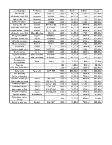 nazwa sprzętu Odkurzacz Młotowiertarka SDSPlus 950W Wkrętarka 20V Szlifierka kątowa 2400W18V Wkrętarka Wiertarka uddarowa Pilarka 1050W ręczna 1200W Młotowiertarka SDSPlus 550W Wyrzynarka 800W Szlifierka oscylacyjna 280W Szlifierka taśmowa Klucze800W nasadowe Lutownica transformatorowa Kosiarka spalinowa 5KM Podkaszarka elektryczna 450W Myjka ciśnieniowa Urządzenie rozruchowe 450A Rusztowanie warszawskie Podesty Koła do rusztowania komplet Betoniarka Wał do trawy Taczka budowlana Szlifierka oscylacyjna 190W Wkrętarka sieciowa Szlifierka kątowa 2400W Szlifierka kątowa 850W10,8W Wkrętarka Wkrętarka kątowa 10,8W Pistolet do kleju Siewnik do trawy ręczny Dalmierz laserowy Producent Bosch Graphite model GAS 15L 58G548 doba 40,00 zł 30,00 zł 3 doby 86,00 zł 64,00 zł tydzień 156,00 zł 117,00 zł kaucja 600,00 zł 400,00 zł Graphite Graphite Einhell 58G134 59G206 BT-CD 18 2B 30,00 zł 35,00 zł 25,00 zł 64,00 zł 75,00 zł 54,00 zł 117,00 zł 136,00 zł 97,00 zł 500,00 zł 300,00 zł 100,00 zł Pansam Einhell Black&Decker Tryton Tryton Graphite Proline Lutola Tryton Verto Black&Decker Black&Decker A164030 BT-CS 1200 KD855 TMR80027 TM00414 59G394 48794 6C TOO51501 52G544 PW1800 450AMP 25,00 zł 25,00 zł 30,00 zł 20,00 zł 20,00 zł 25,00 zł 30,00 zł 15,00 zł 45,00 zł 15,00 zł 35,00 zł 30,00 zł 54,00 zł 54,00 zł 64,00 zł 43,00 zł 43,00 zł 54,00 zł 64,00 zł 32,00 zł 96,00 zł 32,00 zł 75,00 zł 64,00 zł 97,00 zł 97,00 zł 117,00 zł 78,00 zł 78,00 zł 97,00 zł 117,00 zł 58,00 zł 175,00 zł 58,00 zł 136,00 zł 117,00 zł 100,00 zł 100,00 zł 100,00 zł 150,00 zł 100,00 zł 200,00 zł 200,00 zł 80,00 zł 900,00 zł 100,00 zł 600,00 zł 500,00 zł Atex 1500cm 1,00 zł 2,00 zł 4,00 zł 50,00 zł 2,00 zł 4,00 zł 8,00 zł 50,00 zł 15,00 zł 32,00 zł 58,00 zł 100,00 zł 90,00 zł 20,00 zł 20,00 zł 25,00 zł 30,00 zł 35,00 zł 30,00 zł 25,00 zł 25,00 zł 15,00 zł 193,00 zł 43,00 zł 43,00 zł 54,00 zł 64,00 zł 75,00 zł 64,00 zł 54,00 zł 54,00 zł 32,00 zł 350,00 zł 78,00 zł 78,00 zł 97,00 zł 117,00 zł 136,00 zł 117,00 zł 97,00 zł 97,00 zł 58,00 zł 2 500,00 zł 100,00 zł 150,00 zł 350,00 zł 450,00 zł 600,00 zł 250,00 zł 280,00 zł 350,00 zł 30,00 zł 15,00 zł 32,00 zł 58,00 zł 30,00 zł 20,00 zł 43,00 zł 78,00 zł 350,00 zł Agro-wikt BWA-200 Bosch Bosch Bosch Bosch Bosch Bosch Rubbermind GSS 23AE GSR 6-45 TE GWS 24-230 GWS 850 GSR 10,8-LI GWI 10,8-LI Dewalt DW 030P