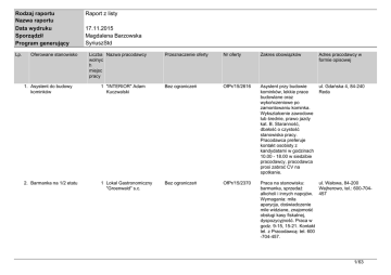 Rodzaj raportu Nazwa raportu Data wydruku Sporządził Program generujący Lp. Oferowane stanowisko Raport z listy 17.11.2015 Magdalena Barzowska SyriuszStd Liczba Nazwa pracodawcy wolnyc h miejsc pracy Przeznaczenie oferty Nr oferty Zakres obowiązków Adres pracodawcy w formie opisowej ul. Gdańska 4, 84-240 Reda 1. Asystent do budowy kominków 1 "INTERIOR" Adam Kuczwalski Bez ograniczeń OfPr/15/2616 Asystent przy budowie kominków, lekkie prace budowlane oraz wykończeniowe po zamontowaniu kominka. Wykształcenie zawodowe lub średnie, prawo jazdy kat. B. Staranność, dbałość o czystość stanowiska pracy. Pracodawca preferuje kontakt osobisty z kandydatami w godzinach 10.00 - 18.00 w siedzibie pracodawcy, pracodawca prosi zabrać CV na spotkanie. 2. Barmanka na 1/2 etatu 1 Lokal Gastronomiczny "Groenwald" s.c. Bez ograniczeń OfPr/15/2370 Praca na stanowisku: ul. Wałowa, 84-200 barmanka, sprzedaż Wejherowo, tel.: 600-704alkoholi i innych napojów. 457 Wymagania: miła aparycja, doświadczenie mile widziane, znajomość obsługi kasy fiskalnej, dyspozycyjność. Praca w godz. 9-15, 15-21. Kontakt tel. z Pracodawcą: tel. 600 -704-457. 1/ 63 Lp. Oferowane stanowisko Liczba Nazwa pracodawcy wolnyc h miejsc pracy Przeznaczenie oferty Nr oferty Zakres obowiązków Adres pracodawcy w formie opisowej ul. Ogrodników 18 lok. B, 84-240 Reda, tel.: 607-694 -025 3. Blacharz/ lakiernik samochodowy 1 BIG-AUTO Blacharstwo Lakiernictwo Pojazdowe Gabriel Kołodzik Bezrobotni OfPr/15/2531 Wykonywanie napraw blacharskich, pomoc w lakierowaniu naprawianych elementów w warsztacie samochodowym. Mile widziane doświadczenie zawodowe. 4. Blacharz samochodowy 1 MARIGO Przedsiębiorstwo Bezrobotni Handlowo-Usługowe Janusz Supiński OfPr/15/2484 Naprawy blacharskie ul. Szkolna 20 m. 34, 84wykonywane w 240 Reda, tel.: 512-497samochodach 883 osobowych.Wymagania: wykształcenie zawodowe blacharz, doświadczenie zawodowe 5 lat. 5. Brukarz 2 REJBUD DANIEL REJNIAK Bez ograniczeń OfPr/15/2519 6. Brukarz 2 Przedsiębiorstwo Usług Komunalnych Spółka z o.o. Bez ograniczeń OfPr/15/2525 Wymagania: doświadczenie, prawo jazdy kat. B. Praca na terenie Trójmiasta. Pierwsza umowa na umowę zlecenie. Praca w terenie. Kontakt tel. z Pracodawcą: 511-852430. Samodzielny brukarz osoba z doświadczeniem w pracy na stanowisku brukarz. Wykonywanie podbudowy, podsypek, układanie krawężników drogowych i obrzeży chodnikowych, dokonywanie napraw nawierzchni brukowych i asfaltowych. Wykształcenie ul. Dolna 2A, 84-200 Wejherowo, tel.: 511-852430 ul. Dębogórska 148, 84230 Rumia, tel.: 6710398 2/ 63 Lp. Oferowane stanowisko Liczba Nazwa pracodawcy wolnyc h miejsc pracy Przeznaczenie oferty Nr oferty 7. Brukarz 4 P.P.H. BOGPOL Sp. z o.o. Bez ograniczeń OfPr/15/2528 8. Brukarz/ pomocnik brukarza 2 Usługi Sprzętowo Transportowe Roboty Drogowo - Budowlane Ryszard Czepulonis Bez ograniczeń OfPr/15/2625 9. Brygadzista (meble) 1 ARMET BIS sp. z o.o. Bez ograniczeń OfPr/15/2570 Zakres obowiązków podstawowe lub zawodowe. Praca na pełny etat lub pół etatu do uzgodnienia. Praca na stanowisku brukarz. Wymagane jest posiadanie przez kandydatów prawo jazdy kat. B. Praca fizyczna - układanie kostki brukowej. Mile widziane prawo jazdy kat. B. Koniecznie wymagane jest doświadczenie w brukarstwie - stanowisko samodzielne lub pomocnik brukarza - koniecznie z prawem jazdy kat. B. Praca na jedną zmianę. Praca w terenie. Wynagrodzenie do uzgodnienia w zależności od umiejętności i kwalifikacji kandydatów. Adres pracodawcy w formie opisowej ul. Gryfa Pomorskiego 54, 84-200 Wejherowo, tel.: 662-059-580 ul. Nadrzeczna 9, 84-200 Wejherowo, tel.: 604-908704, 58-672-56-07 Planowanie i ul. Morska 174, 81-222 organizowanie produkcji, Gdynia kierowanie zespołem pracowników produkcyjnych, nadzór nad eksploatacją maszyn i urządzeń. Wymagania: wykształcenie zawodowe lub średnie, staż pracy 2 lata, umiejętność odczytywania 3/ 63 Lp. Oferowane stanowisko Liczba Nazwa pracodawcy wolnyc h miejsc pracy Przeznaczenie oferty Nr oferty Zakres obowiązków Adres pracodawcy w formie opisowej dokumentacji technicznej, znajomość specyfiki eksploatacji urządzeń i maszyn, doświadczenie w kierowaniu pracowników produkcyjnych, umiejętność odczytywania dokumentacji technicznej. Forma kontaktu z Pracodawcą: tel. 58-67614-58, osobiście w Jeleńskiej Hucie w godz. 8 -16 po wcześniejszym telefonicznym umówieniu, e-mail: [email protected] 10. Cieśla 1 BUDREM-RYBAK Sp. z Bez ograniczeń o.o. Spółka Komandytowa OfPr/15/2472 Praca na budowach ul. Krótka 1, 84-242 teren woj. pomorskiego. Luzino, tel.: 58-678-20-43 Wymagania: wykształcenie zawodowe, doświadczenie min. 2 lata. Preferowana forma kontaktu z Pracodawca; kontakt tel. 58-678-20-43. Wynagrodzenie jest do uzgodnienia w zależności od posiadanych uprawnień i umiejętności. 11. Doradca klienta 2 ARBITER Sp. Akcyjna OfPr/15/2508 Pozyskiwanie i obsługa klientów w zakresie odszkodowań. Praca w terenie. Wykształcenie średnie, doświadczenie w pracy na stanowisku Bez ograniczeń ul. Strzegomska 3B m. 3C, 53-611 Wrocław, tel.: 71723-40-19 4/ 63 Lp. Oferowane stanowisko Liczba Nazwa pracodawcy wolnyc h miejsc pracy Przeznaczenie oferty Nr oferty Zakres obowiązków Adres pracodawcy w formie opisowej przedstawiciel handlowy, prawo jazdy kat. B. System pracy zadaniowy, praca w pełnym wymiarze czasu pracy na umowę zlecenie. Wynagrodzenie będzie opiewało na pensję podstawową z prowizją. 12. Doradca serwisowy 2 K&K Przedsiębiorstwo Handlowo-Usługowe Krzysztof Wojtanowicz Bezrobotni OfPr/15/1835 Obsługa klientów serwisu ul. Gdańska 105/107, 84samochodowego z 200 Wejherowo, tel.: 58dbałością o wizerunek 672-65-48 firmy i z zachowaniem standardów firmy, informacja klientów o przebiegu napraw, planowanie napraw pojazdów, wycena usług, kalkulacja zleceń, odbiór części technicznych, sprzedaż usług, podzespołów, części, koordynacja pracy działu serwis