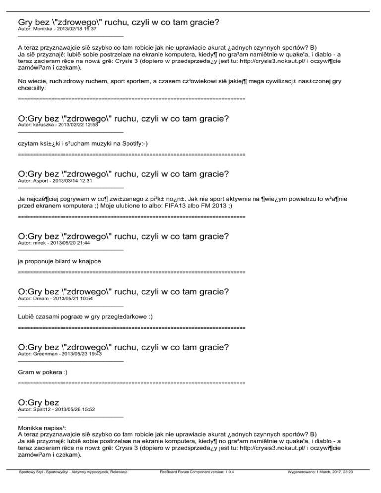 Gry bez \"zdrowego\" ruchu, czyli w co tam gracie? Autor: Monikka - 2013/02/18 19:37 _____________________________________ A teraz przyznawajcie siê szybko co tam robicie jak nie uprawiacie akurat ¿adnych czynnych sportów? B) Ja siê przyznajê: lubiê sobie postrzelaæ na ekranie komputera, kiedy¶ no gra³am namiêtnie w quake'a, i diablo - a teraz zacieram rêce na now± grê: Crysis 3 (dopiero w przedsprzeda¿y jest tu: http://crysis3.nokaut.pl/ i oczywi¶cie zamówi³am i czekam). No wiecie, ruch zdrowy ruchem, sport sportem, a czasem cz³owiekowi siê jakiej¶ mega cywilizacj± nas±czonej gry chce:silly: ============================================================================ O:Gry bez \"zdrowego\" ruchu, czyli w co tam gracie? Autor: karuszka - 2013/02/22 12:58 _____________________________________ czytam ksi±¿ki i s³ucham muzyki na Spotify:-) ============================================================================ O:Gry bez \"zdrowego\" ruchu, czyli w co tam gracie? Autor: Asport - 2013/03/14 12:31 _____________________________________ Ja najczê¶ciej pogrywam w co¶ zwi±zanego z pi³k± no¿n±. Jak nie sport aktywnie na ¶wie¿ym powietrzu to w³a¶nie przed ekranem komputera ;) Moje ulubione to albo: FIFA13 albo FM 2013 ;) ============================================================================ O:Gry bez \"zdrowego\" ruchu, czyli w co tam gracie? Autor: mirek - 2013/05/20 21:44 _____________________________________ ja proponuje bilard w knajpce ============================================================================ O:Gry bez \"zdrowego\" ruchu, czyli w co tam gracie? Autor: Dream - 2013/05/21 10:54 _____________________________________ Lubiê czasami pograæ w gry przegl±darkowe :) ============================================================================ O:Gry bez \"zdrowego\" ruchu, czyli w co tam gracie? Autor: Greenman - 2013/05/23 19:43 _____________________________________ Gram w pokera :) ============================================================================ O:Gry bez Autor: Spirit12 - 2013/05/26 15:52 _____________________________________ Monikka napisa³: A teraz przyznawajcie siê szybko co tam robicie jak nie uprawiacie akurat ¿adnych czynnych sportów? B) Ja siê przyznajê: lubiê sobie postrzelaæ na ekranie komputera, kiedy¶ no gra³am namiêtnie w quake'a, i diablo - a teraz zacieram rêce na now± grê: Crysis 3 (dopiero w przedsprzeda¿y jest tu: http://crysis3.nokaut.pl/ i oczywi¶cie zamówi³am i czekam). Sportowy Styl - SportowyStyl - Aktywny wypoczynek, Rekreacja FireBoard Forum Component version: 1.0.4 Wygenerowano: 1 March, 2017, 23:23 No wiecie, ruch zdrowy ruchem, sport sportem, a czasem cz³owiekowi siê jakiej¶ mega cywilizacj± nas±czonej gry chce:silly: Ja lubiê graæ w gry on-line, np. monopol, makao :) ============================================================================ O:Gry bez \"zdrowego\" ruchu, czyli w co tam gracie? Autor: Kujawiak - 2013/05/29 16:34 _____________________________________ simsy :P ============================================================================ O:Gry bez \"zdrowego\" ruchu, czyli w co tam gracie? Autor: Fersztof - 2013/05/30 21:56 _____________________________________ Z komputerowych gier to World of Tanks ============================================================================ O:Gry bez \"zdrowego\" ruchu, czyli w co tam gracie? Autor: Blackie - 2013/05/31 23:56 _____________________________________ Ja w wolnym czasie oprócz uprawiania sportów lubie sobie poczytac, pos³uchac dobrej muzyki,albo spotkac sie z przyjació³mi, warto tez wybrac sie w jakies ciekawe miejsce i porobic zdjêcia,albo pój¶c na piknik. :) ============================================================================ O:Gry bez \"zdrowego\" ruchu, czyli w co tam gracie? Autor: Demianno - 2013/06/02 15:17 _____________________________________ Darty, jakie¶ planszówki (scrabble czy eurobiznes) ============================================================================ O:Gry bez \"zdrowego\" ruchu, czyli w co tam gracie? Autor: kowal - 2013/06/02 16:09 _____________________________________ Ja gram w World of tanks oraz wiêkszo¶æ gier karcianych :) ============================================================================ O:Gry bez \"zdrowego\" ruchu, czyli w co tam gracie? Autor: GlobalPink - 2013/06/02 22:01 _____________________________________ Ja najczê¶ciej gram w GTA III :P ============================================================================ O:Gry bez \"zdrowego\" ruchu, czyli w co tam gracie? Autor: Barbecue - 2013/06/04 15:32 _____________________________________ Gram w Emergency 2012 :) Ciekawe misje, dobra oprawa graficzna, dobra optymalizacja. Rozgrywka zosta³a nieco u³atwiona, poniewa¿ nie trzeba wzywaæ jednostek z centrum dowodzenia. Wszystkie potrzebne jednostki s± ju¿ na miejscu zdarzenia. ============================================================================ Sportowy Styl - SportowyStyl - Aktywny wypoczynek, Rekreacja FireBoard Forum Component version: 1.0.4 Wygenerowano: 1 March, 2017, 23:23 O:Gry bez \"zdrowego\" ruchu, czyli w co tam gracie? Autor: Foretti - 2013/06/07 13:32 _____________________________________ Te¿ gra³em w Emergency 2012, ale niestety misje schematyczne, niema identyczne jak w poprzednich czê¶ciach, ten sam schemat dzia³ania. Grafika brzydka, szczególnie pojazdy wygl±daj± jak prostok±tny z na³o¿on± p³ask± tekstur±. Zupe³nie nie wci±ga. ============================================================================ O:Gry bez \"zdrowego\" ruchu, czyli w co tam gracie? Autor: Globall - 2013/06/17 18:28 _____________________________________ Gra w karty w dobrym towarzystwie. ============================================================================ O:Gry bez \"zdrowego\" ruchu, czyli w co tam gracie? Autor: krokodile1 - 2013/06/27 15:02 _____________________________________ ja tam napieprzam we wszytko co fanta
