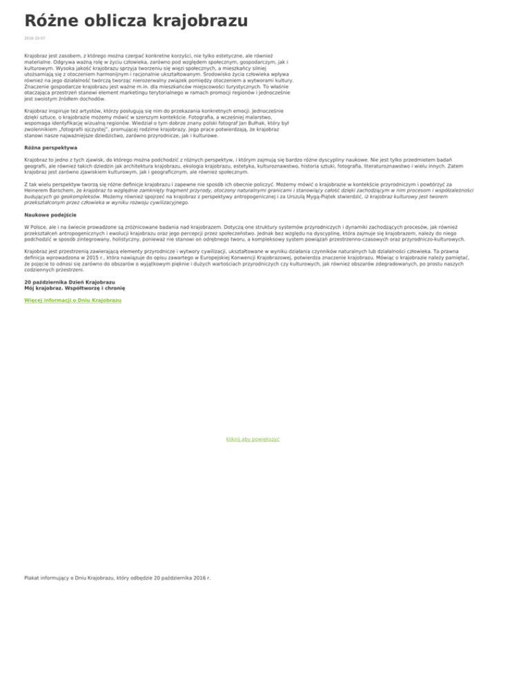 Różne oblicza krajobrazu 2016-10-07 Krajobraz jest zasobem, z którego można czerpać konkretne korzyści, nie tylko estetyczne, ale również materialne. Odgrywa ważną rolę w życiu człowieka, zarówno pod względem społecznym, gospodarczym, jak i kulturowym. Wysoka jakość krajobrazu sprzyja tworzeniu się więzi społecznych, a mieszkańcy silniej utożsamiają się z otoczeniem harmonijnym i racjonalnie ukształtowanym. Środowisko życia człowieka wpływa również na jego działalność twórczą tworząc nierozerwalny związek pomiędzy otoczeniem a wytworami kultury. Znaczenie gospodarcze krajobrazu jest ważne m.in. dla mieszkańców miejscowości turystycznych. To właśnie otaczająca przestrzeń stanowi element marketingu terytorialnego w ramach promocji regionów i jednocześnie jest swoistym źródłem dochodów. Krajobraz inspiruje też artystów, którzy posługują się nim do przekazania konkretnych emocji. Jednocześnie dzięki sztuce, o krajobrazie możemy mówić w szerszym kontekście. Fotografia, a wcześniej malarstwo, wspomaga identyfikację wizualną regionów. Wiedział o tym dobrze znany polski fotograf Jan Bułhak, który był zwolennikiem „fotografii ojczystej”, promującej rodzime krajobrazy. Jego prace potwierdzają, że krajobraz stanowi nasze najważniejsze dziedzictwo, zarówno przyrodnicze, jak i kulturowe. Różna perspektywa Krajobraz to jedno z tych zjawisk, do którego można podchodzić z różnych perspektyw, i którym zajmują się bardzo różne dyscypliny naukowe. Nie jest tylko przedmiotem badań geografii, ale również takich dziedzin jak architektura krajobrazu, ekologia krajobrazu, estetyka, kulturoznawstwo, historia sztuki, fotografia, literaturoznawstwo i wielu innych. Zatem krajobraz jest zarówno zjawiskiem kulturowym, jak i geograficznym, ale również społecznym. Z tak wielu perspektyw tworzą się różne definicje krajobrazu i zapewne nie sposób ich obecnie policzyć. Możemy mówić o krajobrazie w kontekście przyrodniczym i powtórzyć za Heinerem Barschem, że krajobraz to względnie zamknięty fragment przyrody, otoczony naturalnymi granicami i stanowiący całość dzięki zachodzącym w nim procesom i współzależności budujących go geokompleksów. Możemy również spojrzeć na krajobraz z perspektywy antropogenicznej i za Urszulą Mygą-Piątek stwierdzić, iż krajobraz kulturowy jest tworem przekształconym przez człowieka w wyniku rozwoju cywilizacyjnego. Naukowe podejście W Polsce, ale i na świecie prowadzone są zróżnicowane badania nad krajobrazem. Dotyczą one struktury systemów przyrodniczych i dynamiki zachodzących procesów, jak również przekształceń antropogenicznych i ewolucji krajobrazu oraz jego percepcji przez społeczeństwo. Jednak bez względu na dyscyplinę, która zajmuje się krajobrazem, należy do niego podchodzić w sposób zintegrowany, holistyczny, ponieważ nie stanowi on odrębnego tworu, a kompleksowy system powiązań przestrzenno-czasowych oraz przyrodniczo-kulturowych. Krajobraz jest przestrzenią zawierającą elementy przyrodnicze i wytwory cywilizacji, ukształtowane w wyniku działania czynników naturalnych lub działalności człowieka. Ta prawna definicja wprowadzona w 2015 r., która nawiązuje do opisu zawartego w Europejskiej Konwencji Krajobrazowej, potwierdza znaczenie krajobrazu. Mówiąc o krajobrazie należy pamiętać, że pojęcie to odnosi się zarówno do obszarów o wyjątkowym pięknie i dużych wartościach przyrodniczych czy kulturowych, jak również obszarów zdegradowanych, po prostu naszych codziennych przestrzeni. 20 października Dzień Krajobrazu Mój krajobraz. Współtworzę i chronię Więcej informacji o Dniu Krajobrazu kliknij aby powiększyć Plakat informujący o Dniu Krajobrazu, który odbędzie 20 października 2016 r.