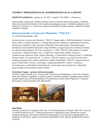 TWÓRCY PROFESJONALNI, NIEPROFESJONALNI, LUDOWI Józefa Frysztakowa – poetka, ur. W 1921 r. zmarła 17.04.2008 r. w Tarnowcu. Nauczycielka, społecznik i działacz kultury, znana w regionie tarnowskim poetka, członkini kilku stowarzyszeń literackich, wielce zasłużona pedagog, ucząca w szkołach podstawowych i średnich w Tarnowie i w Tarnowcu, odznaczona Złotym Krzyżem Zasługi, członkini Związku Literatów Polskich. Stowarzyszenie Artystyczne Plastyków "TĘCZA" 33-150 Wola Rzędzińska 154b Stowarzyszenie Artystyczne Plastyków "TĘCZA" skupia osoby z Woli Rzędzińskiej, Tarnowa i okolic, które z własnej inicjatywy i wewnętrznej potrzeby zajmują się amatorską twórczością artystyczną, traktując to jako ucieczkę od kłopotów dnia codziennego. Rejestracja grupy kilkunastu osób umożliwia pokazanie swego dorobku w miejscowościach, do których trudniej jest dotrzeć indywidualnie. Od czasu rejestracji w r. 1999 "TĘCZA" brała udział w licznych wystawach w Domach Kultury, m.in. w Dąbrowie Tarnowskiej, Żabnie, Tuchowie, Ciężkowicach, Krakowie, Skale, Pleśnej, Brzesku, w Tarnowskim Centrum Kultury i w budynku Gminy Tarnów. W sumie było ok. 15 wystaw. "TĘCZA" skupia w tej chwili 18 osób, które zajmują się malarstwem, rzeźbą, gobelinem i haftem. Działalność "TĘCZY" finansowana jest przez Urząd Gminy Tarnów, co pomaga w urządzaniu plenerów, wystaw i wernisaży. Uczestniczymy w obchodach świąt ludowych, wystawiając prace artystyczne i rękodzieło, przyczyniając się do promocji Gminy Tarnów. Grażyna Cygan – prezes stowarzyszenia Grażyna Cygan, urodziła się w Turynie koło Tomaszowa Lubelskiego w 1953 roku. Rodzice i sama pani Grażyna wspomina, iż pierwsze prace rysowała na piasku. Niedługo potem rodzice przeprowadzili się na Wolę Rzędzińską. Po ukończeniu Liceum Sztuk Pięknych w Tarnowie pracowała w swym zawodzie jako dekoratorka. Jan Kuta Jan Kuta, urodził się 23 grudnia 1943 roku w Woli Rzędzińskiej. W latach 1950-1957 uczył się w Szkole Podstawowej nr 1. Naukę kontynuował w Jędrzejowie gdzie chodził do Liceum Ogólnokształcącego. Po maturze studiował matematykę na Uniwersytecie Jagiellońskim. Po przejściu na emeryturę zajął się tworzeniem amatorskich rzeźb, głównie płaskorzeźb i postaci świętych. Wiktoria Małochleb Wiktoria Małochleb, urodziła się 15 grudnia 1935 roku w Woli Rzędzińskiej. W Szkole Podstawowej rysunku uczyła ją pani Helena Furmańska. Ona, wraz z Panem kierownikiem Stanisławem Stańczykiem i wychowawczynią Panią Adelą Błocka, skłonili ją do kształcenia się na w Tarnowskim Liceum Technik i Sztuk Plastycznych. Józefa Kuta Józefa Kuta, urodziła się 15 marca 1933 roku w Woli Rzędzińskiej. Tutaj chodziła do Szkoły Podstawowej, którą ukończyła 1947 roku. W Szkole Podstawowej, rysunku uczyła ją pani Józefa Mazurkiewicz. Po ukończeniu szkoły podstawowej zdała egzamin wstępny do Liceum Technik i Sztuk Plastycznych w Tarnowie. Okres ten wspomina jako coś cudownego w jej edukacji. Pani Józefa zawsze chciała malować, brała udział wielu wystawach, należała do Związku Polskich Artystów Plastyków. Twórcy nieprofesjonalni Stanisław Bałut - malarz Bronisława Cichoń – hafciarka Grażyna Cygan – malarka Jan Gajdur – malarz Marta Grzech – hafciarka Stanisław Jachym – malarz i rzeźbiarz Krystyna Korus – hafciarka Grażyna Kowalska – hafciarka Helena Kozioł – hafciarka, malarka Józefa Kuta – hafciarka Jan Kuta – rzeźbiarz Ewa Kuta – wyrób gobelinów Wanda Łachut – wyrób makram Kazimiera Małochleb – hafciarka Wiktoria Małochleb – malarka Bożena Mróz – hafciarka Maria Podoluch – plastyk (ceramika) Rozalia Rdzak – hafciarka Anna Słowik – malarka Władysław Stach – malarz, rzeźbiarz Chór dziecięcy Campanella ma długie tradycje. Jest kontynuacją szkolnego zespołu, który istniał w Szkole Podstawowej Nr 1 od 1965r.i prowadzony był przez Janinę Bałuszyńską. Od chwili powstania chór szkolny uświetniał swoimi występami uroczystości szkolne, wiejskie, gminne. Brał udział w wojewódzkich i międzywojewódzkich konkursach i przeglądach zdobywając wysokie nagrody i wyróżnienia. W 1980r. z okazji z okazji Dnia Dziecka jako najlepszy zespół w województwie dał koncert w Warszawie. W 1989r. pracę z chórem rozpoczęła p. Małgorzata Bałuszyńska. Zespół przybiera nazwę "Campanella". Repertuar chóru stanowi muzyka religijna i świecka a capella, pieśni ludowe i piosenki dziecięce; muzyka dawna i współczesna - kompozytorów polskich i obcych. Chór nadal brał udział we wszystkich uroczystościach szkolnych i środowiskowych. Uczestniczył w konkursach i festiwalach zdobywając wysokie nagrody. Należą do nich: Puchar Tatr w Zakopanem - 1989, 1990,1991, I Miejsce i najwyższa punktacja w przeglądach wojewódzkich i między wojewódzkich w Tarnowie 1989,1990,1992, Grand Prix i Złoty kamerton na X, XII, XIV ogólnopolskim Przeglądzie chórów szkolnych w Bydgoszczy 1990,1992,1994, Nagroda Prezydenta Miasta na XII Schola Cantorum w Kaliszu - 1990r., Harfa Eola na Schola Cantorum w Kaliszu 1991, 1994, 1997, Wyróżnienie w konkursie Legnica Cantat 1991r., Wyróżnienie na XXVI Festiwalu Pieśni Chóralnej w Międzyzdrojach - 1991r., I Miejsce i nagrodę specjalną w Konkursie Kolęd w Myślenicach 1992 r. Chór " Campanella" uczestniczył w licznych seminariach, sympozjachi konferencjach naukowych dla nauczycieli muzyki dając pokazy pracy i kocerty: Tarnów1998, 1990,1991, Łańcut 1990, Katowice (Akademia Muzyczna)1991, Kraków (WSP) 1992. Chór dawał koncerty w wielu miastach Polski m.in. w Tarnowie, Zakopanem, Katowicach, Goleniowie. W czerwcu 1992r. uczestniczył w Deutsche Katholikentag Karlsruhe (Niemcy) oraz koncertował w Norymberdze, Mannheim, Worms, Mainz. Zespól dokonał nagrań radiowych dla Radia Kraków 1990 i 1991 oraz nagrań telewizyjnych do programu "Tęczow