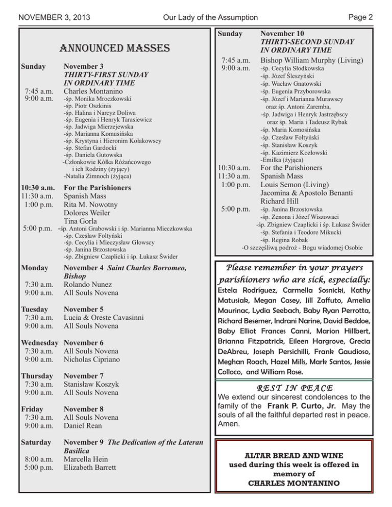 NOVEMBER 3, 2013 Sunday 7:45 a.m. 9:00 a.m. 10:30 a.m. 11:30 a.m. 1:00 p.m. Our Lady of the Assumption ANNOUNCED MASSES November 3 THIRTY-FIRST SUNDAY IN ORDINARY TIME Charles Montanino -śp. Monika Mroczkowski -śp. Piotr Oszkinis -śp. Halina i Narcyz Doliwa -śp. Eugenia i Henryk Tarasiewicz -śp. Jadwiga Mierzejewska -śp. Marianna Komusińska -śp. Krystyna i Hieronim Kołakowscy -śp. Stefan Gardocki -śp. Daniela Gutowska -Członkowie Kółka Różańcowego i ich Rodziny (żyjący) -Natalia Zimnoch (żyjąca) For the Parishioners Spanish Mass Rita M. Nowotny Dolores Weiler Tina Gorla 5:00 p.m. -śp. Antoni Grabowski i śp. Marianna Mieczkowska Monday 7:30 a.m. 9:00 a.m. -śp. Czesław Foltyński -śp. Cecylia i Mieczysław Głowscy -śp. Janina Brzostowska -śp. Zbigniew Czaplicki i śp. Łukasz Świder November 4 Saint Charles Borromeo, Bishop Rolando Nunez All Souls Novena Tuesday 7:30 a.m. 9:00 a.m. November 5 Lucia & Oreste Cavasinni All Souls Novena Thursday 7:30 a.m. 9:00 a.m. November 7 Stanisław Koszyk All Souls Novena Saturday November 9 The Dedication of the Lateran Basilica Marcella Hein Elizabeth Barrett Wednesday November 6 7:30 a.m. All Souls Novena 9:00 a.m. Nicholas Cipriano Friday 7:30 a.m. 9:00 a.m. 8:00 a.m. 5:00 p.m. November 8 All Souls Novena Daniel Rean Sunday 7:45 a.m. 9:00 a.m. 10:30 a.m. 11:30 a.m. 1:00 p.m. 5:00 p.m. Page 2 November 10 THIRTY-SECOND SUNDAY IN ORDINARY TIME Bishop William Murphy (Living) -śp. Cecylia Słodkowska -śp. Józef Śleszyński -śp. Wacław Gnatowski -śp. Eugenia Przyborowska -śp. Józef i Marianna Murawscy oraz śp. Antoni Zaremba, -śp. Jadwiga i Henryk Jastrzębscy oraz śp. Maria i Tadeusz Rybak -śp. Maria Komosińska -śp. Czesław Foltyński -śp. Stanisław Koszyk -śp. Kazimierz Kozłowski -Emilka (żyjąca) For the Parishioners Spanish Mass Louis Semon (Living) Jacomina & Apostolo Benanti Richard Hill -śp. Janina Brzostowska -śp. Zenona i Józef Wiszowaci -śp. Zbigniew Czaplicki i śp. Łukasz Świder -śp. Stefania i Teodore Mikucki -śp. Regina Robak -O szczęśliwą podroż - Bogu wiadomej Osobie Please remember in your prayers parishioners who are sick, especially: Estela Rodríguez, Carmella Sosnicki, Kathy Matusiak, Megan Casey, Jill Zaffuto, Amelia Maurinac, Lydia Seebach, Baby Ryan Perrotta, Richard Besemer, Indrani Narine, David Beddoe, Baby Elliot Frances Canni, Marion Hillbert, Brianna Fitzpatrick, Eileen Hargrove, Grecia DeAbreu, Joseph Persichilli, Frank Gaudioso, Meghan Roach, Hazel Mills, Mark Santos, Jessie Colloco, and William Rose. REST IN PEACE We extend our sincerest condolences to the family of the Frank P. Curto, Jr. May the souls of all the faithful departed rest in peace. Amen. ALTAR BREAD AND WINE used during this week is offered in memory of CHARLES MONTANINO NOVEMBER 3, 2013 Page 3 Our Lady of the Assumption NATIONAL NIGHT OF PRAYER FOR LIFE We are seeking interested parishioners from our community of faith to join us in preparing a prayer service for the National Night of Prayer for Life scheduled for December 8th-9th. Being a part of such a diverse and unique parish, we have a greater opportunity to gather ways to foster devotion to our Blessed Mother, our protector. Please leave your name and phone number at the Rectory and we will get back to you. Pray For those Serving in the Military Staff Sgt. Christopher Dunbscomb Sgt. Eduardo Sime God of Mercy, we beg You now to protect in a special way, those who are defending us and the Country we love. Bless them and take care of them. Amen “MOVING ON” Support Group for widows and widowers Friday, November 8th, 7:30PM, Room 259 Church of St. Joseph 39 N Carll Ave, Babylon. If you would like further information, please call either (631) 661-8994 or (631) 422-0957 and leave a message. Readings for Sunday, November 10,2013 2 Mc 7:1-2, 9-14 2 Thes 2:16----3:5 Lk 20:27-38 or 20:27, 34-38 (156) ROSARY ALTAR SOCIETY Meeting Please join the Rosary Altar Society on Monday, November 4th at 7PM, in the Lower Church Hall. FROM THE PASTOR’S DESK… This year the St. Agnes medal was awarded to Andrzej and Anna Kuczynski. Andrzej and Anna have been an integral part of our parish since 1996. Through the years, Andrzej has served as a Eucharistic Minister, he plays an important part of our Mass preparation and he volunteers to help at the Feast. He is always ready to lend a hand whenever it is needed at the parish. Anna serves as a lector, she is a Rosarian, a religious education teacher and is on our Pastoral Council. This year Andrzej and Anna took an active role in our Parish Renovation Campaign. They serve as captains of the committee and have helped speak about the campaign at masses and through telephone callings. It has been a blessing to have Andrzej and Anna as members of our parish. Fr. Dariusz SACRIFICIAL GIVING Parish Financial Summary Week of October 27, 2013 Weekly Budget $ 10,300.00 Collection $ 10,626.00 +/- $10,300 +$ 326.00 Year to date -$ 1,345.00 Mass Attendance 2364 Same week last year $ 10,226.00 Your kind and generous support of our parish is greatly appreciated. Parish Renovation Campaign “Our Parish . . . Our Future” Total Pledged: Paid to Date: # of Gifts: % of Goal: Campaign Goal: Needed to Reach Goal: $ 531,236 $ 286,834 442 97% $ 550,000 $ 18,764 Thank you for your support! OU R LA DY OF T HE A S SUM PTI ON A NNUA L F E AST SAVE TH E DATE - AUGUST 06-10, 201 4 NOVEMBER 3, 2013 Our Lady of the Assumption You can heal your marriage Do you feel alone? Are you frustrated or angry with each other? Retrouvaille helps couples through difficult times in their marriages. This program has helped thousands of couples worldwide experiencing ALL TYPES of marital difficulties. For confidential information about the Retrouvaille program, or to register for the upcoming weekend beginning on Friday, November 8th, at the Montfort Retreat house in Bay Shore, please call 1-800-470-2230. OUTREACH PROGRAM I don’t know about you but I fin
