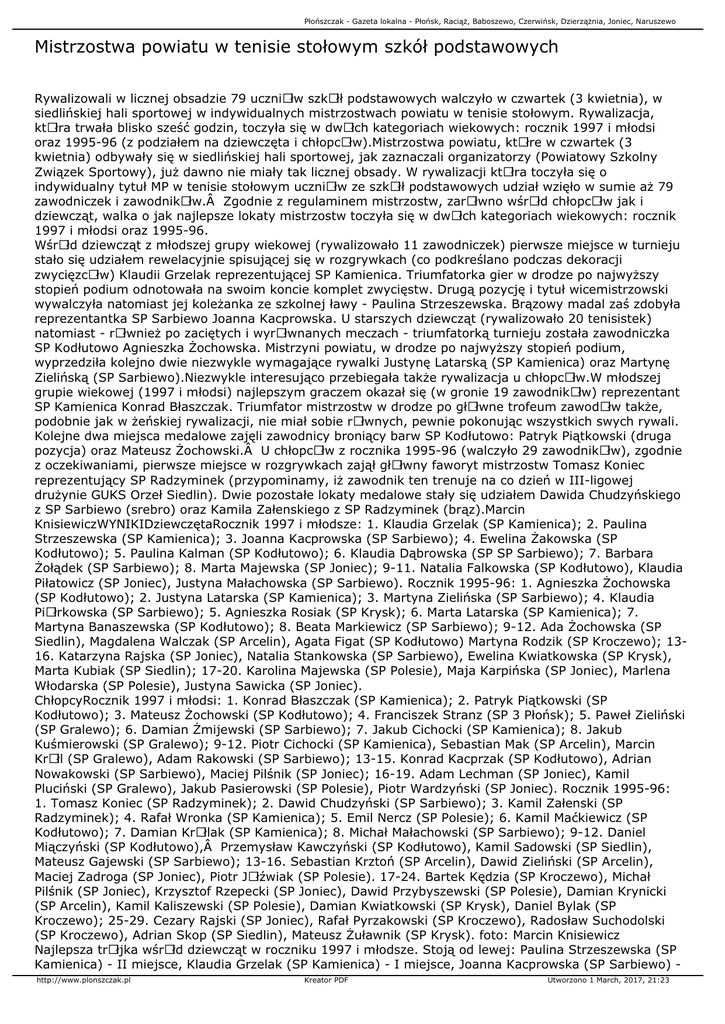 Płońszczak - Gazeta lokalna - Płońsk, Raciąż, Baboszewo, Czerwińsk, Dzierzążnia, Joniec, Naruszewo Mistrzostwa powiatu w tenisie stołowym szkół podstawowych Rywalizowali w licznej obsadzie 79 uczniÃłw szkÃłł podstawowych walczyło w czwartek (3 kwietnia), w siedlińskiej hali sportowej w indywidualnych mistrzostwach powiatu w tenisie stołowym. Rywalizacja, ktÃłra trwała blisko sześć godzin, toczyła się w dwÃłch kategoriach wiekowych: rocznik 1997 i młodsi oraz 1995-96 (z podziałem na dziewczęta i chłopcÃłw).Mistrzostwa powiatu, ktÃłre w czwartek (3 kwietnia) odbywały się w siedlińskiej hali sportowej, jak zaznaczali organizatorzy (Powiatowy Szkolny Związek Sportowy), już dawno nie miały tak licznej obsady. W rywalizacji ktÃłra toczyła się o indywidualny tytuł MP w tenisie stołowym uczniÃłw ze szkÃłł podstawowych udział wzięło w sumie aż 79 zawodniczek i zawodnikÃłw. Zgodnie z regulaminem mistrzostw, zarÃłwno wśrÃłd chłopcÃłw jak i dziewcząt, walka o jak najlepsze lokaty mistrzostw toczyła się w dwÃłch kategoriach wiekowych: rocznik 1997 i młodsi oraz 1995-96. WśrÃłd dziewcząt z młodszej grupy wiekowej (rywalizowało 11 zawodniczek) pierwsze miejsce w turnieju stało się udziałem rewelacyjnie spisującej się w rozgrywkach (co podkreślano podczas dekoracji zwycięzcÃłw) Klaudii Grzelak reprezentującej SP Kamienica. Triumfatorka gier w drodze po najwyższy stopień podium odnotowała na swoim koncie komplet zwycięstw. Drugą pozycję i tytuł wicemistrzowski wywalczyła natomiast jej koleżanka ze szkolnej ławy - Paulina Strzeszewska. Brązowy madal zaś zdobyła reprezentantka SP Sarbiewo Joanna Kacprowska. U starszych dziewcząt (rywalizowało 20 tenisistek) natomiast - rÃłwnież po zaciętych i wyrÃłwnanych meczach - triumfatorką turnieju została zawodniczka SP Kodłutowo Agnieszka Żochowska. Mistrzyni powiatu, w drodze po najwyższy stopień podium, wyprzedziła kolejno dwie niezwykle wymagające rywalki Justynę Latarską (SP Kamienica) oraz Martynę Zielińską (SP Sarbiewo).Niezwykle interesująco przebiegała także rywalizacja u chłopcÃłw.W młodszej grupie wiekowej (1997 i młodsi) najlepszym graczem okazał się (w gronie 19 zawodnikÃłw) reprezentant SP Kamienica Konrad Błaszczak. Triumfator mistrzostw w drodze po głÃłwne trofeum zawodÃłw także, podobnie jak w żeńskiej rywalizacji, nie miał sobie rÃłwnych, pewnie pokonując wszystkich swych rywali. Kolejne dwa miejsca medalowe zajęli zawodnicy broniący barw SP Kodłutowo: Patryk Piątkowski (druga pozycja) oraz Mateusz Żochowski. U chłopcÃłw z rocznika 1995-96 (walczyło 29 zawodnikÃłw), zgodnie z oczekiwaniami, pierwsze miejsce w rozgrywkach zajął głÃłwny faworyt mistrzostw Tomasz Koniec reprezentujący SP Radzyminek (przypominamy, iż zawodnik ten trenuje na co dzień w III-ligowej drużynie GUKS Orzeł Siedlin). Dwie pozostałe lokaty medalowe stały się udziałem Dawida Chudzyńskiego z SP Sarbiewo (srebro) oraz Kamila Załenskiego z SP Radzyminek (brąz).Marcin KnisiewiczWYNIKIDziewczętaRocznik 1997 i młodsze: 1. Klaudia Grzelak (SP Kamienica); 2. Paulina Strzeszewska (SP Kamienica); 3. Joanna Kacprowska (SP Sarbiewo); 4. Ewelina Żakowska (SP Kodłutowo); 5. Paulina Kalman (SP Kodłutowo); 6. Klaudia Dąbrowska (SP SP Sarbiewo); 7. Barbara Żołądek (SP Sarbiewo); 8. Marta Majewska (SP Joniec); 9-11. Natalia Falkowska (SP Kodłutowo), Klaudia Piłatowicz (SP Joniec), Justyna Małachowska (SP Sarbiewo). Rocznik 1995-96: 1. Agnieszka Żochowska (SP Kodłutowo); 2. Justyna Latarska (SP Kamienica); 3. Martyna Zielińska (SP Sarbiewo); 4. Klaudia PiÃłrkowska (SP Sarbiewo); 5. Agnieszka Rosiak (SP Krysk); 6. Marta Latarska (SP Kamienica); 7. Martyna Banaszewska (SP Kodłutowo); 8. Beata Markiewicz (SP Sarbiewo); 9-12. Ada Żochowska (SP Siedlin), Magdalena Walczak (SP Arcelin), Agata Figat (SP Kodłutowo) Martyna Rodzik (SP Kroczewo); 1316. Katarzyna Rajska (SP Joniec), Natalia Stankowska (SP Sarbiewo), Ewelina Kwiatkowska (SP Krysk), Marta Kubiak (SP Siedlin); 17-20. Karolina Majewska (SP Polesie), Maja Karpińska (SP Joniec), Marlena Włodarska (SP Polesie), Justyna Sawicka (SP Joniec). ChłopcyRocznik 1997 i młodsi: 1. Konrad Błaszczak (SP Kamienica); 2. Patryk Piątkowski (SP Kodłutowo); 3. Mateusz Żochowski (SP Kodłutowo); 4. Franciszek Stranz (SP 3 Płońsk); 5. Paweł Zieliński (SP Gralewo); 6. Damian Żmijewski (SP Sarbiewo); 7. Jakub Cichocki (SP Kamienica); 8. Jakub Kuśmierowski (SP Gralewo); 9-12. Piotr Cichocki (SP Kamienica), Sebastian Mak (SP Arcelin), Marcin KrÃłl (SP Gralewo), Adam Rakowski (SP Sarbiewo); 13-15. Konrad Kacprzak (SP Kodłutowo), Adrian Nowakowski (SP Sarbiewo), Maciej Pilśnik (SP Joniec); 16-19. Adam Lechman (SP Joniec), Kamil Pluciński (SP Gralewo), Jakub Pasierowski (SP Polesie), Piotr Wardzyński (SP Joniec). Rocznik 1995-96: 1. Tomasz Koniec (SP Radzyminek); 2. Dawid Chudzyński (SP Sarbiewo); 3. Kamil Załenski (SP Radzyminek); 4. Rafał Wronka (SP Kamienica); 5. Emil Nercz (SP Polesie); 6. Kamil Maćkiewicz (SP Kodłutowo); 7. Damian KrÃłlak (SP Kamienica); 8. Michał Małachowski (SP Sarbiewo); 9-12. Daniel Miączyński (SP Kodłutowo), Przemysław Kawczyński (SP Kodłutowo), Kamil Sadowski (SP Siedlin), Mateusz Gajewski (SP Sarbiewo); 13-16. Sebastian Krztoń (SP Arcelin), Dawid Zieliński (SP Arcelin), Maciej Zadroga (SP Joniec), Piotr JÃłźwiak (SP Polesie). 17-24. Bartek Kędzia (SP Kroczewo), Michał Pilśnik (SP Joniec), Krzysztof Rzepecki (SP Joniec), Dawid Przybyszewski (SP Polesie), Damian Krynicki (SP Arcelin), Kamil Kaliszewski (SP Polesie), Damian Kwiatkowski (SP Krysk), Daniel Bylak (SP Kroczewo); 25-29. Cezary Rajski (SP Joniec), Rafał Pyrzakowski (SP Kroczewo), Radosław Suchodolski (SP Kroczewo), Adrian Skop (SP Siedlin), Mateusz Żuławnik (SP Krysk). foto: Marcin Knisiewicz Najlepsza trÃłjka wśrÃłd dziewcząt w roczniku 19