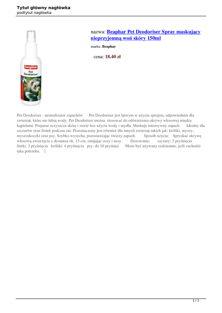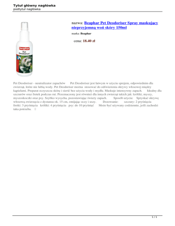 Tytuł główny nagłówka podtytuł nagłówka nazwa: Beaphar Pet Deodoriser Spray maskujący nieprzyjemną woń skóry 150ml marka: Beaphar cena: 18.40 zł Pet Deodoriser - neutralizator zapachów Pet Deodoriser jest łatwym w użyciu sprejem, odpowiednim dla zwierząt, które nie lubią wody. Pet Deodoriser można stosować do odświeżenia okrywy włosowej między kąpielami. Preparat oczyszcza skórę i sierść bez użycia wody i mydła. Maskuje intensywny zapach. Idealny dla szczurów oraz fretek podczas rui. Przeznaczony jest również dla innych zwierząt takich jak: króliki, myszy, myszoskoczki oraz psy. Szybko wysycha, pozostawiając świeży zapach. Sposób użycia: Spryskać okrywę włosową zwierzęcia z dystansu ok. 15 cm, omijając oczy i uszy. Dozowanie: szczury: 2 pryśnięcia fretki: 3 pryśnięcia króliki: 4 pryśnięcia psy: do 10 pryśnięć Może być używany codziennie, jeśli zachodzi taka potrzeba. 1/1