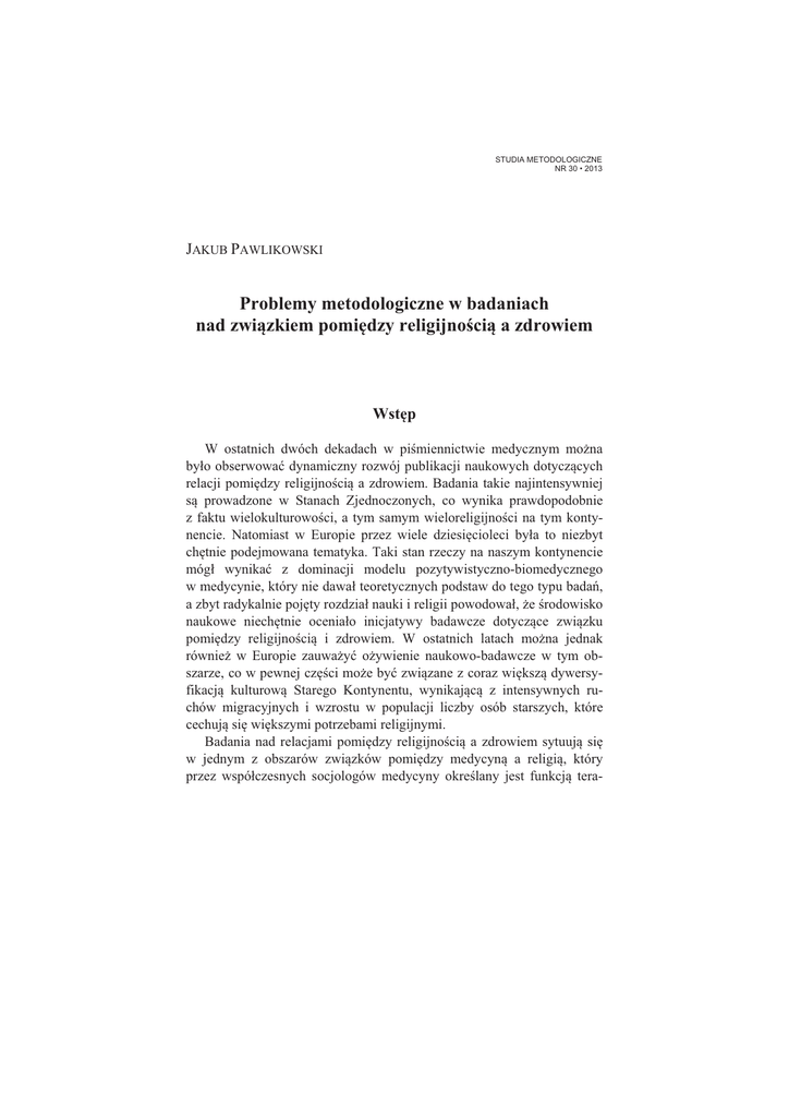STUDIA METODOLOGICZNE NR 30 • 2013 JAKUB PAWLIKOWSKI Problemy metodologiczne w badaniach nad zwi zkiem pomi!dzy religijno"ci a zdrowiem Wst!p W ostatnich dwóch dekadach w pi miennictwie medycznym mo!na by"o obserwowa# dynamiczny rozwój publikacji naukowych dotycz$cych relacji pomi%dzy religijno ci$ a zdrowiem. Badania takie najintensywniej s$ prowadzone w Stanach Zjednoczonych, co wynika prawdopodobnie z faktu wielokulturowo ci, a tym samym wieloreligijno ci na tym kontynencie. Natomiast w Europie przez wiele dziesi%cioleci by"a to niezbyt ch%tnie podejmowana tematyka. Taki stan rzeczy na naszym kontynencie móg" wynika# z dominacji modelu pozytywistyczno-biomedycznego w medycynie, który nie dawa" teoretycznych podstaw do tego typu bada&, a zbyt radykalnie poj%ty rozdzia" nauki i religii powodowa", !e rodowisko naukowe niech%tnie ocenia"o inicjatywy badawcze dotycz$ce zwi$zku pomi%dzy religijno ci$ i zdrowiem. W ostatnich latach mo!na jednak równie! w Europie zauwa!y# o!ywienie naukowo-badawcze w tym obszarze, co w pewnej cz% ci mo!e by# zwi$zane z coraz wi%ksz$ dywersyfikacj$ kulturow$ Starego Kontynentu, wynikaj$c$ z intensywnych ruchów migracyjnych i wzrostu w populacji liczby osób starszych, które cechuj$ si% wi%kszymi potrzebami religijnymi. Badania nad relacjami pomi%dzy religijno ci$ a zdrowiem sytuuj$ si% w jednym z obszarów zwi$zków pomi%dzy medycyn$ a religi$, który przez wspó"czesnych socjologów medycyny okre lany jest funkcj$ tera- 124 JAKUB PAWLIKOWSKI peutyczno-wspieraj$c$ albo uzdrowie&cz$ religii. Spo ród innych funkcji, jakie religia mo!e spe"nia# w stosunku do medycyny, wyró!nia si% eksplikacyjno-sensotwórcz$ (wp"ywa na rozumienie niektórych poj%#, np. choroba, cierpienie, mier#, poprzez odniesienie do Boga i religijnie zdefiniowanego sensu !ycia), normatywno-kontroln$ (okre la normy oceny moralnej i kszta"tuje stosunek wobec wielu kwestii (np. bioetycznych), opieku&czo-charytatywn$ (stymuluje do organizowania pomocy chorym, niekiedy równie! w wymiarze instytucjonalnym, np. szpitale, hospicja) [Tobiasz-Adamczyk, 2000]. Celem artyku"u jest przedstawienie i analiza najwa!niejszych problemów metodologicznych pojawiaj$cych si% w badaniach nad zwi$zkiem pomi%dzy religijno ci$ a zdrowiem. Rozwa!ania metodologiczne poprzedzone zosta"y historycznym wprowadzeniem ukazuj$cym dynamik% rozwoju bada& naukowych w tym obszarze oraz opisuj$cym stan aktualny – obecnie liczba publikacji na ten temat przekroczy"a kilkana cie tysi%cy, a przedstawiciele tego nurtu postuluj$ poszerzenie dotychczasowego biopsychospo"ecznego modelu rozumienia choroby o wymiar egzystencjalno-duchowy. W poszczególnych rozdzia"ach omówiono kwestie zwi$zane z definiowaniem poj%cia religijno ci i duchowo ci oraz metody stosowane w pomiarze tych sfer, wskazuj$c narz%dzia najbardziej adekwatne do polskich warunków. Na ko&cu omówiono problem wnioskowania o zwi$zku przyczynowo-skutkowym pomi%dzy religijno ci$ a zdrowiem oraz kwestie dotycz$ce opracowania modelu teoretycznego, wyja niaj$cego mechanizm oddzia"ywania religijno ci na zdrowie. Zarys historii bada# naukowych nad zwi zkiem pomi!dzy religijno"ci i zdrowiem Pierwsze opracowania wskazuj$ce na zale!no ci pomi%dzy religijnoci$ a osobowo ci$ oraz zachowaniami maj$cymi zwi$zek ze zdrowiem pojawi"y si% na prze"omie XIX i XX wieku. Na przyk"ad Émile Durkheim w swoim dziele o samobójstwie z 1897 roku wskazuje na religijno # jako jeden z czynników przeciwdzia"aj$cych [Durkheim, 2006]. W latach 20. Problemy metodologiczne w badaniach nad zwi$zkiem pomi%dzy religijno ci$ a zdrowiem 125 XX wieku Sigmund Freud popularyzowa" swoj$ hipotez% rozwoju nerwic na pod"o!u religijnym, w której wyrazi" negatywn$ opini% wobec religii1. Natomiast jego ucze&, Carl Gustav Jung, zaj$" przeciwstawne stanowisko, wskazuj$c, !e religijno # jest wa!nym spoiwem osobowo ci cz"owieka i jej utrata mo!e zniszczy# !ycie osobowe cz"owieka (podobnie uwa!a" Erich Fromm [Fromm, 1996]). Pierwsze systematyczne badania nad dojrza"o ci$ religijn$ i wp"ywem religijno ci na jednostk% opublikowa" w latach 50. XX wieku Gordon Allport, a w kolejnej dekadzie zacz%"o pojawia# si% wi%cej bada& nad wp"ywem religijno ci na zdrowie. W roku 1962 powsta"o wydawane do dzisiaj naukowe czasopismo Journal of Religion and Health (1962), które od wielu lat znajduje si% równie! na tzw. Li cie Filadelfijskiej. W latach 80. zacz%to dostrzega# rol% religijno ci w psychoterapii i opracowano kilka programów psychoterapeutycznych dla osób uzale!nionych, uwzgl%dniaj$cych odwo"anie do warto ci religijnych. W ostatnich dekadach XX wieku religijno # i duchowo # jako zmienne w badaniach medycznych by"y u!ywane do # rzadko, np. w latach 1991– –1995 tylko 1,2% bada& opublikowanych na "amach czterech du!ych czasopism psychiatrycznych [Weaver, Samford, Larson i in., 1998] i internistycznych zawiera"o powy!sze zmienne [Orr, Isaac, 1992]. Jedynie w badaniach publikowanych na "amach czasopism dotycz$cych zdrowia m"odzie!y oraz czasopism przeznaczonych dla piel%gniarek dotycz$cych zdrowia psychicznego odsetek ten by" wy!szy (odpowiednio 11,8% i 10%) [Weaver, Flannelly, Flannelly i in., 1998; Weaver, Samford, Morgan i in., 2000]. Zauwa!a si% jednak w tym wzgl%dzie tendencj% wzrostow$. Autorzy z Mayo Clinic w swojej metaanalizie bada& nad zwi$zkiem religijno ci i zdrowia stwierdzili, !e w latach 1970–2000 opublikowano w literaturze medycznej oko"o 1200 bada& nad tym zagadnieniem, z czego wi%kszo # (850) dotyczy"a zwi$zku religijno ci ze zdrowiem psychicznym, a oko"o 350 publikacji opisywa"a zale!no ci mi%dzy zdrowiem fizycznym a reli________________ 1 Hipoteza Freuda zosta"a przetestowana przez badaczy w latach 80., ale po przeanalizowaniu 24 bada& nie znaleziono zwi$zku pomi%dzy religijno ci$ a patologicznymi zaburzeniami psychicznymi [Bergin, 1983]. Niektórzy podkre laj$ te!, !e obserwacje Freuda opiera"y si% na ograniczonej liczbie przypadków, specyficznej grupie pacjentów i zdaniem wielu bezpodstawnie
