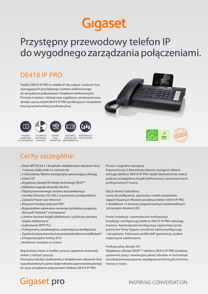 Przystępny przewodowy telefon IP do wygodnego zarządzania połączeniami. DE410 IP PRO Telefon DE410 IP PRO to telefon IP dla małych i średnich firm, wymagających przystępnego systemu telefonicznego do zarządzania połączeniami i książkami telefonicznymi. Prostota instalacji i obsługi oraz wyjątkowy szerokopasmowy dźwięk czynią model DE410 IP PRO perfekcyjnym narzędziem intuicyjnej komunikacji profesjonalnej. KSIĄŻKA 7 KLAWISZY ADRESOWA PROGRAMONA 200 WPISÓW WALNYCH LISTA MAKS. KONFERENCJE DŹWIĘK 30 POŁĄCZEŃ TRÓJSTRONNE HIGH DEFINITION NIEODEBRANYCH Cechy szczególne: • Ekran WFSTN 64 x 128 pikseli z dodatkowym obszarem ikon, 5 wierszy, białe znaki na czarnym tle • 5-kierunkowy klawisz nawigacyjny upraszczający obsługę • 6 kont SIP • Wyjątkowy dźwięk HD dzięki technologii HDSP™1 • Oddzielne sygnały dzwonka dla linii • Złącze przewodowego zestawu słuchawkowego • Interfejs Ethernet (10/100) z 2-portowym przełącznikiem • Zasilanie Power over Ethernet • Klasyczne funkcje połączeń PBX2 • Bezpośrednie wybieranie numerów kontaktów programu Microsoft Outlook™ z komputera3 • Lokalne sieciowe książki telefoniczne i publiczna sieciowa książka telefoniczna1 • Szyfrowanie SRTP/TLS • Profesjonalna, bezobsługowa, automatyczna konfiguracja2 • Zgodnośćzaparatamisłuchowymipotwierdzonacertyfikatami4 • Energooszczędne funkcje ECO • Możliwość montażu na ścianie Regulowany ekran w każdej sytuacji zapewnia doskonały widok z różnych pozycji. Intuicyjny interfejs użytkownika z dodatkowym obszarem ikon na podświetlanym czarno-białym ekranie zapewnia łatwy dostęp do opcji zarządzania połączeniami telefonu DE410 IP PRO. Prosta i wygodna nawigacja. Ergonomiczny 5-kierunkowy klawisz nawigacji ułatwia obsługę telefonu DE410 IP PRO dzięki błyskawicznej reakcji podczas przeglądania książki telefonicznej i używania innych profesjonalnych funkcji. Opcje łatwej rozbudowy. Łatwy do podłączenia, opcjonalny moduł rozszerzenia Gigaset Expansion Module powiększa telefon DE410 IP PRO o dodatkowe 14 klawiszy programowalnych podświetlanych czerwonymi diodami LED. Prosta instalacja i automatyczna konfiguracja. Instalację i konfigurację telefonu DE410 IP PRO ułatwiają kreatory. Automatyczna konfiguracja zapewniana przez partnerów firmy Gigaset umożliwia zdalną konfigurację i zarządzanie. Pobierane profile VoIP gwarantują szybkie rozpoczęcie użytkowania. Profesjonalny dźwięk HD. Wyjątkowy dźwięk HDSP™1 telefonu DE410 IP PRO zwiększa sprawność pracy: rewelacyjna jakość dźwięku w technologii szerokopasmowej sprawia, że połączenia brzmią jak rozmowy twarzą w twarz. DE410 IP PRO Doskonały telefon IP dla małych i średnich firm. Dane techniczne: Komunikacja Audio Wszystkie opcje komunikacji niezbędne w zastosowaniach profesjonalnych. • Z łącze zestawu słuchawkowego – RJ-9 • S zerokopasmowy dźwięk HD zgodny z normą TIA/EIA-920 HDSP™ , G.722 • Pełnodupleksowy tryb głośnomówiący o znakomitej jakości dźwięku: duży rezonator w podstawie aparatu • R egulowana głośność: trybu głośnomówiącego, OBSŁUGA MAKSYMALNIE 2 MODUŁÓW ROZSZERZEŃ Z DODATKOWYMI KLAWISZAMI PROGRAMOWALNYMI. 1 • • LAN INTERNET ACCESS słuchawki przewodowej i zestawu słuchawkowego oraz sygnałów dzwonka (5 poziomów) Z godność z aparatami słuchowymi (HAC) zgodnie z normą FCC4 D zwonki w formacie wav DE410 IP PRO GATEWAY LAN GIGASET PBX T500 PRO HEADSET COMPUTER Ekran i interfejs użytkownika • R egulowany, czarno-biały WFSTN o rozdzielczości 64 x 128 pikseli i wymiarach 73 x 39 mm. • P rzyciemniane podświetlenie ekranu (trzy poziomy) • O bsługa wielu języków Klawiatura Książka telefoniczna i wybieranie numerów • K siążka telefoniczna na 200 wpisów w pamięci wewnętrznej • E lementy wpisów: Imię i nazwisko, Biuro 1, Biuro 2, Dom 1, Dom 2, Telefon komórkowy 1, Telefon komórkowy 2 • E dycja książki telefonicznej w menedżerze połączeń • S zybkie wyszukiwanie: znaków lub pełnego tekstu • S ynchronizacja książki telefonicznej z komputerem • L okalne sieciowe książki telefoniczne i dostęp do publicznych sieciowych książek telefonicznych • W yszukiwanie w publicznych książkach telefonicznych i spisie firm; wyszukiwanie odwrotne, wyszukiwanie automatyczne • Prywatna sieciowa książka telefoniczna • Obsługa usługi LDAP (sieciowej firmowej książki telefonicznej) • Automatyczne wyszukiwanie w sieci • Wybieranie numeru z możliwością korekcji przed zestawieniem połączenia • B ezpośrednie wybieranie numerów kontaktów programu Outlook • L ista maks. 30 nieodebranych połączeń z identyfikatorem osoby dzwoniącej i czasem próby połączenia • Konferencje trójstronne • 6 linii równolegle z oddzielnymi identyfikatorami osób dzwoniących • 6 kont sieciowej poczty głosowej • Wyświetlanie czasu połączenia, nazwiska i numeru • Automatyczne ponowne wybieranie numeru, ponowne wybieranie numeru ze spisu połączeń i przy zajętości • Połączenia oczekujące, przekierowywanie i przekazywanie • 5 -kierunkowy klawisz nawigacyjny upraszczający obsługę • 7 klawiszy programowalnych • 2 przyciski funkcyjne • W szystkie klawisze funkcji podświetlane diodą LED sygnalizującą stan • K lawisze skrótu do funkcji: 3 1 1 3 1 1 2 połączeń • • Tryb głośnomówiący • Zestaw słuchawkowy • Wyciszenie • Wiadomość oczekująca (MWI) • Nie przeszkadzać (DND) • Ponowne wybieranie • Książka telefoniczna • Regulacja głośności • Przycisk strony głównej • Wstrzymanie • Konferencja • Przekazanie D odatkowe rozszerzenie klawiatury Funkcje specjalne • Kreatory instalacji i konfiguracji • Kreator konfiguracji VoIP: pobierane profile VoIP Sprzęt • Nowoczesne oprogramowanie i system operacyjny • Aktualizowane oprogramowanie firmware • Wymiary: 278 (D) x 202 (G) x 88 m