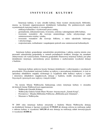 INSTYTUCJE KULTURY Instytucje kultury, w tym: ośrodki kultury, biura wystaw artystycznych, biblioteki, muzea, są formami organizacyjnymi działalności kulturalnej. Do podstawowych zadań wymienionych instytucji należy w szczególności: - edukacja kulturalna i wychowanie przez sztukę, - gromadzenie, dokumentowanie, tworzenie, ochrona i udostępnianie dóbr kultury, - tworzenie warunków dla rozwoju amatorskiego ruchu artystycznego oraz zainteresowania wiedzą i sztuką, - tworzenie warunków dla rozwoju folkloru, a także rękodzieła ludowego i artystycznego, - rozpoznawanie, rozbudzanie i zaspakajanie potrzeb oraz zainteresowań kulturalnych. Instytucja kultury gospodaruje samodzielnie przydzieloną i nabytą częścią mienia oraz prowadzi samodzielną gospodarkę w ramach posiadanych środków, kierując się zasadami efektywności ich wykorzystania. Podstawą gospodarki finansowej instytucji kultury jest plan działalności instytucji, zatwierdzony przez dyrektora z zachowaniem wysokości dotacji z budżetu. Instytucja kultury pokrywa koszty bieżącej działalności i zobowiązania z uzyskanych przychodów. Przychodami instytucji kultury są wpływy z prowadzonej działalności, w tym ze sprzedaży składników majątku ruchomego (z wyjątkiem dóbr kultury) wpływy z najmu i dzierżawy składników majątkowych, dotacje z budżetu, środki otrzymane od osób fizycznych i prawnych oraz wpływy z innych źródeł. Na terenie Miasta Wałbrzycha funkcjonują cztery instytucje kultury w stosunku do których Gmina Wałbrzych jest organizatorem: - Wałbrzyski Ośrodek Kultury, - Wałbrzyska Galeria Sztuki Biuro Wystaw Artystycznych „Zamek Książ”, - Powiatowa i Miejska Biblioteka Publiczna „Biblioteka pod Atlantami”, - Muzeum w Wałbrzychu. W 2005 roku instytucje kultury otrzymały z budżetu Miasta Wałbrzycha dotację na działalność bieżącą w łącznej wysokości 5.729.815 zł, dotację celową na realizację zadań z zakresu kultury w wysokości 169.238 zł oraz dotację na realizację zadań inwestycyjnych w wysokości 45.000 zł. 207 WAŁBRZYSKI OŚRODEK KULTURY D R D R ZIAŁ OZDZ ZIAŁ OZDZ 921 – IAŁ 854 – IAŁ KULTURA I OCHRONA DZIEDZICTWA NARODOWEGO 92109 – DOMY I OŚRODKI KULTURY, ŚWIETLICE I KLUBY EDUKACYJNA OPIEKA WYCHOWAWCZA 85412 – KOLONIE I OBOZY ORAZ INNE FORMY WYPOCZYNKU DZIECI I MŁODZIEŻY SZKOLNEJ, A TAKŻE SZKOLENIA MŁODZIEŻY Wałbrzyski Ośrodek Kultury otrzymał z budżetu Miasta Wałbrzycha w 2005 roku dotację podmiotową w wysokości 1.274.647 zł, co stanowi 100,00 % zaplanowanej kwoty oraz dotację celową w wysokości 77.738 zł, w tym 3.138 zł na zadania w zakresie kultury, które zostały przeznaczone na zorganizowanie Koncertu Piosenki Chrześcijańskiej „Pozytywne Granie”, 50.000 zł z budżetu państwa w ramach Programu Operacyjnego Edukacja kulturalna i upowszechnianie kultury na realizację Programu Obchodów Jubileuszu 50-lecia Zespołu Pieśni i Tańca „Wałbrzych” i 24.600 zł z budżetu państwa na zorganizowanie udziału Zespołu Pieśni i Tańca „Wałbrzych” w międzynarodowych warsztatach artystycznych organizowanych przez Cork International Folk Dance Festival w Irlandii. SPRAWOZDANIE FINANSOWE WAŁBRZYSKIEGO OŚRODKA KULTURY ZA 2005 ROK Lp. Wyszczególnienie 1 I. 1. 2. 3. 4. II. 1. 2 Przychody ogółem Wpływy ze sprzedaży usług Dotacje z budżetu Przychody finansowe Pozostałe przychody Koszty ogółem Wynagrodzenia, w tym: - osobowe - bezosobowe 2. Składki na ubezpieczenia społeczne, Fundusz Pracy i Fundusz Gwarantowanych Świadczeń Pracowniczych 3. Odpisy na Zakładowy Fundusz Świadczeń Socjalny 4. Pozostałe koszty (w tym zużycie materiałów, zakup usług, energia) Plan na 2005 Wykonanie za rok 2005 rok 3 4 1.540.000 1.648.279 380.000 204.692 1.000.000 1.356.247 2.000 1.005 158.000 86.335 1.682.857 1.475.870 936.324 659.212 772.824 482.423 163.500 176.789 157.733 95.720 /w zł/ % 4:3 5 107,03 53,87 135,62 50,25 54,64 87,70 70,40 62,42 108,13 60,68 18.800 15.520 82,55 570.000 705.418 123,76 Na koniec okresu sprawozdawczego kwota wymagalnych należności wyniosła 1.311,06 zł i w całości dotyczyła należności z tytułu dostaw towarów i usług. Natomiast zobowiązania wymagalne wyniosły 148.163,25 zł w tym z tytułu dostaw i usług 40.853 zł. 208 SPRAWOZDANIE Z DZIAŁALNOŚCI MERYTORYCZNEJ WAŁBRZYSKIEGO OŚRODKA KULTURY Wałbrzyski Ośrodek Kultury prowadzi działalność w obiekcie przy ul. Broniewskiego 65a w dzielnicy Piaskowa Góra oraz przy ul. Andersa 185 w dzielnicy Biały Kamień. Do zadań Ośrodka należy w szczególności : integracja społeczności lokalnej poprzez aktywne uczestnictwo w kulturze, prowadzenie stałych zajęć (taneczne, teatralne, plastyczne, muzyczne, szachowe, rekreacyjne) oraz lektoratów, impresariat artystyczny, prowadzenie i koordynacja amatorskiego ruchu artystycznego, popularyzacja i promocja dorobku różnych dziedzin kultury, organizowanie imprez kameralnych i masowych, współpraca z wałbrzyskimi szkołami, wspólnotami samorządowymi, instytucjami kultury, organizacjami społeczno-kulturalnymi, działalność wystawiennicza i wydawnicza, współpraca kulturalna z zagranicą. Wałbrzyski Ośrodek Kultury w ramach swojej działalności realizuje imprezy i przedsięwzięcia programowe, spotkania i prelekcje oraz organizuje zajęcia w kołach, klubach, sekcjach, kursach. W 2005 roku Ośrodek zrealizował łącznie około 134 imprez i przedsięwzięć programowych, spotkań, prelekcji dla ponad 10.240 osób oraz zorganizował zajęcia w 31 kołach, klubach, sekcjach, kursach dla około 870 osób. Były to: Zajęcia stałe W ciągu tygodnia w Ośrodku prowadzone były zajęcia stałe dla około 870 osób, w tym zajęcia taneczne, warsztaty recytatorskie i plastyczne, kursy języków obcych, kluby zainteresowań dla dorosłych oraz otwarte zajęcia rekreacyjne dla dzieci i młodzieży we współpracy ze szkołami oraz Miejskim Ośrodkiem Pomocy S