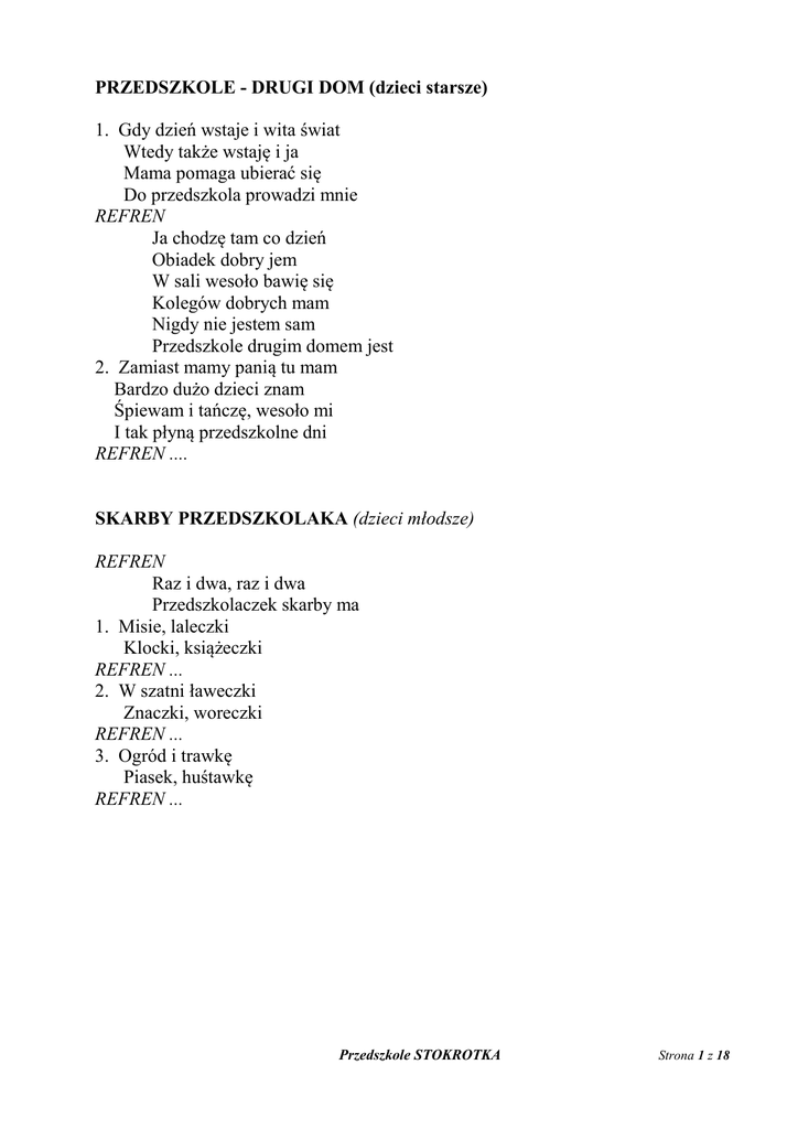 PRZEDSZKOLE - DRUGI DOM (dzieci starsze) 1. Gdy dzień wstaje i wita świat Wtedy także wstaję i ja Mama pomaga ubierać się Do przedszkola prowadzi mnie REFREN Ja chodzę tam co dzień Obiadek dobry jem W sali wesoło bawię się Kolegów dobrych mam Nigdy nie jestem sam Przedszkole drugim domem jest 2. Zamiast mamy panią tu mam Bardzo dużo dzieci znam Śpiewam i tańczę, wesoło mi I tak płyną przedszkolne dni REFREN .... SKARBY PRZEDSZKOLAKA (dzieci młodsze) REFREN Raz i dwa, raz i dwa Przedszkolaczek skarby ma 1. Misie, laleczki Klocki, książeczki REFREN ... 2. W szatni ławeczki Znaczki, woreczki REFREN ... 3. Ogród i trawkę Piasek, huśtawkę REFREN ... Przedszkole STOKROTKA Strona 1 z 18 PUSZYSTY KOT (dzieci starsze) Puszysty kot, łaciaty kot Raz przyjaciela miał - 3x I Bingo on się zwał B-I-N-G-O B-I-N-G-O B-I-N-G-O I Bingo on się zwał Puszysty kot, łaciaty kot Raz przyjaciela miał - 3x I ( np. ) Hania on się zwał H-A-N-I-A H-A-N-I-A H-A-N-I-A I Hania on się zwał Puszysty kot … ŚWIATŁA DROGOWE Do przedszkola co dzień rano Idę przez ulicę z mamą Droga wcale nie jest łatwa Bo na skrzyżowaniu światła Czerwone światło- stój Zielone światło - idź Na żółtym świetle zawsze czekaj Tak już musi być Przedszkole STOKROTKA Strona 2 z 18 ORKIESTRA 1. Mały jeżyk na bębenku gra Ram tam tam- 3x 2. Na grzechotkach grają misie dwa Szu, szu, szu, - 3x 3. Stary zając na talerzach gra Bum ta ra - 3x 4.Młody dzięcioł w drzewo puka tak Stuku, puk - 3x 5. Już orkiestra rytm ten dobrze zna Ram, tam, tam - 3x Zwrotki utworzone przez dzieci z grupy SMERFY 1. Mała krówka na organkach gra hopsa sa, hopsa sa, hopsa sa, 2. Czarny piesek szczeka sobie tak hau, hau, hau 3. Żółta kaczka na gitarze gra kwa, kwa, kwa 4. Mądra sowa na trójkącie gra tra, la, la, Zwrotki utworzone przez dzieci z grupy PSZCZÓŁKI 1. Biały kotek na dzwoneczkach gra -dzyń, dzyń, dzyń 2.Śmieszna małpka na ogonie gra fiku fik, fiku fik, fiku fik 3. Stara krowa na fleciku gra fiu, fiu, fiu Zwrotki utworzone przez dzieci z grupy MOTYLKI 1. Śliczny kotek na bębenku gra bum, bum, bum 2. Piękny motyl na skrzydełkach gra fru, fru, fru 3. Śpiąca sowa na patyczkach gra bach, bach, bach Zwrotki utworzone przez dzieci z grupy BIEDRONKI 1. A biedronka fruwa tu i tam tu i tam, tu i tam, tu i tam 2. Mały zając kica tu i tam tak, tak, tak 3. Szara myszka popiskuje tak pi, pi, pi 4. Chodzi kotek, śpiewa sobie tak miau, miau, miau Przedszkole STOKROTKA Strona 3 z 18 MAŁY MUCHOMOREK (dzieci starsze) 1. Muchomorek mały stoi sobie sam Bardzo zasmucony, zmartwień dużo ma Mówi, że jest brzydki, dużo kropek ma I że go nie zechce żółta kurka ta REFREN Muchomorku, muchomorku Nie martw wcale się My ciebie lubimy Kurka pewnie też 2. Czerwony kapelusz w białe kropki ma Na swej nodze stoi, grzecznie prosi tak Kurko moja miła zechciej dzisiaj mnie Jestem grzyb trujący, lecz tańcować chcę. REFREN ... JESIEŃ 1. Jesienna pogoda, pada deszcz Parasol więc na spacer weź Jesienna pogoda, lata szkoda Które odeszło gdzieś REFREN Kap, kap, kap Deszcz z nieba pada, Kap, kap, kap Szkoda, że nie czekolada 2. Jesienny wicherek liście gna, W prawo i w lewo, raz i dwa Jesienny wicherek ma rowerek Którym objeżdża świat. REFREN ... (Dzieci młodsze) Głowa kiwa się na boki Rączki robią klap, klap, klap nogi tupią tup, tup, tup A ja patrzę w tył i w przód Przedszkole STOKROTKA Strona 4 z 18 WIATR JESIENNY (dzieci starsze) 1. Wiatr jesienny, wiatr już wstał i posprzątać w lesie chciał. Liście pozamiatać wszak musi każdy leśny brat. REFREN My pracuszki, leśne duszki o las dbamy co dzień więc; Do sprzątania, zamiatania mamy zawsze dużą chęć. ( 2 x ) 2. Gdy jesienią pada deszcz, Bardzo ważną rzeczą jest, By osuszyć kałuż sto, aby wszystko dobrze szło. REFREN ... 3. Gdy sarenka zgubi się, Któż pomoże wtedy jej ? No wiadomo – leśny brat, To wiadomo już od lat, że ... REFREN ... KTO TO TAKI ? (dzieci młodsze) Kto to ? Kto to ? Kto to taki ? To wesołe przedszkolaki Ty mnie znasz, ja Cię znam, A na imię mam ….. GDY BRZMI PIOSNKA (dzieci młodsze) - taniec ze śpiewem 1. Gdy brzmi piosnka tańczyć chcę Daj mi obie rączki swe Jedna ta, druga ta Dookoła raz i dwa 2. Gdy brzmi piosnka tańczyć chcę tupnij nogą, poklep mnie Tańczysz ty, tańczę ja Dookoła raz i dwa Przedszkole STOKROTKA Strona 5 z 18 SIEDMIOKROCZEK - zabawa ruchowa ze śpiewem (dzieci starsze) 1. Najpierw siedem kroków w przód Potem siedem kroków w tył Trala la, trala la I już każdy taniec zna. 2. Potem ręce weź pod bok Podskocz siedem razy, hop Hop, hop, hop, hop, hop, hop Jaki łatwy ten podskok. 3. Do kolegi odwróć się Klepnij w rękę albo dwie Hejże ha, hejże ha I już tańczysz tak jak ja. 4. W kole stańmy wszyscy wraz I zatańczmy jeszcze raz Trala la, trala la I zabawa dalej trwa. GRUDZIEŃ JUŻ 1. Grudzień już, już prezentów czas I Mikołaj ukochany będzie pośród nas REFREN. To już czas, to już czas Prezenty przywieź nam My jesteśmy bardzo grzeczni Oceń, proszę sam 2. Grudzień już, już świąteczny czas Pełno puszystego śniegu leży pośród nas REFREN .... DZIADZIO MIKOŁAJ 1. Dziadzio Mikołaj lasem wędruje W okna zagląda i nasłuchuje Gwiazdką w okna świeci Gdzie są grzeczne dzieci 2. O każdym grzecznym dziecku pamięta Stary dziadziunio Mikołaj święty Co za radość będzie Gdy do nas przybędzie Przedszkole STOKROTKA Strona 6 z 18 KOLĘDA (dzieci młodsze) 1. Zielona choineczko pachnąca igiełkami Posłuchaj proszę nas, posłuchaj proszę nas kolędę zaśpiewamy 2. O małym Jezusiku co w żłobie sobie leży Zagramy dzisiaj Ci- 2x Tak jak to się należy 3. O Maryi Panience i o Józefie świętym Zagrają dzisiaj Ci - 2x Wesołe instrumenty 4. O Królach i Herodzie kolędę Ci zagramy A Ty nam zaświecisz -2x Swoimi lampeczkami A MIKOŁAJ PĘDZI (Dzieci starsze) 1. Już na płatkach śniegu przyfrunęły Świ