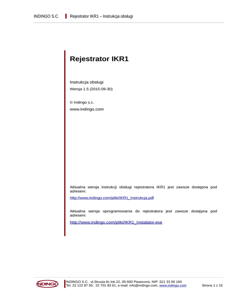 INDINGO S.C. Rejestrator IKR1 – Instrukcja obsługi Rejestrator IKR1 Instrukcja obsługi Wersja 1.5 (2015-09-30) © Indingo s.c. www.indingo.com Aktualna wersja instrukcji obsługi rejestratora IKR1 jest zawsze dostępna pod adresem: http://www.indingo.com/pliki/IKR1_Instrukcja.pdf Aktualna wersja oprogramowania do rejestratora jest zawsze dostępna pod adresem: http://www.indingo.com/pliki/IKR1_Instalator.exe INDINGO S.C. ul.Strusia 6c lok.22, 05-500 Piaseczno, NIP: 521 33 00 160 Tel. 22 122 87 50, 22 701 83 61, e-mail: [email protected], www.indingo.com Strona 1 z 15 INDINGO S.C. Rejestrator IKR1 – Instrukcja obsługi Spis treści 1 Obsługa rejestratora...............................................................................................................................3 1.1 Włączanie rejestratora....................................................................................................................3 1.2 Restart rejestratora.........................................................................................................................3 1.3 Nośniki w komplecie z rejestratorem..............................................................................................3 1.4 Klawiatura ekranowa......................................................................................................................3 1.5 Przestawianie czasu rejestratora...................................................................................................4 2 Praca z rejestratorem.............................................................................................................................5 2.1 Podgląd na żywo............................................................................................................................5 2.2 Linia czasu i odtwarzanie...............................................................................................................6 2.2.1 Kalendarz................................................................................................................................6 2.2.2 Odtwarzanie od konkretnego czasu.......................................................................................6 2.2.3 Menu linii czasu......................................................................................................................7 2.3 Odtwarzanie z wyszukiwaniem......................................................................................................7 2.3.1 Wyszukiwanie ruchu dla jednej kamery.................................................................................7 2.3.2 Wyszukiwanie strefowe..........................................................................................................8 2.4 Menu funkcyjne..............................................................................................................................9 2.5 Układ okien na ekranie.................................................................................................................10 2.5.1 Skróty do widoków................................................................................................................10 2.6 Okno kamery................................................................................................................................11 2.6.1 Menu kamery........................................................................................................................11 3 Archiwizacja..........................................................................................................................................12 3.1 Eksport archiwów na dysk przenośny..........................................................................................13 3.2 Usuwanie archiwów......................................................................................................................13 4 Odtwarzanie archiwów.........................................................................................................................14 4.1 Odtwarzanie archiwów – instalacja programu Ksenos.................................................................14 4.2 Odtwarzanie archiwów.................................................................................................................14 5 Rozwiązywanie problemów..................................................................................................................15 INDINGO S.C. ul.Strusia 6c lok.22, 05-500 Piaseczno, NIP: 521 33 00 160 Tel. 22 122 87 50, 22 701 83 61, e-mail: [email protected], www.indingo.com Strona 2 z 15 INDINGO S.C. Rejestrator IKR1 – Instrukcja obsługi 1 Obsługa rejestratora 1.1 Włączanie rejestratora Jeżeli rejestrator nie uruchomi się samoczynnie po włączeniu zasilania, należy uruchomić go ręcznie, przyciskiem z przodu obudowy. Uruchamianie rejestratora trwa około 1 minuty. 1.2 Restart rejestratora Rejestrator sam wykrywa awarie i w przypadku wystąpienia nieprzewidzianego błędu restartuje system. Rejestrator wykonuje również restarty serwisowe o ustalonych porach, zazwyczaj raz dziennie. Jest to normalne zachowanie i nie wynika z wystąpienia błędów. Gdyby jednak rejestrator nie był w stanie poprawnie pracować, można również ręcznie wykonać restart – wyłączając go na chwilę. Aby wyłączyć rejestrator należy wcisnąć prawy przycisk z przodu obudowy. Po wciśnięciu przycisku rejestrator powinien się wyłączyć w ciągu kilkudziesięciu sekund. UWAGA! NIE NALEŻY trzymać przycisku zasilania wciśniętego dłużej niż sekundę. Po wyłączeniu należy odczekać chwilę, aż zatrzymają się dyski i wentylatory, po czym ponownie włączyć rejestrator (tym samym przyciskiem). 1.3 Nośniki w komplecie z rejestratorem W komplecie z rejestratorem znajduje się płyta CD oraz przenośny dysk USB. Płyta CD zawiera: ● Oprogramowanie rejestratora: program Ksenos do przeglądania kopii zapasowych z rejestratora, oraz zdaln