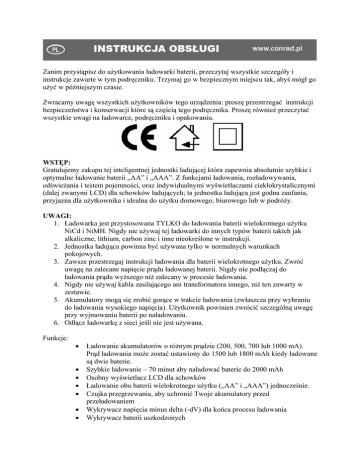 Zanim przystąpisz do użytkowania ładowarki baterii, przeczytaj wszystkie szczegóły i instrukcje zawarte w tym podręczniku. Trzymaj go w bezpiecznym miejscu tak, abyś mógł go użyć w późniejszym czasie. Zwracamy uwagę wszystkich użytkowników tego urządzenia: proszę przestrzegać instrukcji bezpieczeństwa i konserwacji które są częścią tego podręcznika. Proszę również przeczytać wszystkie uwagi na ładowarce, podręczniku i opakowaniu. WSTĘP: Gratulujemy zakupu tej inteligentnej jednostki ładującej która zapewnia absolutnie szybkie i optymalne ładowanie baterii „AA” i „AAA”. Z funkcjami ładowania, rozładowywania, odświeżania i testem pojemności, oraz indywidualnymi wyświetlaczami ciekłokrystalicznymi (dalej zwanymi LCD) dla schowków ładujących; ta jednostka ładująca jest godna zaufania, przyjazna dla użytkownika i idealna do użytku domowego, biurowego lub w podróży. UWAGI: 1. Ładowarka jest przystosowana TYLKO do ładowania baterii wielokrotnego użytku NiCd i NiMH. Nigdy nie używaj tej ładowarki do innych typów baterii takich jak alkaliczne, lithium, carbon zinc i inne nieokreślone w instrukcji. 2. Jednostka ładująca powinna być używana tylko w normalnych warunkach pokojowych. 3. Zawsze przestrzegaj instrukcji ładowania dla baterii wielokrotnego użytku. Zwróć uwagę na zalecane napięcie prądu ładowanej baterii. Nigdy nie podłączaj do ładowania prądu wyższego niż zalecany w procesie ładowania. 4. Nigdy nie używaj kabla zasilającego ani transformatora innego, niż ten zawarty w zestawie. 5. Akumulatory mogą się zrobić gorące w trakcie ładowania (zwłaszcza przy wybraniu do ładowania wysokiego napięcia). Użytkownik powinien zwrócić szczególną uwagę przy wyjmowaniu baterii po naładowaniu. 6. Odłącz ładowarkę z sieci jeśli nie jest używana. Funkcje: • • • • • • • Ładowanie akumulatorów o różnym prądzie (200, 500, 700 lub 1000 mA). Prąd ładowania może zostać ustawiony do 1500 lub 1800 mAh kiedy ładowane są dwie baterie. Szybkie ładowanie – 70 minut aby naładować baterie do 2000 mAh Osobny wyświetlacz LCD dla schowków Ładowanie obu baterii wielokrotnego użytku („AA” i „AAA”) jednocześnie. Czujka przegrzewania, aby uchronić Twoje akumulatory przed przeładowaniem Wykrywacz napięcia minus delta (-dV) dla końca procesu ładowania Wykrywacz baterii uszkodzonych • • • • • Tryb rozładowania (najpierw rozładowuje, później ładuje) aby usunąć problem „zapamiętywania” z baterii wielokrotnego użytku Odświeżanie starych akumulatorów poprzez cykle rozładowywania/ładowania. Funkcja testowa aby sprawdzić pojemność akumulatorów. Funkcje ładowania/ rozładowywania mogą zostać odpalone niezależnie i jednocześnie dla każdej baterii wielokrotnego użytku w schowku. Różne tryby wyświetlania w trakcie ładowania/rozładowywania – prąd ładowania (w mA), czas który upłynął (w gg:mm), napięcie końcowe (w V) oraz zakumulowane pojemności (w mAh lub Ah) Zawartość przesyłki: 1. Jednostka ładująca 2. Transformator 3. Adapter 12V 4. Adapter baterii rozmiaru „C” (4 szt.) i rozmiaru „D” (4 szt.) 5. Pokrowiec 6. 4x akumulator „AA” i 4 x akumulator „AAA” 7. Instrukcja obsługi Klawisze funkcyjne: W ładowarce istnieją trzy proste w obsłudze klawisze funkcyjne i cztery klawisze numeryczne. Numeryczne klawisze schowka: Wciśnij i puść przycisk z numerem aby aktywować funkcje ładowania, lub funkcje wyświetlacza, dla wybranego schowka. Przycisk MODE: Aby aktywować zmianę trybu, musisz najpierw wcisnąć na ok. 1 sekundę przycisk MODE. Konsekwentne naciskanie przycisku MODE przełączać będzie poszczególne tryby: „Charge”, „Discharge”, „Test” i „Refresh”. Aby zmienić tryb działania dla jednego akumulatora, najpierw wciśnij odpowiedni numer (przyciski numeryczne) a następnie przycisk MODE. Przycisk DISPLAY Wciśnij i wypuść aby przełączać między wyświetlaniem prądu ładowania (w mA), czasu który upłynął (w gg:mm), napięcia końcowego (w V) oraz zakumulowaną pojemnością (w mAh lub Ah) w trakcie ładowania, rozładowywania baterii. Aby zmienić tryb wyświetlania dla pojedynczej baterii, najpierw wciśnij odpowiedni klawisz numeryczny a dopiero potem DISPLAY. Przycisk CURRENT Wciśnij aby wybrać ładunek prądu który ma zostać zaaplikowany ( w ciągu pierwszych 8 sekund po włożeniu baterii) w różnych trybach ładowania (zobacz również „Rozpoczęcie ładowania i rozładowywania baterii” poniżej). Przetwornica 12V Użytkownik może również używać ładowarki na 12V używając przetwornicy 12V. 1. Sprawdź i upewnij się że głowa przetwornicy 12V jest kompatybilna z gniazdkiem mocy 12V. 2. Podłącz przetwornice 12V najpierw do ładowarki. 3. Wciśnij końcówkę łączącą transformatora do punktu mocy 12V. Dopóki ładowarka jest zasilana, wyświetlacz pokazywać będzie wersje urządzenia, oraz pełne segmenty. Użytkownik może następnie poruszać się według instrukcji zawartych w „Rozpoczęcie ładowania/ rozładowywania baterii” aby używać ładowarki. TRYBY DZIAŁANIA JEDNOSTKI ŁADUJĄCEJ Ta potężna jednostka ładująca dostarcza następujące tryby działania: a) Ładowanie baterii wielokrotnego użytku (CHARGE) – aby naładować baterie wielokrotnego użytku, automatycznie przełączyć na ładunek cieknący po zakończeniu ładowania. b) Rozładowanie a następnie naładowanie baterii wielokrotnego użytku (DISCHARGE) – aby rozładować baterię i naładować ją ponownie w celu zlikwidowania problemu „zapamiętywania” c) Odświeżanie baterii wielokrotnego użytku (REFRESH) – aby odświeżyć akumulator do jego największej pojemności przez wielokrotne rozładowanie/ naładowanie baterii do momentu kiedy dalszy wzrost pojemności jest nie możliwy. Baterie stare wielokrotnego użytku lub te które nie były używane prze d