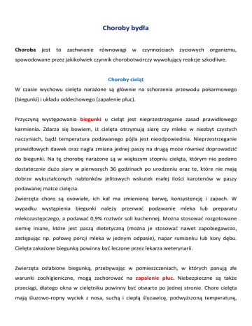 Choroby bydła Choroba jest to zachwianie równowagi w czynnościach życiowych organizmu, spowodowane przez jakikolwiek czynnik chorobotwórczy wywołujący reakcje szkodliwe. Choroby cieląt W czasie wychowu cielęta narażone są głównie na schorzenia przewodu pokarmowego (biegunki) i układu oddechowego (zapalenie płuc). Przyczyną występowania biegunki u cieląt jest nieprzestrzeganie zasad prawidłowego karmienia. Zdarza się bowiem, iż cielęta otrzymują siarę czy mleko w niezbyt czystych naczyniach, bądź temperatura podawanego pójła jest nieodpowiednia. Nieprzestrzeganie prawidłowych dawek oraz nagła zmiana jednej paszy na drugą może również doprowadzić do biegunki. Na tę chorobę narażone są w większym stopniu cielęta, którym nie podano dostatecznie dużo siary w pierwszych 36 godzinach po urodzeniu oraz te, które nie mają dobrze wykształconych nabłonków jelitowych wskutek małej ilości karotenów w paszy podawanej matce cielęcia. Zwierzęta chore są osowiałe, ich kał ma zmienioną barwę, konsystencję i zapach. W wypadku wystąpienia biegunki należy przerwać podawanie mleka lub preparatu mlekozastępczego, a podawać 0,9% roztwór soli kuchennej. Można stosować rozgotowane siemię lniane, które jest paszą dietetyczną (można je stosować nawet zapobiegawczo, zastępując np. połowę porcji mleka w jednym odpasie), napar rumianku lub kory dębu. Cielęta zakażone biegunką powinny być leczone przez lekarza weterynarii. Zwierzęta osłabione biegunką, przebywając w pomieszczeniach, w których panują złe warunki zoohigieniczne, mogą zachorować na zapalenie płuc. Niebezpieczne są także przeciągi, dlatego okna w cielętniku powinny być otwarte po jednej stronie. Chore cielęta mają śluzowo-ropny wyciek z nosa, suchą i ciepłą śluzawicę, podwyższoną temperaturę, przyspieszony oddech oraz kaszel, są smutne, bez apetytu. Zapalenie płuc wywołują wirusy, bądź bakterie. Cielęta chore należy izolować oraz wezwać lekarza weterynarii. Przy zakupie cieląt należy je odizolować, gdyż w wypadku utajonej choroby mogłyby zarazić się wszystkie cielęta. Biegunki i zapalenie płuc są częstą przyczyną padnięć cieląt. Biegunki atakują cielęta najmłodsze, a zapalenie płuc - do 3 tygodnia życia. Aby zmniejszyć śmiertelność cieląt, która może w drastycznych przypadkach wynosić do 10% (w okresie całego wychowu), należy pamiętać o krytycznych momentach w wychowie: okres pierwszych 2 dni, kiedy cielę powinno pobrać dużo siary; okres około 3 tygodni życia, kiedy cielę nabywa tzw. odporności czynnej; transport wpływa stresująco na zwierzęta i przyczynia się do osłabienia odporności organizmu. Zapobieganie chorobom polega na przestrzeganiu wszelkich zasad związanych z żywieniem i utrzymaniem cieląt. Choroby krów mlecznych Istnieje cały szereg chorób, na które zapadają krowy mleczne. Najczęściej występują choroby związane z nieprawidłowym żywieniem, choroby wymion i schorzenia racic (kulawizny - wspomniane przy korekcji racic). Wśród schorzeń niezakaźnych bydła czołową pozycję zajmują choroby układu trawiennego. Przyczynami ich występowania są błędy popełniane przy żywieniu, takie jak: złe przygotowanie pasz, niewłaściwe ułożenie dawki pokarmowej (niezbilansowanie energii, białka czy składników mineralnych), nieodpowiednia technika skarmiania (kolejność, częstotliwość podawanych pasz). Pierwszą odpowiedzią organizmu zwierzęcego na nieodpowiednie żywienie jest zespół zaburzeń zwanych niestrawnością. Główne objawy niestrawności to: osłabiony apetyt, osowiałość, hipotonia (zmniejszenie ruchów żwacza) i przepełnienie żwacza, czasem biegunki, a także nieuzasadniony spadek wydajności, w tym również obniżanie się procentowej zawartości tłuszczu w mleku. Istnieje cały szereg niestrawności określanych jako niestrawności kliniczne, np. kwasica żwacza, zasadowica żwacza, wzdęcia. Kwasica żwacza powstaje wskutek obniżenia się poziomu pH treści żwacza poniżej 4,2. Zwiększenie kwasowości w żwaczu występuje po spożyciu dużej ilości łatwostrawnych węglowodanów (np. przy skarmianiu dużej ilości buraków). Przyczyną kwasicy mogą być również pasze treściwe, które nie były wprowadzane przed wycieleniem i w żwaczu nie zdążyły wykształcić się brodawki. Sprzyjać kwasicy może także skarmianie pasz zbyt rozdrobnionych. W żwaczu następuje wówczas wytworzenie się dużej ilości LKT (lotnych kwasów tłuszczowych) i wzrost kwasu mlekowego. Kwas mlekowy, nie należąc do LKT, nie może „uciec" przez ścianę żwacza, co powoduje drastyczne obniżenie pH oraz zmiany składu mikroflory żwacza. Następuje uszkodzenie nabłonka ścian żwacza, które może rozprzestrzenić się dalej do narządów wewnętrznych. Kwasica żwacza może przejść w kwasicę całego organizmu. Objawami kwasicy są: zaleganie, ślinienie się, wzdęcie żwacza i biegunka. Leczenie kwasicy nie jest proste. Wymaga sondowania treści żwacza i podania natychmiast wiadra wody. Krowy nie mają ochoty na picie, ale mimo to należy w ciągu pierwszych 12 godzin choroby podać około 40-60 litrów wody. Z pierwszą porcją wody wskazane jest podanie antybiotyku w celu zahamowania rozwoju drobnoustrojów. Następnie zaleca się doustny wlew zawiesiny drożdży (6-20 g w odstępach sześciogodzinnych). Drożdże mają właściwości rozkładania kwasu mlekowego. W celach profilaktycznych zaleca się stosowanie kwaśnego węglanu sodu w ilościach 150-200 g/sztukę dziennie. Zasadowica żwacza występuje wskutek podwyższonego pH żwacza. Obserwuje się jej objawy u tych krów, które otrzymują dużo związków azotowych lub które są głodzone (w krótkim okresie czasu), a także przy zmianie dawki i przy stosowaniu pasz zepsutych. Główne objawy tej choroby to: osłabienie apetytu, spadek wydajności mleka i zawartości w nim tłuszcz