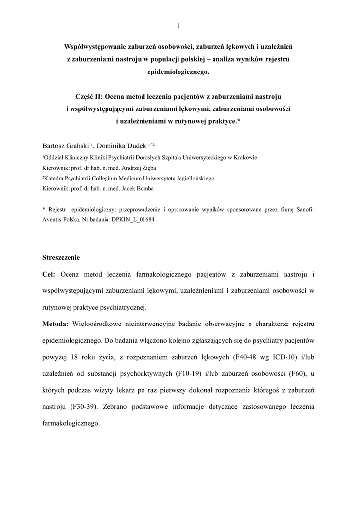 1 Współwystępowanie zaburzeń osobowości, zaburzeń lękowych i uzależnień z zaburzeniami nastroju w populacji polskiej – analiza wyników rejestru epidemiologicznego. Część II: Ocena metod leczenia pacjentów z zaburzeniami nastroju i współwystępującymi zaburzeniami lękowymi, zaburzeniami osobowości i uzależnieniami w rutynowej praktyce.* Bartosz Grabski ¹, Dominika Dudek ¹´² ¹Oddział Kliniczny Kliniki Psychiatrii Dorosłych Szpitala Uniwersyteckiego w Krakowie Kierownik: prof. dr hab. n. med. Andrzej Zięba ²Katedra Psychiatrii Collegium Medicum Uniwersytetu Jagiellońskiego Kierownik: prof. dr hab. n. med. Jacek Bomba * Rejestr epidemiologiczny: przeprowadzenie i opracowanie wyników sponsorowane przez firmę Sanofi- Aventis-Polska. Nr badania: DPKIN_L_01684 Streszczenie Cel: Ocena metod leczenia farmakologicznego pacjentów z zaburzeniami nastroju i współwystępującymi zaburzeniami lękowymi, uzależnieniami i zaburzeniami osobowości w rutynowej praktyce psychiatrycznej. Metoda: Wieloośrodkowe nieinterwencyjne badanie obserwacyjne o charakterze rejestru epidemiologicznego. Do badania włączono kolejno zgłaszających się do psychiatry pacjentów powyżej 18 roku życia, z rozpoznaniem zaburzeń lękowych (F40-48 wg ICD-10) i/lub uzależnień od substancji psychoaktywnych (F10-19) i/lub zaburzeń osobowości (F60), u których podczas wizyty lekarz po raz pierwszy dokonał rozpoznania któregoś z zaburzeń nastroju (F30-39). Zebrano podstawowe informacje dotyczące zastosowanego leczenia farmakologicznego. 2 Wyniki: W grupie 4 558 pacjentów 86% otrzymało leki normotymiczne, 68% leki przeciwdepresyjne a 19% leki przeciwpsychotyczne. 80,21% otrzymywało leki przynajmniej z dwóch różnych grup farmakologicznych. Wnioski: Leki normotymiczne są powszechnie i najczęściej stosowaną grupą środków u pacjentów ze współwystępowaniem zaburzeń nastroju i innych zaburzeń psychicznych. Powszechnym zjawiskiem, choć zrozumiałym ze względu na charakter tej populacji pacjentów, ale wymagającym należytej uwagi, jest polipragmazja. Metody farmakoterapii stosowanej w rutynowej praktyce przez polskich psychiatrów w tej grupie chorych nie odbiegają od ogólnych zasad leczenia pacjentów z zaburzeniami nastroju. Słowa kluczowe: współwystępowanie zaburzeń psychicznych, zaburzenia nastroju, farmakoterapia Summary Aim: Assessment of pharmacological treatment of patients with mood disorders and comorbid anxiety disorders, substance dependences and personality disorders in routine psychiatric practice. Method: Multicentre non-interventional epidemiologic registry study. Consecutive outpatients over 18 years, with the ICD-10 diagnoses of anxiety disorders (F40-48) and/or substance dependences (F10-19) and/or personality disorders (F60) and one of the newly diagnosed mood disorder (F30-F39) were included in the study by treating psychiatrists. Basic data on pharmacological treatment prescribed at the study visit was collected. Results: In the group of 4 558 patients 86% received mood stabilizers, 68% antidepressants, and 19% antipsychotics. 80,21% received agents belonging to at least two different pharmacological groups. 3 Conclusion: Mood stabilizers are a commonly and most often used group of medications in patients with comorbid mood and other psychiatric disorders. Application of drugs belonging to several different group is common, which be justified by the characteristics of the studied population, but requires some more attention. The methods of pharmacotherapy used in routine practice by Polish psychiatrists in this group of patients are consistent with existing standards of treating mood disorders. Key words: comorbidity, mood disorders, pharmacotherapy Wstęp Współwystępowanie zaburzeń psychicznych (comorbidity) definiowane jest najczęściej jako obecność więcej niż jednego zaburzenia u danej osoby w ciągu całego życia albo w określonym okresie czasu [1, 2]. Wyniki badań epidemiologicznych i klinicznych pokazują, iż jest to częste zjawisko, a w przypadku takich zaburzeń jak choroba afektywna dwubiegunowa jest raczej regułą niż wyjątkiem. Wiadomo ponadto, że osoby z „podwójną diagnozą” stanowią grupę, u których zaburzenia mają bardziej uciążliwy przebieg i większą oporność na leczenie [3, 4]. Nie dysponujemy jednak ustalonymi algorytmami postępowania w takich sytuacjach klinicznych, a postępowanie opiera się w dużym stopniu na doświadczeniu klinicznym lekarzy i zindywidualizowanej konceptualizacji przypadku. W tym kontekście poznanie zwyczajów terapeutycznych psychiatrów leczących pacjentów ze współwystępowaniem zaburzeń psychicznych może stanowić pomoc w pracy z tą grupą chorych. Materiał i metoda Badanie zostało przeprowadzone jako wieloośrodkowe nieinterwencyjne badanie obserwacyjne o charakterze rejestru epidemiologicznego. Do badania zostali włączeni kolejno 4 zgłaszający się do psychiatry pacjenci powyżej 18 roku życia, z rozpoznaniem zaburzeń lękowych (F40-F48 wg ICD-10) i/lub uzależnień od substancji psychoaktywnych (F10-F19) i/lub zaburzeń osobowości (F60), u których podczas wizyty lekarz po raz pierwszy dokonał rozpoznania któregoś z zaburzeń nastroju (F30-F39). Każdy lekarz miał za zadanie wypełnić podczas wizyty Kartę Obserwacji Pacjenta (aneks 1), zawierającą informację na temat wieku i płci chorego, rozpoznań zgodnych z kryteriami ICD-10, łącznie z danymi o czasie trwania zaburzeń i liczbie hospitalizacji z ich powodu. Karta Obserwacji Pacjenta zawierała także pytania na temat zaleconego podczas wizyty badawczej leczenia farmakologicznego z uwzględnieniem leków: przeciwlękowych, przeciwdepresyjnych, przeciwpsychotycznych, normotymicznych i „innych”. W badaniu wzięło udział 266 lekarzy w trakcie specjalizacji z psychiatrii lub będących psychiatrami z ośrodków psychiatrycznych z terenu całej Polski. Badający lekarze przyjęli