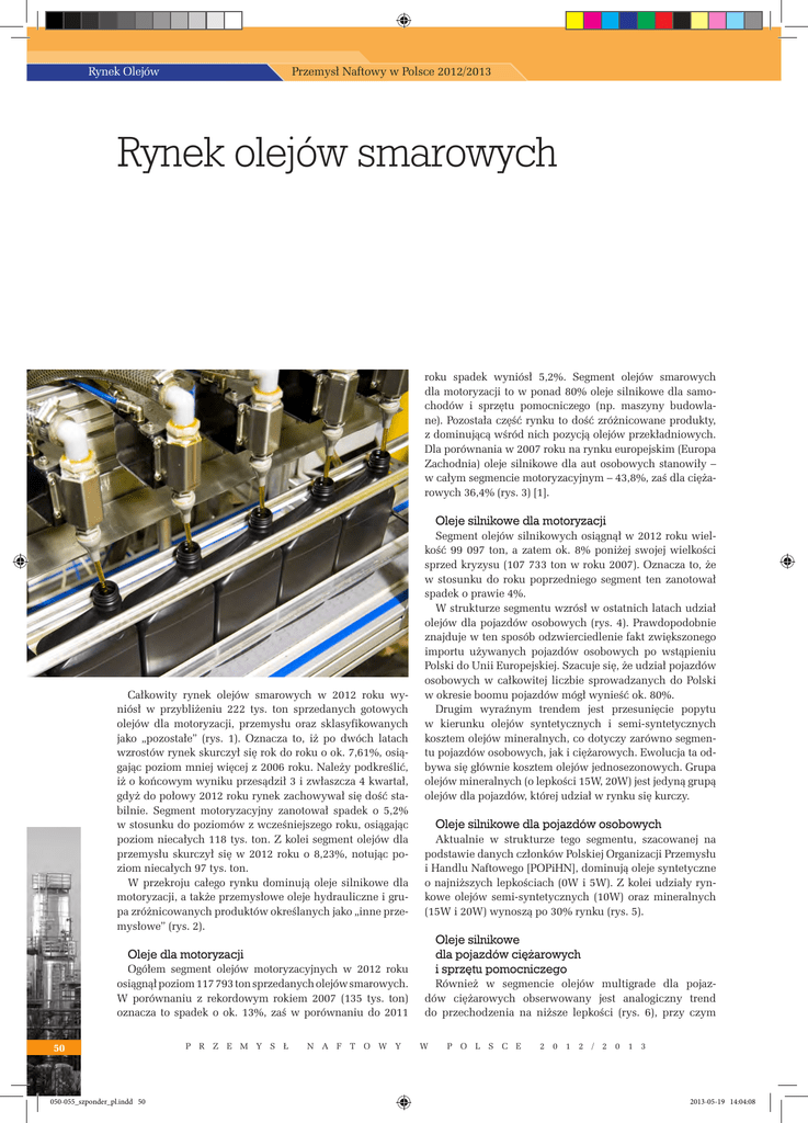 Przemysł Naftowy w Polsce 2012/2013 Rynek Olejów Rynek olejów smarowych roku spadek wyniósł 5,2%. Segment olejów smarowych dla motoryzacji to w ponad 80% oleje silnikowe dla samochodów i sprzętu pomocniczego (np. maszyny budowlane). Pozostała część rynku to dość zróżnicowane produkty, z dominującą wśród nich pozycją olejów przekładniowych. Dla porównania w 2007 roku na rynku europejskim (Europa Zachodnia) oleje silnikowe dla aut osobowych stanowiły – w całym segmencie motoryzacyjnym – 43,8%, zaś dla ciężarowych 36,4% (rys. 3) [1]. Całkowity rynek olejów smarowych w 2012 roku wyniósł w przybliżeniu 222 tys. ton sprzedanych gotowych olejów dla motoryzacji, przemysłu oraz sklasyfikowanych jako „pozostałe” (rys. 1). Oznacza to, iż po dwóch latach wzrostów rynek skurczył się rok do roku o ok. 7,61%, osiągając poziom mniej więcej z 2006 roku. Należy podkreślić, iż o końcowym wyniku przesądził 3 i zwłaszcza 4 kwartał, gdyż do połowy 2012 roku rynek zachowywał się dość stabilnie. Segment motoryzacyjny zanotował spadek o 5,2% w stosunku do poziomów z wcześniejszego roku, osiągając poziom niecałych 118 tys. ton. Z kolei segment olejów dla przemysłu skurczył się w 2012 roku o 8,23%, notując poziom niecałych 97 tys. ton. W przekroju całego rynku dominują oleje silnikowe dla motoryzacji, a także przemysłowe oleje hydrauliczne i grupa zróżnicowanych produktów określanych jako „inne przemysłowe” (rys. 2). Oleje dla motoryzacji Ogółem segment olejów motoryzacyjnych w 2012 roku osiągnął poziom 117 793 ton sprzedanych olejów smarowych. W porównaniu z rekordowym rokiem 2007 (135 tys. ton) oznacza to spadek o ok. 13%, zaś w porównaniu do 2011 50 050-055_szponder_pl.indd 50 P R Z E M Y S Ł N A F T O W Y Oleje silnikowe dla motoryzacji Segment olejów silnikowych osiągnął w 2012 roku wielkość 99 097 ton, a zatem ok. 8% poniżej swojej wielkości sprzed kryzysu (107 733 ton w roku 2007). Oznacza to, że w stosunku do roku poprzedniego segment ten zanotował spadek o prawie 4%. W strukturze segmentu wzrósł w ostatnich latach udział olejów dla pojazdów osobowych (rys. 4). Prawdopodobnie znajduje w ten sposób odzwierciedlenie fakt zwiększonego importu używanych pojazdów osobowych po wstąpieniu Polski do Unii Europejskiej. Szacuje się, że udział pojazdów osobowych w całkowitej liczbie sprowadzanych do Polski w okresie boomu pojazdów mógł wynieść ok. 80%. Drugim wyraźnym trendem jest przesunięcie popytu w kierunku olejów syntetycznych i semi-syntetycznych kosztem olejów mineralnych, co dotyczy zarówno segmentu pojazdów osobowych, jak i ciężarowych. Ewolucja ta odbywa się głównie kosztem olejów jednosezonowych. Grupa olejów mineralnych (o lepkości 15W, 20W) jest jedyną grupą olejów dla pojazdów, której udział w rynku się kurczy. Oleje silnikowe dla pojazdów osobowych Aktualnie w strukturze tego segmentu, szacowanej na podstawie danych członków Polskiej Organizacji Przemysłu i Handlu Naftowego [POPiHN], dominują oleje syntetyczne o najniższych lepkościach (0W i 5W). Z kolei udziały rynkowe olejów semi-syntetycznych (10W) oraz mineralnych (15W i 20W) wynoszą po 30% rynku (rys. 5). Oleje silnikowe dla pojazdów ciężarowych i sprzętu pomocniczego Również w segmencie olejów multigrade dla pojazdów ciężarowych obserwowany jest analogiczny trend do przechodzenia na niższe lepkości (rys. 6), przy czym W P O L S C E 2 0 1 2 / 2 0 1 3 2013-05-19 14:04:08