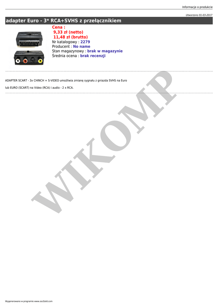 Informacje o produkcie Utworzono 01-03-2017 adapter Euro - 3* RCA+SVHS z przełącznikiem Cena : 9,33 zł (netto) 11,48 zł (brutto) Nr katalogowy : 2279 Producent : No name Stan magazynowy : brak w magazynie Średnia ocena : brak recenzji ADAPTER SCART - 3x CHINCH + S-VIDEO umożliwia zmianę sygnału z gniazda SVHS na Euro W IK O M P lub EURO (SCART) na Video (RCA) i audio - 2 x RCA. Wygenerowano w programie www.oscGold.com