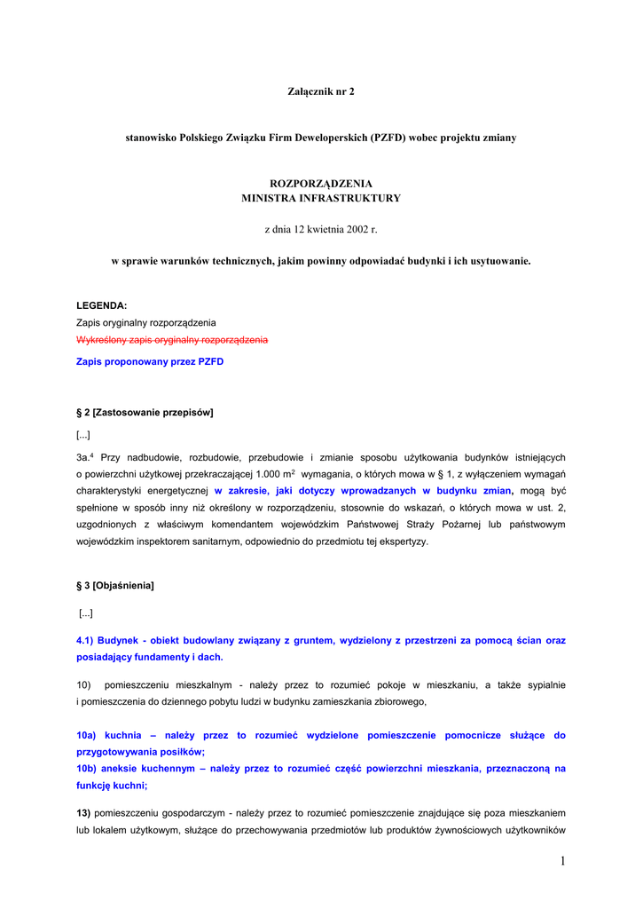 Załącznik nr 2 stanowisko Polskiego Związku Firm Deweloperskich (PZFD) wobec projektu zmiany ROZPORZĄDZENIA MINISTRA INFRASTRUKTURY z dnia 12 kwietnia 2002 r. w sprawie warunków technicznych, jakim powinny odpowiadać budynki i ich usytuowanie. LEGENDA: Zapis oryginalny rozporządzenia Wykreślony zapis oryginalny rozporządzenia Zapis proponowany przez PZFD § 2 [Zastosowanie przepisów] [...] 3a.4 Przy nadbudowie, rozbudowie, przebudowie i zmianie sposobu użytkowania budynków istniejących o powierzchni użytkowej przekraczającej 1.000 m2 wymagania, o których mowa w § 1, z wyłączeniem wymagań charakterystyki energetycznej w zakresie, jaki dotyczy wprowadzanych w budynku zmian, mogą być spełnione w sposób inny niż określony w rozporządzeniu, stosownie do wskazań, o których mowa w ust. 2, uzgodnionych z właściwym komendantem wojewódzkim Państwowej Straży Pożarnej lub państwowym wojewódzkim inspektorem sanitarnym, odpowiednio do przedmiotu tej ekspertyzy. § 3 [Objaśnienia] [...] 4.1) Budynek - obiekt budowlany związany z gruntem, wydzielony z przestrzeni za pomocą ścian oraz posiadający fundamenty i dach. 10) pomieszczeniu mieszkalnym - należy przez to rozumieć pokoje w mieszkaniu, a także sypialnie i pomieszczenia do dziennego pobytu ludzi w budynku zamieszkania zbiorowego, 10a) kuchnia – należy przez to rozumieć wydzielone pomieszczenie pomocnicze służące do przygotowywania posiłków; 10b) aneksie kuchennym – należy przez to rozumieć część powierzchni mieszkania, przeznaczoną na funkcję kuchni; 13) pomieszczeniu gospodarczym - należy przez to rozumieć pomieszczenie znajdujące się poza mieszkaniem lub lokalem użytkowym, służące do przechowywania przedmiotów lub produktów żywnościowych użytkowników 1 budynku, materiałów lub sprzętu związanego z obsługą budynku lub jego otoczenia, a także opału lub odpadów stałych; 16) kondygnacji - należy przez to rozumieć poziomą nadziemną lub podziemną część budynku, zawartą pomiędzy powierzchnią posadzki na stropie lub najwyżej położonej warstwy podłogowej na gruncie a powierzchnią posadzki na stropie bądź warstwy osłaniającej izolację cieplną stropu, znajdującego się nad tą częścią budynku, przy czym za kondygnację uważa się także poddasze z pomieszczeniami przeznaczonymi na pobyt ludzi oraz poziomą część budynku stanowiącą przestrzeń na urządzenia techniczne, mającą średnią wysokość w świetle większą niż 2 m; za kondygnację nie uznaje się nadbudówek ponad dachem, takich jak maszynownia dźwigu, centrala wentylacyjna, klimatyzacyjna, obudowa wyjścia z klatki schodowej lub kotłownia lub inne pomieszczenia techniczne; 22) terenie biologicznie czynnym - należy przez to rozumieć teren z nawierzchnią ziemną lub inną nawierzchnię urządzoną w sposób zapewniający naturalną wegetację i retencję wód opadowych, a także 50% powierzchni tarasów i stropodachów oraz innych powierzchni z taką nawierzchnią zapewniającyą naturalną wegetację, nie mniej jednak niż 10 m2, oraz wodę powierzchniową na tym terenie; 22.1) wskaźnik powierzchni biologicznie czynnej –stosunek łącznej powierzchni wód powierzchniowych oraz terenów przepuszczających wodę i 50% dachów i tarasów pokrytych roślinnością do powierzchni nieruchomości gruntowej. 23) powierzchni wewnętrznej budynku - należy przez to rozumieć sumę powierzchni wszystkich kondygnacji budynku, mierzoną po wewnętrznym obrysie przegród zewnętrznych budynku w poziomie podłogi, bez pomniejszenia o powierzchnię przekroju poziomego konstrukcji i przegród wewnętrznych, jeżeli występują one na tych kondygnacjach, a także z powiększeniem o powierzchnię antresoli; 24) kubaturze brutto budynku - należy przez to rozumieć sumę kubatury brutto wszystkich kondygnacji, stanowiącą iloczyn powierzchni całkowitej, mierzonej po zewnętrznym obrysie przegród zewnętrznych i wysokości kondygnacji brutto, albo między podłogą na stropie lub warstwą wyrównawczą na gruncie a górną powierzchnią podłogi bądź warstwy osłaniającej izolację cieplną stropu nad najwyższą kondygnacją, przy czym do kubatury brutto budynku: a) wlicza się kubaturę przejść, prześwitów i przejazdów bramowych, poddaszy nieużytkowych oraz przekrytych części zewnętrznych budynku, takich jak: loggie, podcienia, ganki, krużganki, werandy, a także kubaturę balkonów i tarasów, obliczaną do wysokości balustrady, b) nie wlicza się kubatury ław i stóp fundamentowych, kanałów i studzienek instalacyjnych, studzienek przy oknach piwnicznych, zewnętrznych schodów, ramp i pochylni, gzymsów, daszków i osłon oraz kominów i attyk ponad płaszczyzną dachu. 25) obszar oddziaływania inwestycji –nieruchomość gruntową, na której projektowana i realizowana jest inwestycja oraz jej otoczenie w granicach, w jakich inwestycja ta prowadzi do ograniczeń w zagospodarowaniu terenów przekraczających ograniczenia spowodowane symetryczną inwestycją u sąsiada 26) wskaźnik intensywności zabudowy – stosunek łącznej powierzchni całkowitej kondygnacji naziemnych, do powierzchni nieruchomości gruntowej; 2 § 12 [Warunki usytuowania] [...] 1) 4 m - w przypadku budynku zwróconego ścianą z otworami okiennymi lub drzwiowymi oknami lub drzwiami balkonowymi w stronę tej granicy; 2) 3 m - w przypadku budynku zwróconego ścianą bez otworów okiennych lub drzwiowych okien lub drzwi balkonowych w stronę tej granicy. 3. Dopuszcza się, uwzględniając przepisy odrębne oraz zawarte w § 13, 60 i 271-273, sytuowanie budynku bezpośrednio przy granicy z sąsiednią działką budowlaną, jeżeli będzie on przylegał całą powierzchnią swojej ściany do ściany budynku istniejącego na sąsiedniej działce lub do ściany budynku projektowanego, dla którego istnieje ostateczna decyzja o pozwoleniu na budowę, pod warunkiem, że jego część leżąca w pasie 
