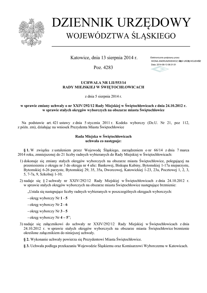 DZIENNIK URZĘDOWY WOJEWÓDZTWA ŚLĄSKIEGO Katowice, dnia 13 sierpnia 2014 r. Elektronicznie podpisany przez: IWONA ANDRUSZKIEWICZ; ŚLĄSKI URZĄD WOJEWÓDZKI Poz. 4283 Data: 2014-08-13 08:31:51 UCHWAŁA NR LII/553/14 RADY MIEJSKIEJ W ŚWIĘTOCHŁOWICACH z dnia 5 sierpnia 2014 r. w sprawie zmiany uchwały o nr XXIV/292/12 Rady Miejskiej w Świętochłowicach z dnia 24.10.2012 r. w sprawie stałych okręgów wyborczych na obszarze miasta Świętochłowice Na podstawie art. 421 ustawy z dnia 5 stycznia 2011 r. Kodeks wyborczy (Dz.U. Nr 21, poz 112, z późn. zm), działając na wniosek Prezydenta Miasta Świętochłowice Rada Miejska w Świętochłowicach uchwala co następuje: § 1. W związku z ustaleniem przez Wojewodę Śląskiego, zarządzeniem o nr 66/14 z dnia 7 marca 2014 roku, zmniejszonej do 21 liczby radnych wybieranych do Rady Miejskiej w Świętochłowicach: 1) dokonuje się zmiany stałych okręgów wyborczych na obszarze miasta Świętochłowice, polegającej na przeniesieniu z okręgu nr 3 do okręgu nr 4 ulic: Bankowej, Biskupa Kubiny, Bytomskiej 1-17a nieparzyste, Bytomskiej 6-26 parzyste, Bytomskiej 29, 35, 35a, Dworcowej, Katowickiej 1-23, 23a, Pocztowej 1, 2, 3, 5, 7-7a, 9, Szkolnej 1-10; 2) nadaje się § 2 uchwały nr XXIV/292/12 Rady Miejskiej w Świętochłowicach z dnia 24.10.2012 r. w sprawie stałych okręgów wyborczych na obszarze miasta Świętochłowice następujące brzmienie: „Ustala się następujące liczby radnych wybieranych w poszczególnych okręgach wyborczych: - okręg wyborczy Nr 1 - 5 - okręg wyborczy Nr 2 - 6 - okręg wyborczy Nr 3 - 5 - okręg wyborczy Nr 4 – 5”; 3) nadaje się załącznikowi do uchwały nr XXIV/292/12 Rady Miejskiej w Świętochłowicach z dnia 24.10.2012 r. w sprawie stałych okręgów wyborczych na obszarze miasta Świętochłowice brzmienie określone załącznikiem do niniejszej uchwały. § 2. Wykonanie uchwały powierza się Prezydentowi Miasta Świętochłowice. § 3. Uchwała podlega przekazaniu Wojewodzie Śląskiemu oraz Komisarzowi Wyborczemu w Katowicach. Dziennik Urzędowy Województwa Śląskiego –2– Poz. 4283 § 4. Uchwała wchodzi w życie z dniem podjęcia i podlega ogłoszeniu w Dzienniku Urzędowym Województwa Śląskiego oraz podaniu do publicznej wiadomości poprzez wywieszenie na tablicy ogłoszeń oraz zamieszczeniu w Biuletynie Informacji Publicznej Urzędu Miejskiego w Świętochłowicach. Przewodniczący Rady Miejskiej w Świętochłowicach Bożena Wojciechowska-Zbylut Dziennik Urzędowy Województwa Śląskiego –3– Poz. 4283 Załącznik do Uchwały Nr LII/553/14 Rady Miejskiej w Świętochłowicach z dnia 5 sierpnia 2014 r. Numer okręgu 1 2 3 4 Granice okręgu Ulice: Armii Ludowej, Astrów, Beskidzka, Bohaterów Westerplatte, Buczka, Czajora, Figuły, Gołęszyców, Górna, Jaśminowa, Jodłowa, Jordanowska, Kamionki, Karpacka, Kopernika, Kościelna, Lampego, Lazara, Łagiewnicka, Piękna, Plac Zawadzkiego, Przybyły, Sosnowa, Sportowa, Stawowa, Szczytowa, Sztygarska, Ślęzan, Średnia, Świętokrzyska, Węglowa, Wiechaczka, Wiślan, Wolności, Wróblewskiego Ulice: Barlickiego, Boczna, Bolesława Chrobrego, Bytomska od 55 do 69, Chorzowska, Doktora Bukowego, Dylonga, Graniczna 1-17, Imieli, Korfantego, Krasickiego, Krótka, Mickiewicza, Moniuszki, Nowotki, Okrzei, Oświęcimska, Pieczki, Plac Słowiański, Podhalańska, Powstańców Śląskich, Sawickiej, Sądowa, Świdra, Świerczyny, Świętego Jana, Tatrzańska, Uroczysko, Wallisa, Wieczorka, Wiosenna, Zubrzyckiego, Żelazna Ulice: Bytomska 23a, b, c, Cmentarna, Findera, Granitowa, Katowicka 25-78a, Licealna, Matejki, Matki Polki, Nastolatków, Ogrodowa, Plac Księdza Raabe, Pocztowa 4-8 parzyste oraz 11-29, Polaka, Polna, Rzeczna, Solidarności, Strzelców Bytomskich, Szkolna 11-29, Szpitalna, Świerczewskiego, Wodna, Wyzwolenia, Żołnierska Ulice: 1 Maja, Akacjowa, Bankowa, Biskupa Kubiny, Brzozowa, Bukowa, Bytomska 1- 17A nieparzyste, Bytomska 6-26 parzyste, Bytomska 29, 35, 35A, Chopina, Cicha, Dębowa, Drzymały, Dworcowa, Fornalskiej, Góra Hugona, Górnicza, Graniczna 45, Grunwaldzka, Hajduki, Hibnera, Hutnicza, Jaworowa, Jesionowa, Kaliny, Kardynała Wyszyńskiego, Kasprzaka, Kasztanowa, Katowicka 1-23, 23A, Klonowa, Komandra, Kościuszki, Krzywa, Liebknechta, Ligonia, Lipowa, Mańczyka, Marianny i Jana Krzyżyńskich, Metalowców, Miarki, Miczurina, Morcinka, Niedurnego, Nowa, Piastowska, Piechaczka, Plebiscytowa, Pocztowa 1, 2, 3, 5, 7-7A, 9, Pokoju, Powstańców Warszawy, Reja, Sienkiewicza, Sikorskiego, Szkolna 1-10, Śląska, Topolowa, Wierzbowa, Wojska Polskiego, Zielona Liczba wybieranych radnych 5 6 5 5