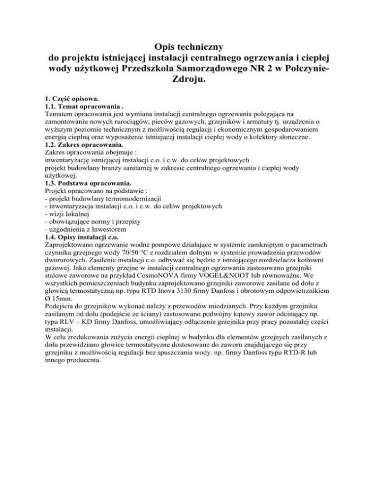 Opis techniczny do projektu istniejącej instalacji centralnego ogrzewania i ciepłej wody użytkowej Przedszkola Samorządowego NR 2 w PołczynieZdroju. 1. Część opisowa. 1.1. Temat opracowania . Tematem opracowania jest wymiana instalacji centralnego ogrzewania polegająca na zamontowaniu nowych rurociągów; pieców gazowych, grzejników i armatury tj. urządzenia o wyższym poziomie technicznym z możliwością regulacji i ekonomicznym gospodarowaniem energią cieplną oraz wyposażenie istniejącej instalacji ciepłej wody o kolektory słoneczne. 1.2. Zakres opracowania. Zakres opracowania obejmuje : inwentaryzację istniejącej instalacji c.o. i c.w. do celów projektowych projekt budowlany branży sanitarnej w zakresie centralnego ogrzewania i ciepłej wody użytkowej. 1.3. Podstawa opracowania. Projekt opracowano na podstawie : - projekt budowlany termomodernizacji - inwentaryzacja instalacji c.o. i c.w. do celów projektowych - wizji lokalnej - obowiązujące normy i przepisy - uzgodnienia z Inwestorem 1.4. Opisy instalacji c.o. Zaprojektowano ogrzewanie wodne pompowe działające w systemie zamkniętym o parametrach czynnika grzejnego wody 70/50 °C z rozdziałem dolnym w systemie prowadzenia przewodów dwururowych. Zasilenie instalacji c.o. odbywać się będzie z istniejącego rozdzielacza kotłowni gazowej. Jako elementy grzejne w instalacji centralnego ogrzewania zastosowano grzejniki stalowe zaworowe na przykład CosmoNOVA firmy VOGEL&NOOT lub równoważne. We wszystkich pomieszczeniach budynku zaprojektowano grzejniki zaworowe zasilane od dołu z głowicą termostatyczną np. typu RTD Inova 3130 firmy Danfoss i obrotowym odpowietrznikiem Ø 15mm. Podejścia do grzejników wykonać należy z przewodów miedzianych. Przy każdym grzejniku zasilanym od dołu (podejście ze ściany) zastosowano podwójny kątowy zawór odcinający np. typu RLV – KD firmy Danfoss, umożliwiający odłączenie grzejnika przy pracy pozostałej części instalacji. W celu zredukowania zużycia energii cieplnej w budynku dla elementów grzejnych zasilanych z dołu przewidziano głowice termostatyczne dostosowane do zaworu znajdującego się przy grzejniku z możliwością regulacji bez spuszczania wody. np. firmy Danfoss typu RTD-R lub innego producenta. Ze względu na niezdławiony nadmiar ciśnienia w obiegach należy zastosować na podejściu do każdego odgałęzienia w kotłowni regulator różnicy ciśnienia. Na przewodzie zasilającym należy zamontować zawory odcinające z płynną nastawą wstępną np. typu ASV-M dające możliwość podłączenia rurki impulsowej dającej sygnał ciśnienia dla regulatora różnicy ciśnienia ASV-P. Regulatory różnicy ciśnienia typu ASV-P utrzymujące stałą różnicę ciśnienia z możliwością pomiaru przepływu, napełniania i opróżniania instalacji należy zamontować na przewodzie powrotnym obok zaworu odcinającego ASV-M. Dopuszcza się zastosowanie innej firmy np. Samson o równoważnych parametrach technicznych. W celu prawidłowego odpowietrzenia instalacji każdy grzejnik zaopatrzony jest w obrotowy zawór odpowietrzający o średnicy 15mm oraz dodatkowo przy najdalej położonych grzejnikach umieszczono automatyczny kątowy zawór odpowietrzający. Odwodnienie całej instalacji c.o. odbywać się będzie poprzez zawór z kurkiem spustowym o średnicy 15mm umieszczony w najniższym punkcie instalacji tj. w pomieszczeniu kotłowni. Przewody pionowe i poziome oraz podejścia do grzejników instalacji centralnego ogrzewania zaprojektowano z rur miedzianych stosowanych w ciepłownictwie. Poziome przewody rozprowadzające należy prowadzić jak pokazano w części graficznej ze spadkiem 3‰ w kierunku odwodnienia (rozdzielacza c.o.). Mocowanie przewodów poziomych i pionowych do konstrukcji budowlanych wykonać za pomocą obejm metalowych z wkładką gumową rozróżniając mocowanie z punktami (podporami) stałymi i przesuwnymi. Natomiast przewody układane w bruzdach należy zaizolować otulinami z pianki polietylenowej grubości 9 mm np. Thermaflex Thermcompact S. W pomieszczeniu kotłowni zastosować rurociągi stalowe instalacyjne stosowane w ciepłownictwie. Rurociągi zaizolować zgodnie z opisem w projekcie. Grubość izolacji 25-30mm zabezpieczona płaszczem PVC. Izolację na dachu zabezpieczyć dodatkowo płaszczem z blachy ocynkowanej. Badania i próby szczelności Instalację centralnego ogrzewania należy poddać badaniom na szczelność. Wszystkie rury przed zakryciem i zaizolowaniem należy poddać próbie ciśnieniowej. Przy próbie ciśnieniowej instalacji z przewodami miedzianymi należy utrzymywać niezmienną temperaturę czynnika próbnego. Próbę ciśnieniową należy przeprowadzić jako próbę wstępną, główną i końcową. Przy próbie wstępnej należy zastosować ciśnienie próbne odpowiadające 1,5 krotnej wartości najwyższego możliwego ciśnienia roboczego, lecz nie mniej niż 0,9 MPa. Ciśnienie to musi w okresie 1 godziny. Po próbie wstępnej należy przeprowadzić próbę główną. Czas trwania próby głównej wynosi 2 godziny i ciśnieniu 0,6 MPa. Pomiędzy próbami instalacja powinna być pozostawiona w stanie bezciśnieniowym. Do pomiaru ciśnienia w trakcie próby należy używać manometru z podziałką skali, co 0,1 bar. Manometr należy umieścić w najniższym punkcie instalacji. Po wykonaniu próby ciśnieniowej w żadnym miejscu instalacji nie może wystąpić nieszczelność. Dla instalacji wykonanych w systemie rur miedzianych płukanie instalacji należy przeprowadzić przy użyciu wody. Regulacja instalacji centralnego ogrzewania odbywać się będzie poprzez nastawy zaworów w korpusie zaworów termostatycznych podczas próby na gorąco. 1.4. Opisy instalacji ciepłej wody i technologiczna solarna z kotłownią. W pomieszczeniu kotłowni gazowej istnieje instalacja wodociągowa wody zimnej i ciepłej oraz technologiczna grzewcza. W kotłowni rurociągi należy prowadzić na śc