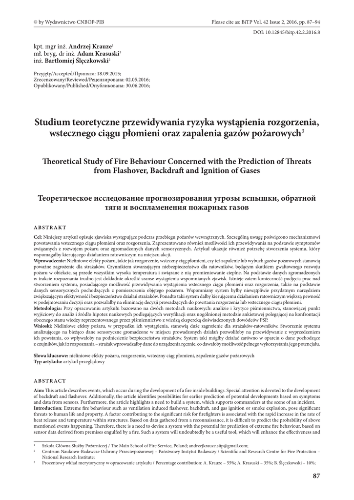 © by Wydawnictwo CNBOP-PIB Please cite as: BiTP Vol. 42 Issue 2, 2016, pp. 87–94 DOI: 10.12845/bitp.42.2.2016.8 kpt. mgr inż. Andrzej Krauze1 mł. bryg. dr inż. Adam Krasuski1 inż. Bartłomiej Ślęczkowski2 Przyjęty/Accepted/Принята: 18.09.2015; Zrecenzowany/Reviewed/Рецензирована: 02.05.2016; Opublikowany/Published/Опубликована: 30.06.2016; Studium teoretyczne przewidywania ryzyka wystąpienia rozgorzenia, wstecznego ciągu płomieni oraz zapalenia gazów pożarowych3 Theoretical Study of Fire Behaviour Concerned with the Prediction of Threats from Flashover, Backdraft and Ignition of Gases Теоретическое исследование прогнозирования угрозы вспышки, обратной тяги и воспламенения пожарных газов ABSTRAKT Cel: Niniejszy artykuł opisuje zjawiska występujące podczas przebiegu pożarów wewnętrznych. Szczególną uwagę poświęcono mechanizmowi powstawania wstecznego ciągu płomieni oraz rozgorzenia. Zaprezentowano również możliwości ich przewidywania na podstawie symptomów związanych z rozwojem pożaru oraz zgromadzonych danych sensorycznych. Artykuł ukazuje również potrzebę stworzenia systemu, który wspomagałby kierującego działaniem ratowniczym na miejscu akcji. Wprowadzenie: Nieliniowe efekty pożaru, takie jak rozgorzenie, wsteczny ciąg płomieni, czy też zapalenie lub wybuch gazów pożarowych stanowią poważne zagrożenie dla strażaków. Czynnikiem stwarzającym niebezpieczeństwo dla ratowników, będącym skutkiem gwałtownego rozwoju pożaru w obiekcie, są przede wszystkim wysoka temperatura i związane z nią promieniowanie cieplne. Na podstawie danych zgromadzonych w trakcie rozpoznania trudno jest dokładnie określić szanse wystąpienia wspomnianych zjawisk. Istnieje zatem konieczność podjęcia prac nad stworzeniem systemu, posiadającego możliwość przewidywania wystąpienia wstecznego ciągu płomieni oraz rozgorzenia, także na podstawie danych sensorycznych pochodzących z pomieszczenia objętego pożarem. Wspomniany system byłby niewątpliwie przydatnym narzędziem zwiększającym efektywność i bezpieczeństwo działań strażaków. Ponadto taki system dałby kierującemu działaniem ratowniczym większą pewność w podejmowaniu decyzji oraz pozwalałby na eliminację decyzji prowadzących do powstania rozgorzenia lub wstecznego ciągu płomieni. Metodologia: Przy opracowaniu artykułu bazowano na dwóch metodach naukowych: analizie i krytyce piśmiennictwa, stanowiącej punkt wyjściowy do analiz i źródło hipotez naukowych podlegających weryfikacji oraz uogólnionej metodzie ankietowej polegającej na konfrontacji obecnego stanu wiedzy reprezentowanego przez piśmiennictwo z wiedzą ekspercką doświadczonych dowódców PSP. Wnioski: Nieliniowe efekty pożaru, w przypadku ich wystąpienia, stanowią duże zagrożenie dla strażaków-ratowników. Stworzenie systemu analizującego na bieżąco dane sensoryczne gromadzone w miejscu prowadzonych działań pozwoliłoby na przewidywanie z wyprzedzeniem ich powstania, co wpływałoby na podniesienie bezpieczeństwa strażaków. System taki mógłby działać zarówno w oparciu o dane pochodzące z czujników, jak i z rozpoznania – strażak wprowadzałby dane do urządzenia ręcznie, co dawałoby możliwość pełnego wykorzystania jego potencjału. Słowa kluczowe: nieliniowe efekty pożaru, rozgorzenie, wsteczny ciąg płomieni, zapalenie gazów pożarowych Typ artykułu: artykuł przeglądowy A B S T R AC T Aim: This article describes events, which occur during the development of a fire inside buildings. Special attention is devoted to the development of backdraft and flashover. Additionally, the article identifies possibilities for earlier prediction of potential developments based on symptoms and data from sensors. Furthermore, the article highlights a need to build a system, which supports commanders at the scene of an incident. Introduction: Extreme fire behaviour such as ventilation induced flashover, backdraft, and gas ignition or smoke explosion, pose significant threats to human life and property. A factor contributing to the significant risk for firefighters is associated with the rapid increase in the rate of heat release and temperature within structures. Based on data gathered from a reconnaissance, it is difficult to predict the probability of above mentioned events happening. Therefore, there is a need to devise a system with the potential for prediction of extreme fire behaviour, based on sensor data derived from premises engulfed by a fire. Such a system will undoubtedly be a useful tool, which will enhance the effectiveness and 1 2 3 Szkoła Główna Służby Pożarniczej / The Main School of Fire Service, Poland; [email protected]; Centrum Naukowo-Badawcze Ochrony Przeciwpożarowej – Państwowy Instytut Badawczy / Scientific and Research Centre for Fire Protection – National Research Institute; Procentowy wkład merytoryczny w opracowanie artykułu / Percentage contribution: A. Krauze – 55%; A. Krasuski – 35%; B. Ślęczkowski – 10%; 87 BADANIA I ROZWÓJ BiTP Vol. 42 Issue 2, 2016, pp. 87–94 DOI:10.12845/bitp.42.2.2016.8 safety of firefighters. Furthermore, such a tool will support incident commanders in decision making and allow for the elimination of decisions, which could lead to development of flashover or backdraft. Methodology: The study utilised two scientific approaches: review and critical analysis of literature, which provided an exit point and source of verifiable scientific hypotheses. This was enhanced by survey methods based on a contrast of current knowledge identified in literature with practical know how of experienced commanders from the Polish State Fire Service. Conclusions: Non-linear progression and unpredictable fire behaviour, when it occurs, creates significant dangers to firefighters. Development of a sys