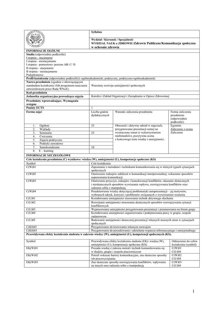 Syllabus Wydział / Kierunek / Specjalność WYDZIAŁ NAUK o ZDROWIU/Zdrowie Publiczne/Komunikacja społeczna w ochronie zdrowia INFORMACJE OGÓLNE Studia (odpowiednie podkreślić) I stopnia - stacjonarne I stopnia - niestacjonarne I stopnia - pomostowe: poziom AB/ C/ D II stopnia - stacjonarne II stopnia - niestacjonarne Podyplomowe Profil kształcenia (odpowiednie podkreślić): ogólnoakademicki, praktyczny, praktyczno-ogólnoakademicki Nazwa przedmiotu (zgodnie z obowiązującym standardem kształcenia i/lub programem nauczania Warsztaty rozwoju umiejętności społecznych zatwierdzonym przez Radę WNoZ). Kod przedmiotu Katedra i Zakład Organizacji i Zarządzania w Opiece Zdrowotnej Jednostka organizacyjna prowadząca zajęcia Przedmioty wprowadzające. Wymagania wstępne Punkty ECTS Forma zajęć 1. 2. 3. 4. 5. 6. 7. 8. Ogółem Wykłady Seminaria Ćwiczenia Zajęcia praktyczne Praktyki zawodowe Samokształcenie E – learning 1 Liczba godzin dydaktycznych 35 25 Warunki zaliczenia przedmiotu Obecność i aktywny udział w zajęciach, przygotowanie prezentacji ustnej na wyznaczony temat (z wykorzystaniem multimediów), pozytywna ocena z końcowego testu wiedzy i umiejętności. Forma zaliczenia przedmiotu (odpowiednie podkreślić) Egzamin Zaliczenie z oceną Zaliczenie 10 INFORMACJE SZCZEGÓŁOWE Cele kształcenia przedmiotu (C) wynikowe: wiedza (W), umiejętności (U), kompetencje społeczne (KS) Symbol Cele kształcenia C(W)01 Zapoznanie z metodami i technikami komunikowania się w różnych typach sytuacjach społecznych C(W)02 Omówienie rodzajów zakłóceń w komunikacji interpersonalnej; wskazanie sposobów usprawniania komunikacji C(W)03 Omówienie przyczyn, rodzajów i konsekwencji konfliktów; ukazanie skutecznych i nieskutecznych sposobów wywierania wpływu, rozwiązywania konfliktów oraz radzenia sobie z manipulacją C(W)04 Przedstawienie wiedzy dotyczącej problematyki autoprezentacji – jej motywów, wybranych taktyk, korzyści i problemów związanych z wywieraniem wrażenia C(U)01 Kształtowanie umiejętności stosowania technik aktywnego słuchania C(U)02 Rozwijanie umiejętności stosowania skutecznych sposobów rozwiązywania sytuacji konfliktowych C(U)03 Wypracowanie umiejętności przygotowania prezentacji i przemawiania na forum grupy C(U)04 Kształtowanie umiejętności organizowania i podejmowania pracy w grupie, zespole zadaniowym C(U)05 Budowanie umiejętności skutecznej prezentacji własnych mocnych stron w sytuacjach społecznych C(KS)01 Przygotowanie do kierowania własnym rozwojem C(KS)03 Przygotowanie do poszukiwania i udzielania wsparcia informacyjnego i emocjonalnego Przewidywane efekty kształcenia studenta w zakresie wiedzy (W), umiejętności (U), kompetencji społecznych (KS). Symbol EK(W)01 EK(W)02 EK(W)03 Przewidywane efekty kształcenia studenta (EK): wiedza (W), umiejętności (U), kompetencje społeczne (KS). Posiada wiedzę z zakresu metod i technik komunikowania się w diadzie, grupie i zespole pracowniczym Potrafi wskazać bariery komunikacyjne, zna skuteczne sposoby ich przezwyciężania Zna skuteczne sposoby rozwiązywania konfliktów, wpływania na innych oraz radzenia sobie z manipulacją Odniesienie do celów kształcenia (symbol) C(W)01 C(U)04 C(W)02 C(U)04 C(W)03 C(U)04 1 EK(W)04 Ma wiedzę dotyczącą skutecznych sposobów budowania pozytywnego wizerunku własnej osoby EK(U)01 Umie komunikować się w sposób skuteczny w różnych kontekstach społecznych EK(U)02 Potrafi znaleźć skuteczne sposoby rozwiązywania sytuacji trudnych i konfliktowych EK(U)03 Umie przygotować i prowadzić prezentację, jest przygotowany do wystąpień publicznych EK(U)04 Posiada umiejętność współdziałania i organizowania pracy w grupie EK(U)05 Umie zaprezentować własne mocne strony oraz kształtować pozytywne wrażenie w kontaktach interpersonalnych C(W)01 C(W)02 C(W)04 C(U)01 C(U)03 C(U)05 C(W)01 C(W)02 C(W)03 C(U)01 C(U)03 C(W)03 C(U)02 C(U)04 C(W)01 C(W)04 C(U)03 C(W)01 C(W)02 C(W)03 C(U)01 C(U)02 C(U)04 C(W)01 C(W)04 C(U)05 C(KS)01 C(KS)03 Potrafi programować zmiany i wprowadzać je w życie Potrafi poszukiwać i wykorzystywać różne rodzaje wsparcia społecznego; potrafi udzielać wsparcia informacyjnego i emocjonalnego Treści programowe (TP): opis przedmiotu wynikający z obowiązującego standardu kształcenia i/lub programu nauczania zatwierdzonego przez Radę WNoZ Symbol Forma realizacji treści kształcenia: np. wykład, seminaria, Odniesienie do ćwiczenia, zajęcia praktyczne, praktyki zawodowe, efektów kształcenia samokształcenie, E- learning (symbol) TP1 Współpraca w grupie i zespole zadaniowym Seminaria, samokształcenie EK(W)01 EK(W)02 EK(W)03 EK(U)01 EK(U)02 EK(U)04 TP2 Komunikacja interpersonalna Seminaria, samokształcenie EK(W)01 EK(W)02 EK(W)03 EK(W)04 EK(U)01 EK(U)03 EK(U)04 TP3 Rozwiązywanie konfliktów Seminaria, samokształcenie EK(W)03 EK(U)02 EK(U)04 TP4 Autoprezentacja Seminaria, samokształcenie EK(W)04 EK(U)01 EK(U)03 EK(U)05 TP5 Prezentacje w procesie komunikacji Seminaria, samokształcenie EK(W)01 EK(W)02 EK(W)04 EK(U)01 EK(U)03 EK(U)05 TP6 Radzenie sobie z manipulacją Seminaria, samokształcenie EK(W)03 EK(U)02 Metody dydaktyczne (sposób pracy nauczyciela, Wykład, praca zespołowa, ćwiczenia w parach, aktywność własna uczestników, umożliwiający osiągnięcie celów kształcenia) wymiana doświadczeń i spostrzeżeń, dyskusja Prezentacje z wykorzystaniem sprzętu multimedialnego, materiały źródłowe, tablica, Środki dydaktyczne wykorzystywane w pisaki (kreda), indywidualne arkusze ćwiczeń procesie kształcenia Wykaz piśmiennictwa dla studenta 1. Chełpa S., Witkowski T., Psychologia konfliktów, Oficyna Wydawnicza Piśmiennictwo podstawowe do 4 pozycji UNUS, 1999. 2. Król-Fijewska M., Fijewski P., Asertywność menedżera, Polskie Wydawnictwo Ekonomiczne, Warszawa 2000. 3. Leary M., Wywieranie wrażenia na innych. O sztuce autoprezentacji, GWP, EK(KS)01 EK(KS)02 2 Piśmiennict