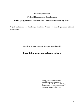 Uniwersytet Łódzki Wydział Ekonomiczno-Socjologiczny Studia podyplomowe „Mechanizmy Funkcjonowania Strefy Euro” Projekt realizowany z Narodowym Bankiem Polskim w ramach programu edukacji ekonomicznej Monika Wierzbowska, Kacper Landowski Euro jako waluta międzynarodowa Praca dyplomowa napisana pod kierunkiem naukowym prof. zw. dr hab. Janusza Bilskiego w Katedrze Międzynarodowych Stosunków Gospodarczych 1 Łódź 2016 Spis treści Wstęp .......................................................................................................................................... 3 1 Rozdział Pojęcie i funkcje pieniądza międzynarodowego ................................................... 4 1.1. Pojęcie pieniądza ......................................................................................................... 4 1.2. Funkcje pieniądza ........................................................................................................ 5 1.1.1 Miernik wartości .................................................................................................. 5 1.1.2 Środek wymiany ................................................................................................... 5 1.1.3 Środek tezauryzacji .............................................................................................. 6 1.3. Rodzaje pieniądza ........................................................................................................ 6 1.1.4 Pieniądz kruszcowy .............................................................................................. 6 1.1.5 Pieniądz papierowy .............................................................................................. 7 1.1.6 Pieniądz bezgotówkowy ....................................................................................... 8 1.1.7 Pieniądz elektroniczny ......................................................................................... 8 Podsumowanie ........................................................................................................................... 9 2. Rozdział Integracja monetarna ........................................................................................... 10 2.1 System waluty złotej ...................................................................................................... 10 2.2 System walutowy okresu międzywojennego ............................................................. 12 2.3 System dewizowo-złoty ............................................................................................ 12 2.4 System wielodewizowy ............................................................................................. 14 Podsumowanie ......................................................................................................................... 16 3. Rozdział Funkcje i znaczenie Euro w gospodarce światowej ............................................ 17 3.1. Warunki kreacji pieniądza międzynarodowego ........................................................ 17 3.2. Wykorzystanie euro jako waluty międzynarodowej ................................................. 21 3.3. Pozycja euro na międzynarodowym rynku ............................................................... 22 3.4. Realizacja funkcji pieniądza międzynarodowego przez euro .................................... 24 3.5. Wady i zalety posiadania waluty międzynarodowej ................................................. 25 Podsumowanie ..................................................................................................................... 26 Zakończenie ............................................................................................................................. 27 Bibliografia............................................................................................................................... 29 Spis rysunków .......................................................................................................................... 30 Spis tabel .................................................................................................................................. 30 Spis wykresów .......................................................................................................................... 30 2 Wstęp Przedmiotem niniejszej pracy jest analiza roli euro pod względem pełnionych funkcji pieniądza oraz obecnej pozycji tej waluty na rynku finansowym. Każdy wie, że jest to waluta oficjalna w krajach UE będących w strefie euro. Wciąż słyszymy o pogłębiającej się integracji w ramach Unii Europejskiej oraz o przystępowaniu kolejnych krajów do strefy euro. Istnieje jednak wiele krajów, które pozostają przy swoich walutach narodowych. Celem pracy jest odpowiedzenie na pytanie: Czy możemy uznawać już euro za walutę międzynarodową? Dodatkowym jej celem jest ukazanie bieżącej sytuacji waluty na rynku finansowych oraz poziom spełnionych funkcji waluty międzynarodowej przez euro. Rozdział pierwszy koncentruje się na teoretycznych zagadnieniach dotyczących pojęcia oraz funkcji pieniądza. Wymienione zostały również poszczególne rodzaje pieniądza. Rozdział drugi przedstawia krótką periodyzację integracji monetarnej. W rozdziale tym w syntetyczny sposób opisano najważniejsze okresy w zmieniającym się systemie finansowym. Zwrócono również uwagę na istotne wydarzenia w poszczególnych okresach, które miały wpływ na współczesny system finansowy. W rozdziale trzecim skupiono się na funkcjach i znaczeniu euro w gospodarce. Wymieniono w nim czynniki wpływające na tworzenie się międzynarodowego pieniądza. Dokonano podziału i opisu funkcji waluty w podziale na sferę oficjalna i prywatną oraz stopień ich realizacji przez euro. Podsumowaniem rozdziału jest przedstawienie zalet i wad wynikających z posiadania waluty międzynarodowej. Literatura przedmiotu składa się przede w