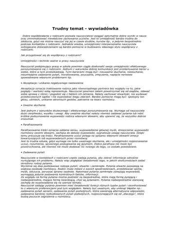 Trudny temat - wywiadówka Dobre współdziałanie z rodzicami pozwala nauczycielowi osiągać optymalnie dobre wyniki w nauce oraz zminimalizować niewłaściwe zachowania uczniów. Jest to umiejętność bardzo trudna do zdobycia, gdyż nie można nauczyć się jej w czasie studiów, kursów itp., a jedynie bezpośrednio podczas kontaktów z rodzicami. Jednakże wiedza, umiejętności interpersonalne nauczyciela wzbogacane doświadczeniami są bardzo pomocne w budowaniu własnego stylu współpracy z rodzicami. Jak przygotować się do współpracy z rodzicami? Umiejętności i techniki ważne w pracy nauczyciela Nauczyciel podejmujący pracę w szkole powinien ciągle doskonalić swoje umiejętności efektywnego porozumiewania się z rodzicami. Jednym z warunków dobrej komunikacji jest przełamywanie barier u siebie, które w tym przeszkadzają. Tymi barierami mogą być: nieuważne słuchanie, niesłuchanie, nieumiejętne zadawanie pytań, moralizowanie, pouczanie, zmęczenie, napięcie nerwowe spowodowane własnymi problemami itp. • Akceptacja i unikanie negatywnego nastawienia Akceptacja oznacza traktowanie rodzica jako równorzędnego partnera bez względu na to, jakie poglądy i wartości sobą reprezentuje. Nauczyciel powinien zatem powstrzymać się od osądów, zdawać sobie sprawę z różnic i pogodzić się z faktem ich istnienia. Należy zachować otwartość, nie wydawać przedwczesnych sądów i nie wyprzedzać biegu zdarzeń. Bardzo pomocne mogą być: spokojny ton głosu, uśmiech, unikanie obronnych gestów, patrzenie na twarz rozmówcy. • Uważne słuchanie Jest jednym z warunków skutecznego i efektywnego porozumiewania się. Wymaga od nauczyciela dużo cierpliwości, wysiłku i uwagi. Aby uważnie słuchać należy również zadawać pytania lub robić krótkie podsumowania wypowiedzi rodzica własnymi słowami, aby upewnić się, że wszystko dobrze zrozumiał. • Parafrazowanie Parafrazowanie treści oznacza oddanie sensu, wypowiedzenie głównej myśli, streszczenie wypowiedzi rozmówcy swoimi słowami, zachęca do dalszej wypowiedzi, sygnalizuje uwagę nauczyciela. Dzięki temu precyzuje się treści. Parafrazowanie uczuć polega na opisaniu własnymi słowami emocji towarzyszących lub wypowiadanych przez rozmówcę. Jest to trudna sztuka, gdyż wymaga nie tylko uważnego słuchania, ale i umiejętności rozpoznawania uczuć, rozumienia, sprawnego posługiwania się językiem. Dobra parafraza nie może być powierzchowna, ale również nie może dodawać nic nowego do tego, co zostało powiedziane. • Zadawanie pytań Nauczyciele w kontaktach z rodzicami często zadają pytania, aby zebrać informacje odnośnie nurtującego ich problemu. Należy więc pogłębiać świadomość tego, w jakich okolicznościach zadać określony rodzaj pytania. Wyróżnia się dwa podstawowe rodzaje pytań: otwarte i zamknięte. Pytania otwarte pozwalają na większą swobodę rozmówcy. Rodzic może mówić o swoich spostrzeżeniach, przedstawiać opinie, myśli, odczucia, poruszać sprawy osobiste. Natomiast pytania zamknięte zawężają wypowiedź, wymagają jedynie podawania konkretnych faktów, informacji. Ze względu na formę pytania można podzielić na bezpośrednie, które mają formę pytającą i niebezpośrednie, mające formę twierdzącą, choć są pytaniami. Pytania niebezpośrednie stanowią zachętę do wypowiadania się na szersze tematy. Nauczyciel zadając pytania powinien mieć świadomość funkcji różnych typów pytań i skonfrontować to z własnymi preferencjami pod tym względem. Należy być uważnym, aby uniknąć błędów np.: zadawania pytań seriami, zadawania pytań podwójnych, które zawierają alternatywne odpowiedzi, zadawania bardziej rozbudowanych pytań podwójnych, rozpoczynających się od „dlaczego”, które budzą poczucie zagrożenia u rozmówcy. • Odpowiedzi Oprócz wymienionych wyżej umiejętności bardzo ważny jest sposób udzielania odpowiedzi. D. W. Johnson („Podaj dłoń” Polskie Towarzystwo Psychologiczne, Warszawa 1992) wyróżnił pięć form odpowiedzi: ocenę, interpretację, wsparcie, badanie – zadawanie pytań, rozumienie – parafrazowanie. Odpowiedź oceniająca wskazuje na to, że nauczyciel ocenił powagę przedstawionego przez rodzica problemu. Gdy jest użyta właściwie pozwala rodzicowi na ogląd problemu z innej perspektywy, określenie jego rozmiaru. Musi być przekazana w sposób taktowny i niezagrażający. Lecz zastosowana niewłaściwie może dać odczuć rodzicowi, że się ośmieszył, wykazał niewiedzą, naiwnością. Odpowiedź interpretująca wskazuje na to, że nauczyciel chce wyjaśnić rodzicowi znaczenie opisanych przez niego zachowań, problemów. Aby była dla rodzica pomocna musi być sformułowana w odpowiedni sposób – niezagrażający, aby rozmówca nie czuł się upokorzony, obwiniony za problemy dziecka. Odpowiedź wspierająca to taka, której intencją jest uspokojenie rozmówcy, zmniejszenie intensywności jego negatywnych emocji, pocieszenie, okazanie współczucia. Takich odpowiedzi potrzebują najbardziej rodzice sprawiający wrażenie bezradnych, zagubionych. W kontaktach z rodzicami należy stosować wszystkie rodzaje odpowiedzi, w zależności od sytuacji. Często bardzo skuteczne okazuje się stosowanie wypowiedzi „ja”. Składa się ona z trzech części: rzeczowego opisu zachowania, z opisu bezpośrednich, niepożądanych skutków tego zachowania oraz z opisu uczuć, które dane zachowanie wywołało u osoby zgłaszającej problem. Wypowiedzi typu „ja” dają większą szansę zmiany zachowania rodzica, bo nie są zagrażające i poniżające, tak jak wypowiedzi typu „ty”. Otwartość i bezpośredniość komunikatów „ja” skłania rozmówcę do podobnej szczerości. Formy współpracy z rodzicami Spotkanie inaugurujące współpracę jest ważnym wydarzeniem zarówno dla rodziców jak i nauczyciela. Wrażenie wywarte w czasie tego spotkan