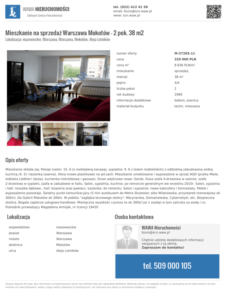 tel. (022) 412 41 50 email: [email protected] www: scn.waw.pl Mieszkanie na sprzedaż Warszawa Mokotów - 2 pok. 38 m2 Lokalizacja: mazowieckie, Warszawa, Warszawa, Mokotów, Aleja Lotników numer oferty M-27265-11 cena 329 000 PLN cena m 8 636 PLN/m2 mieszkanie sprzedaż, metraż 38 m2 piętro 4/4 liczba pokoi 2 rok budowy 1969 informacje dodatkowe balkon, piwnica materiał budynku techn. mieszana 2 Opis oferty Mieszkanie składa się; Pokoje (salon: 15. 6 (z rozkładaną kanapą), sypialnia: 9. 6 z łożem małżeńskim) z oddzielną zabudowaną widną kuchnią (4. 5) i łazienką (wanna). Okna (nowe plastikowe) na pd-zach. Mieszkanie umeblowane i wyposażone w sprzęt AGD (pralka Miele, lodówka Liebherr (duża), kuchenka mikrofalowa i gazowa). Drzwi wejściowe nowe: Gerda. Duża szafa 4-drzwiowa w salonie, szafa 2-drzwiowa w sypialni, szafa w zabudowie w hallu. Salon, sypialnia, kuchnia: po remoncie generalnym we wrześniu 2010r. Salon, sypialnia i hall: mozaika dębowa , hall: boazeria oraz pawlacz. Łazienka: do remontu. Salon i sypialnia: nowe kaloryfery i termostaty. Meble i wyposażenie pozostaje. Świetny punkt komunikacyjny (5 min autobusem do Metra Służewiec albo Wilanowska; przystanek tramwajowy ok 300m). Do Galerii Mokotów ok 300m. W pobliżu "zagłębia biurowego stolicy": Marynarska, Domaniewska, Cybernetyki, etc. Bezpieczna okolica. Bogate zaplecze usługowo-handlowe. Miesięczna wysokość czynszu to ok 300zł (za 1 osobę) w tym zaliczka za wodę i co. Pośrednik prowadzący Magdalena Armijak, nr licencji 19420 Lokalizacja Osoba kontaktowa WAWA Nieruchomości województwo mazowieckie powiat Warszawa [email protected] miasto Warszawa dzielnica Mokotów ulica Aleja Lotników Chętnie udzielę dodatkowych informacji związanych z tą ofertą. Zapraszam do kontaktu! tel. 509 000 105 Zawsze dążymy do tego, aby informacje o proponowanych przez nas ofertach były jak najbardziej dokładne. Niekiedy jednak, ze względu na fakt, iż uzyskujemy je od osób trzecich nie jest możliwe ich zweryfikowanie, wobec czego należy traktować je orientacyjnie i nie stanowią one oferty w rozumieniu kodeksu cywilnego.