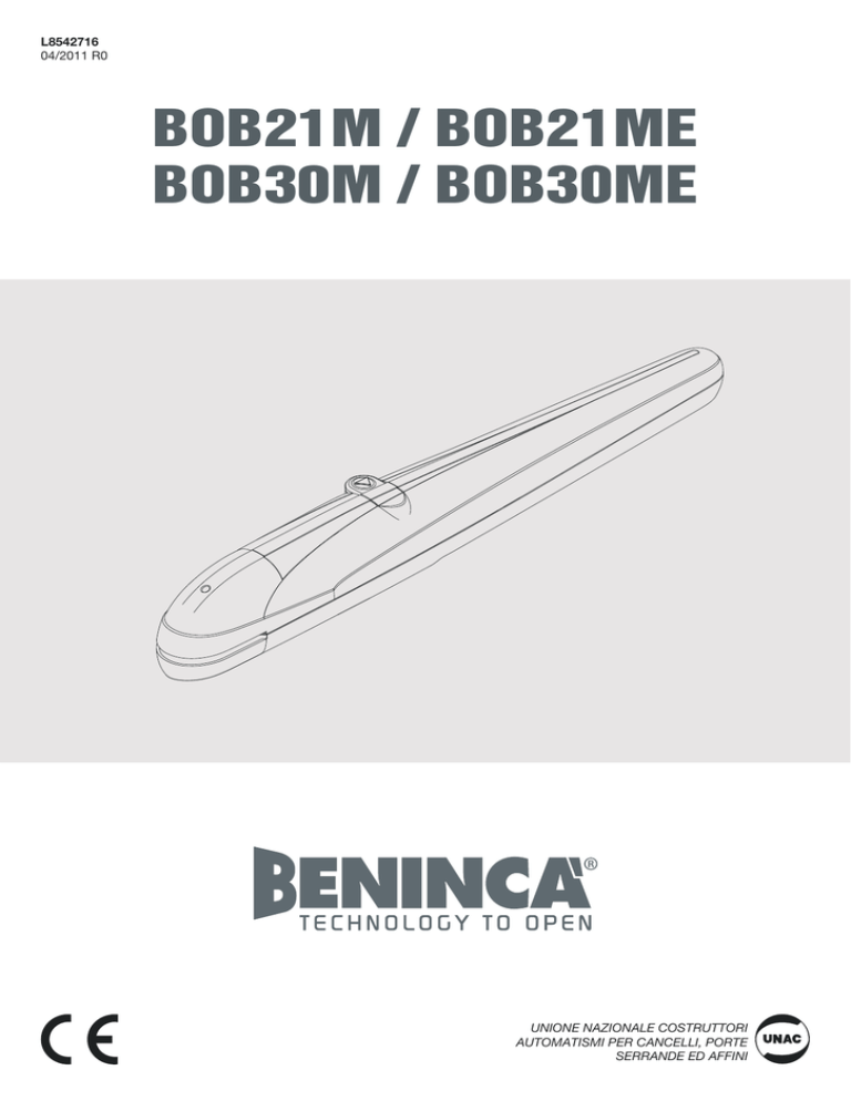 L8542716 04/2011 R0 BOB21M / BOB21ME BOB30M / BOB30ME UNIONE NAZIONALE COSTRUTTORI AUTOMATISMI PER CANCELLI, PORTE SERRANDE ED AFFINI Dimensioni d’ingombro / Overall dimensions / Abmessungen Dimensions d’encombrement / Dimensiones exteriores / Wymiary gabarytowe 796 107 62 132 47,5 270 Mettere a livello. Level. Nivellieren. Mettre de niveau. Nivelar. Ustawić na wysokości Corsa. Stroke. Hub. Course. Carrera. Posuw. Interasse ancoraggi. Distance between axes of anchoring bolts. Die maximale Öffnung der Verankerungen. Entraxe ancrages. Distancia entre ejes ancrajes. Współośowość elementów mocujących. 660 88 Lunghezza max. anta / Max. wing length / Max. Flügellänge Longueur max. porte / Longitud máx. hoja / Dł. max skrzydła bramy BOB21M - BOB 21ME BOB30M - BOB 30ME Lunghezza anta Door leaf width Flügellänge Longueur porte Longitud hoja Dł. skrzydła (m) Peso anta Door leaf weight Türflügelgewicht Poids porte Peso hoja Ciężar skrzydła (kg) Lunghezza anta Door leaf width Flügellänge Longueur porte Longitud hoja Dł. skrzydła (m) Peso anta Door leaf weight Türflügelgewicht Poids porte Peso hoja Ciężar skrzydła (kg) 1 1,5 2 2,1 -- 300 250 215 200 -- 1,0 1,5 2,0 2,5 3,0 400 350 300 250 200 1 Arresto in apertura. Stop when opening. Endanschlag zur Öffnung. Arrêt en ouverture. Tope en apertura. Chwytak blokujący podczas otwierania. Arresto in chiusura. Stop when closing. Endanschlag zur Schließung. Arrêt en fermeture. Tope de cierre. Chwytak blokujący podczas zamykania. 3 X 2 K M Z Y P S X Fig.2 - A M Y 90° 110° max Apertura max Max Opening Max. Öffung Ouverture max Abiertura max. X Y Z K M* max. Tempo apertura Opening time Öffungszeit Temps d'ouverture Tiempo de abiertura Prędkość kątowa (90°) 110° 115 105 80 545 50 15" 100° 120 120 80 540 70 16" 90° 135 135 80 525 80 19" 3 V B P V B 4 4 F C T Saldare. Weld. Anschweißen. Souder. Soldar. Spawać Rosetta 10x30. Washer 10x30. Unterlegscheibe 10x30. Rondelle 10x30. Arandela 10x30. Podkładka 10x30. Grasso Grease Fett Graisse Grasa Smar P L D Mettere a livello. Level. Nivellieren. Mettre de niveau. Nivelar. Ustawić na wysokości S Saldare. Weld. Anschweißen. Souder. Soldar. Spawać. R V 5 Posizione 2 (PG11) Position 2 (PG11) Position 2 (PG11) Position 2 (PG11) Posición 2 (PG11) Pozycja 2 (PG11) Posizione 1 (PG13,5) Position 1 (PG13,5) Position 1 (PG13,5) Position 1 (PG13,5) Posición 1 (PG13,5) Pozycja 1 (PG13,5) V P 5 6 7 4 1 2 3 1 2 3 4 5 6 BOB 21M / BOB 30M BOB 21ME / BOB 30ME BOB 21M / BOB 30M 1 Marcia motore e condensatore. Motor gear and capacitor. Motorgang und kondensator. Marche moteur et condensateur. Marcha motor y condensador. Bieg silnika i praca kondensatora 2 COM COM COM COM COM COM 3 Marcia motore e condensatore. Motor gear and capacitor. Motorgang und kondensator. Marche moteur et condensateur. Marcha motor y condensador. Bieg silnika i praca kondensatora 4 GND GND GND GND GND GND BOB 21ME / BOB 30ME 6 1 Marcia motore e condensatore. Motor gear and capacitor. Motorgang und kondensator. Marche moteur et condensateur. Marcha motor y condensador. Bieg silnika i praca kondensatora 2 COM COM COM COM COM COM 3 Marcia motore e condensatore. Motor gear and capacitor. Motorgang und kondensator. Marche moteur et condensateur. Marcha motor y condensador. Bieg silnika i praca kondensatora 4 Segnale ENCODER ENCODER signal ENCODER-Signal Signal ENCODEUR Señal ENCODER Sygnał ENKODERA 5 Positivo ENCODER ENCODER positive ENCODER Pluspol Positif ENCODEUR Positivo ENCODER Dodatni ENKODERA 6 Negativo ENCODER ENCODER negative ENCODER Minuspol Négatif ENCODER Negativo ENCODER Ujemny ENKODERA 7 GND GND GND GND GND GND Collegamenti elettrici / Wire diagram / Elektrische Anschlüsse Branchements électriques / Conexiones eléctricas / Połączenia elektryczne 5 3 2x1,5 2x1 RG 58 4 1 2x 1,5 4x 2 1 N.B.: Tenere separati i cavi di potenza da quelli ausiliari. N.B.: The power cables must be kept separated from the auxiliary cables. Wichtig: Leistungskabel von Hilfskabeln getrennt halten. 1 N.B.: Séparer les câbles de puissance des câbles auxiliaires. N.B.: Tener separados los cables de potencia de los auxiliares. Uwaga: należy trzymać w oddali przewody zasilania od przewodów pomocniczych. 1,5 4x 1 4x 2 n mi 1,5 ac x 3 0V 23 6 Legenda: 1 Motoriduttore 2 Fotocellule 3 Selettore a chiave (da esterno) o tastiera digitale 4 Lampeggiante 5 Antenna 6 Centrale elettronica. Légende: 1 Moteur-réducteur 2 Photocellule 3 Selecteur à clé (d’extérieur) ou clavier digital 4 Clignotant 5 Antenne 6 Centrale électronique. Legenda: 1 Motoreducer 2 Photo-electric cells 3 Key selector (external) or digital keyboard 4 Flash-light 5 Antenna 6 Electronic board. Leyenda: 1 Motorreductor 2 Fotocélulas 3 Selectores a llave (de superficie). 4 Relampagueador. 5 Antena 6 Central electrónica. Zeichenerklärung: 1 Getriebemotor 2 Fotozelle 3 Schlüssel-Selektor (außenliegend) oder Digital-Tastatur 4 Blinker 5 Antenne 6 Elektroschrank. Objaśnienia: 1 Siłownik 2 Fotokomórki 3 Przełącznik kluczowy (zewnętrzny) lub panel z przyciskami 4 Światło migające 5 Antena 6 Centralka elektroniczna. 7 Dichiarazione CE di conformità Fabbricante: Automatismi Benincà SpA. Indirizzo: Via Capitello, 45 - 36066 Sandrigo (VI) - Italia Dichiara che: l’automazione per cancelli battenti modelli BOB21M / BOB21ME / BOB30M / BOB30ME. è conforme alle condizioni delle seguenti altre Direttive CE: - DIRETTIVA 2004/108/CE DEL PARLAMENTO EUROPEO E DEL CONSIGLIO del 15 dicembre 2004 concernente il ravvicinamento delle legislazioni degli Stati membri relative alla compatibilità elettromagnetica e che abroga la direttiva 89/336/CEE, secondo le seguenti norme armonizzate: EN 61000-6-2:2005, EN 61000-6-3:2007. - DIRETTIVA 2006/95/CE DEL PARLAMENTO EUROPEO E DEL CONSIGLIO del 12 dicembre 2006 concernente il ravvicinamento delle legislazioni degli Stati membri relative al materiale elettrico destinato ad essere adoperato entro taluni limiti di 
